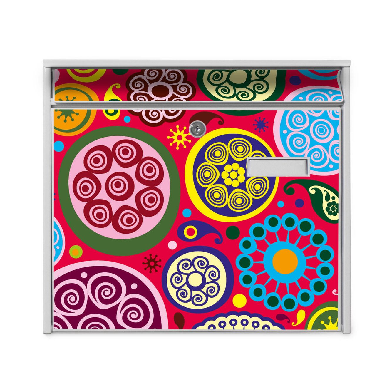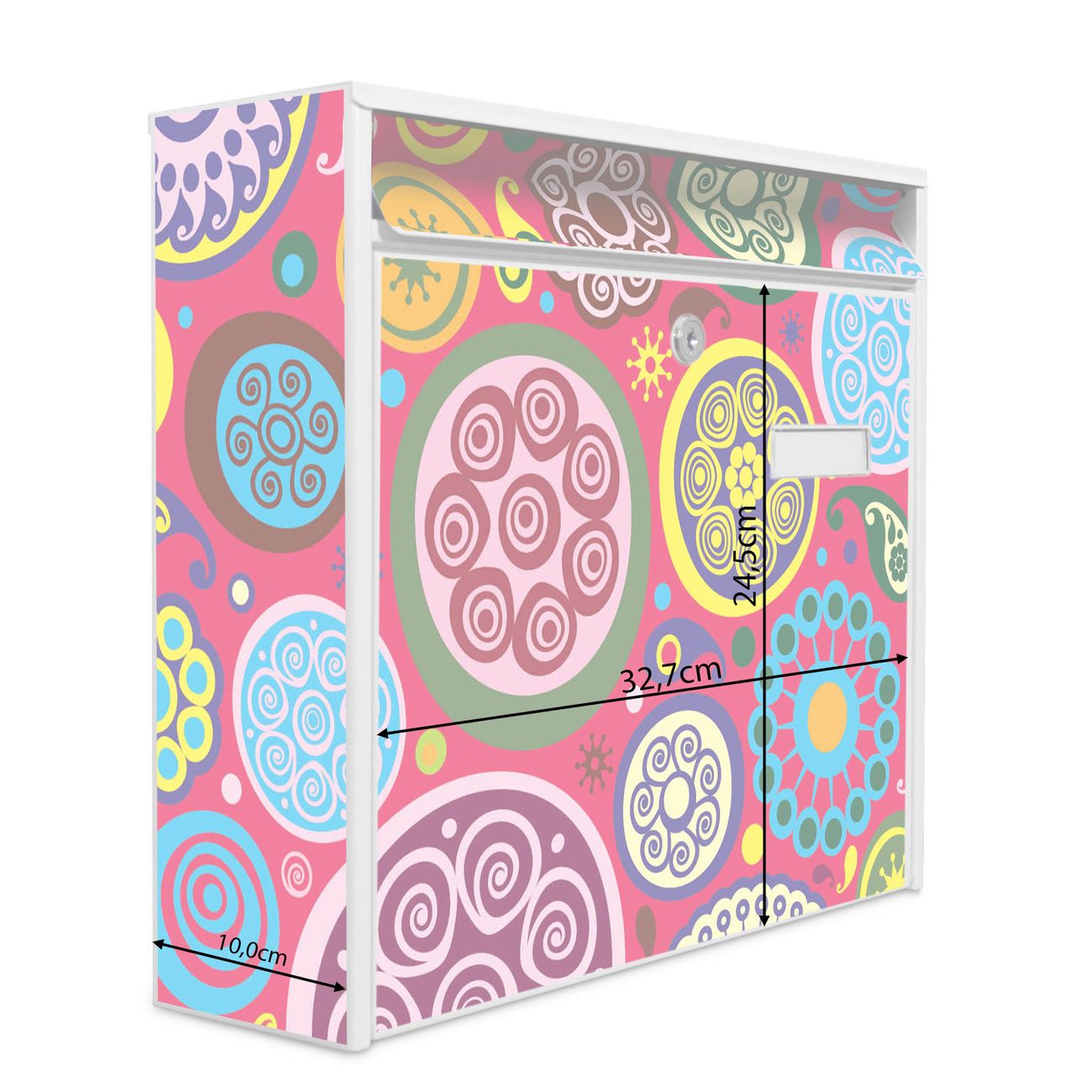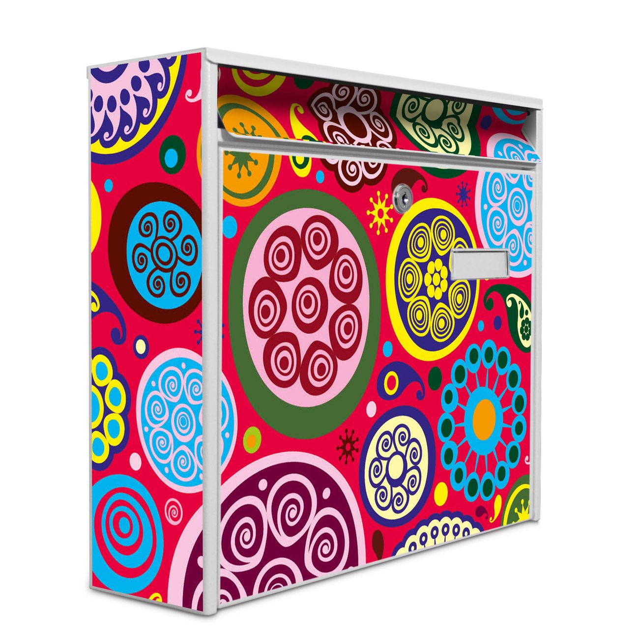 Der Burg Wächter Mail Briefkasten mit Motiv Retro Kreise bietet Ihnen mit seinem Fassungsvermögen genügend Platz auch für große A4 Sendungen. Auf Wunsch können Sie bei uns den passenden Standfuß kaufen und so aus dem Wandbriefkasten einen Standbriefkasten machen. Wir bieten Ihnen ebenfalls Namensschilder, bereits beschriftet oder frei zu beschriften, und verschiedene selbst gestaltete Bitte-Keine-Werbung-Aufkleber.