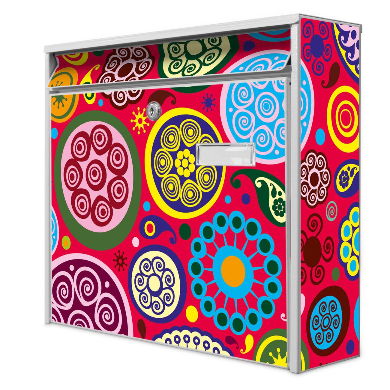 Der Postkasten mit Motiv Retro Kreise hat ein sehr ansprechendes und zeitloses Design. Heben Sie Sich von der tristen grauen Masse ab, ohne auf Funktionalität zu verzichten. Die weite Öffnung ohne scharfe Kanten ermöglicht eine einfache Handhabung beim Entnehmen der Post. Die Größe bietet genügend Platz für Sendungen aller Art, der Einwurf fasst auch größere A4 Sendungen. Ihr Burg-Wächter Motivbriefkasten wird in Sachsen in einer kleinen Manufaktur von Hand veredelt. Die Motivfolie ist lösungsmittelfrei und schutzlaminiert, dies sorgt für einen langen Halt. Wir legen großen Wert auf die Verbindung von Funktionalität und Design.