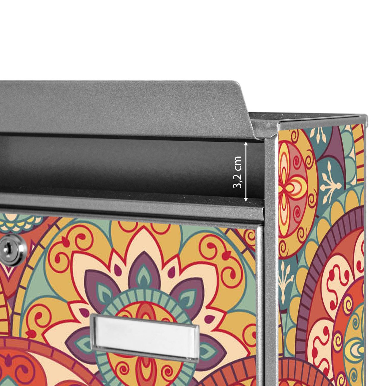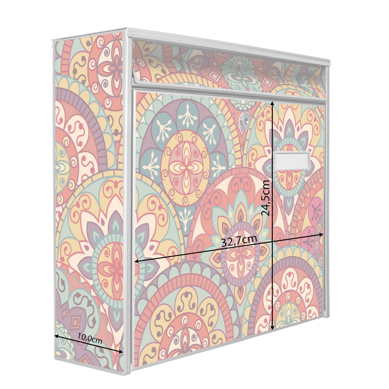 Die Größe des Briefkastens ist 36 x 32 x 10cm (BxHxT) groß. Das Motiv besteht aus einer wetter- und UV-festen Folie, die mit einem Schutzlaminat überzogen ist und Ihren Briefkasten zusätzlich vor Kratzern schützt. Sie erhalten 2 Schlüssel sowie das Montagematerial.