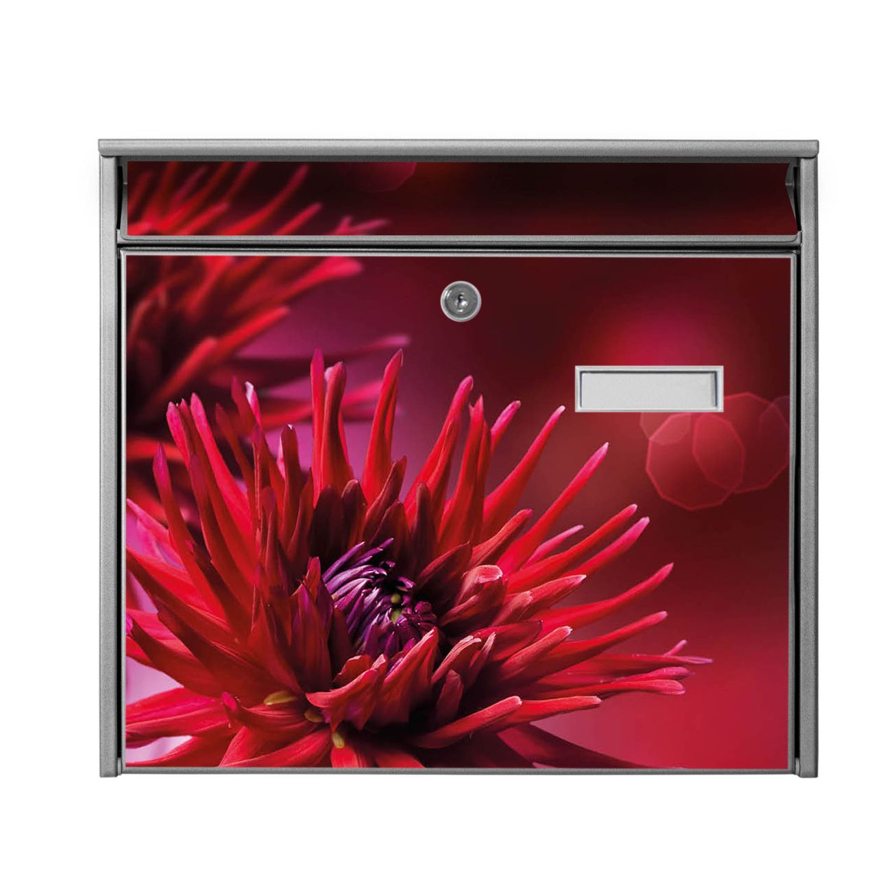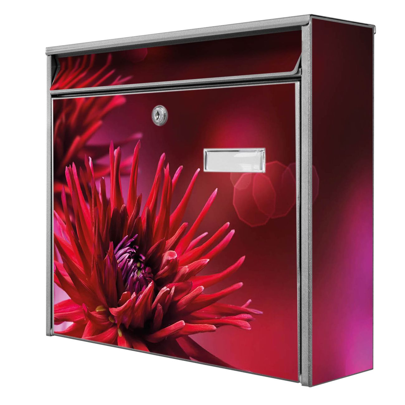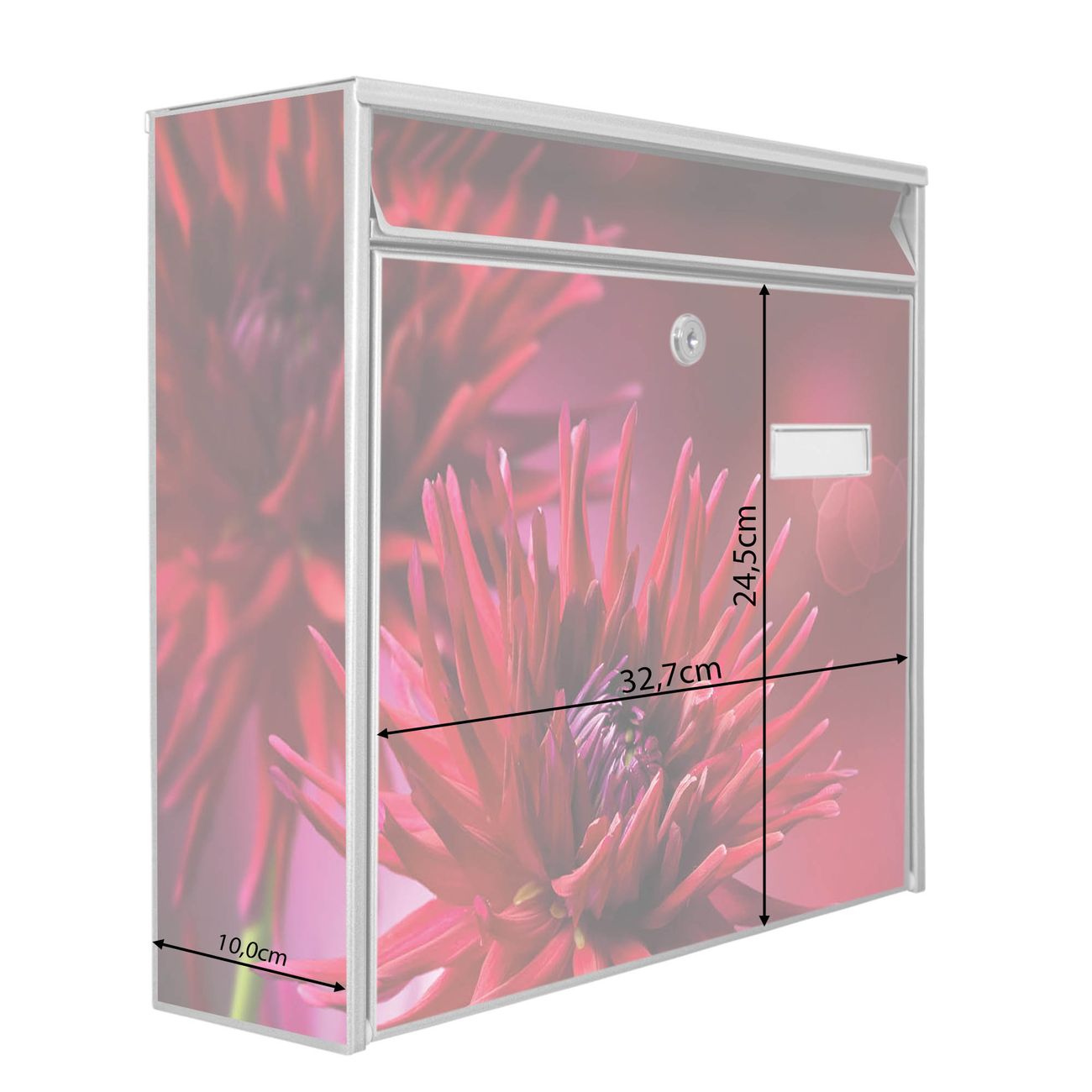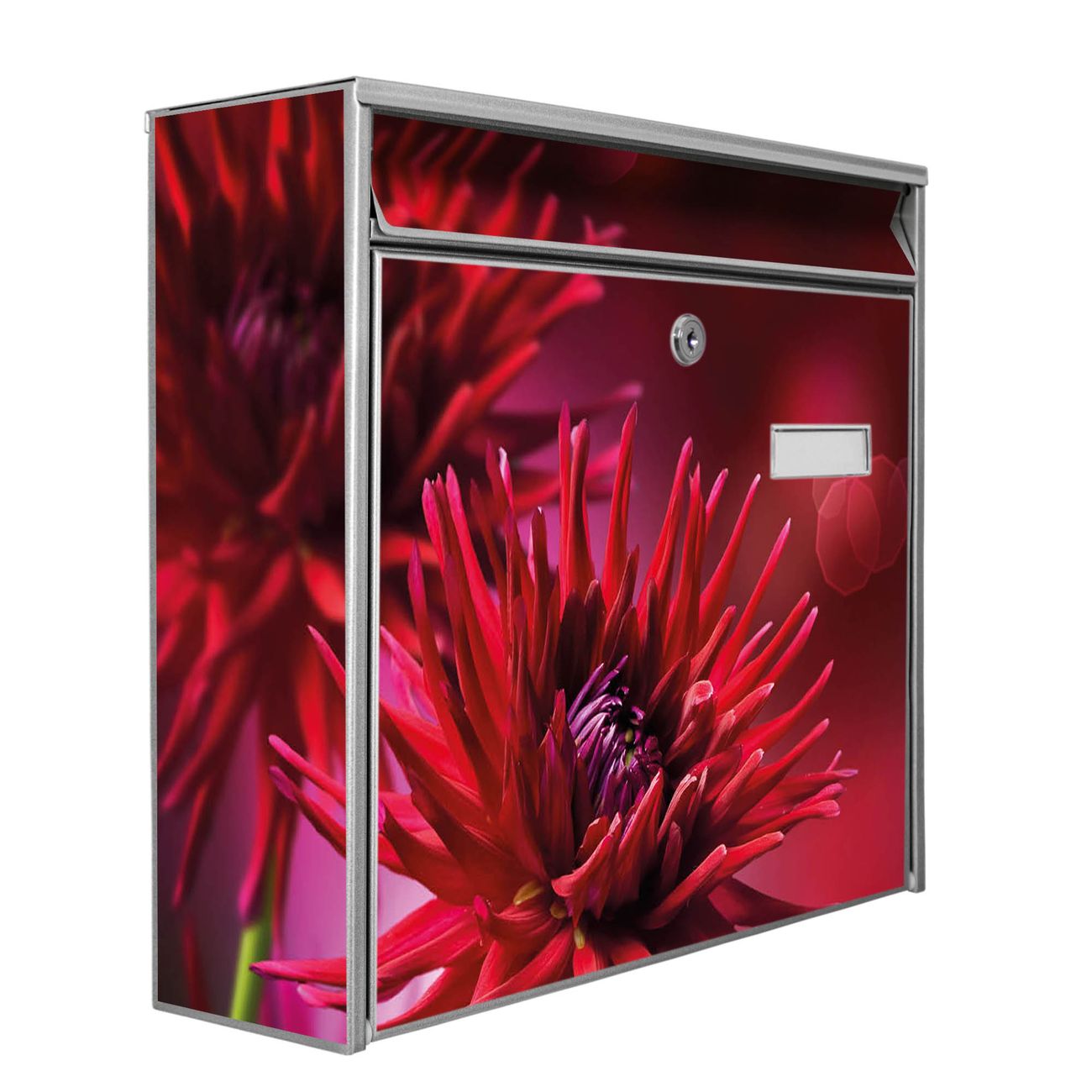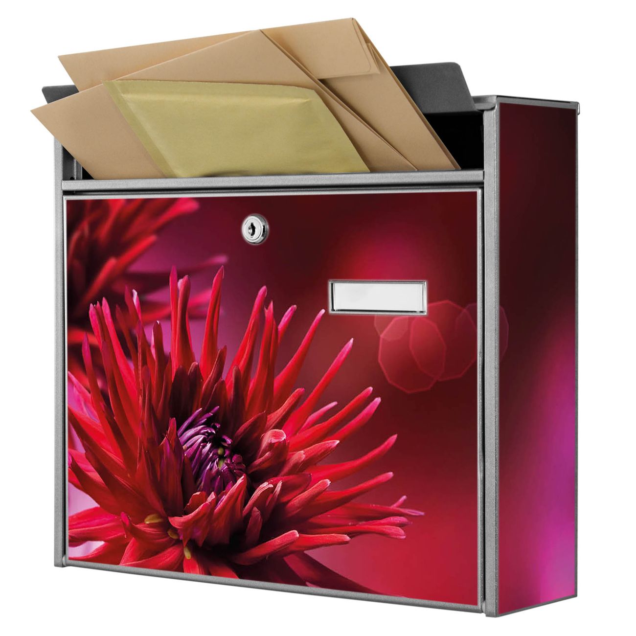 Der Burg Wächter Mail Briefkasten mit Motiv Rote Dahlien bietet Ihnen mit seinem Fassungsvermögen genügend Platz auch für große A4 Sendungen. Auf Wunsch können Sie bei uns den passenden Standfuß kaufen und so aus dem Wandbriefkasten einen Standbriefkasten machen. Wir bieten Ihnen ebenfalls Namensschilder, bereits beschriftet oder frei zu beschriften, und verschiedene selbst gestaltete Bitte-Keine-Werbung-Aufkleber.