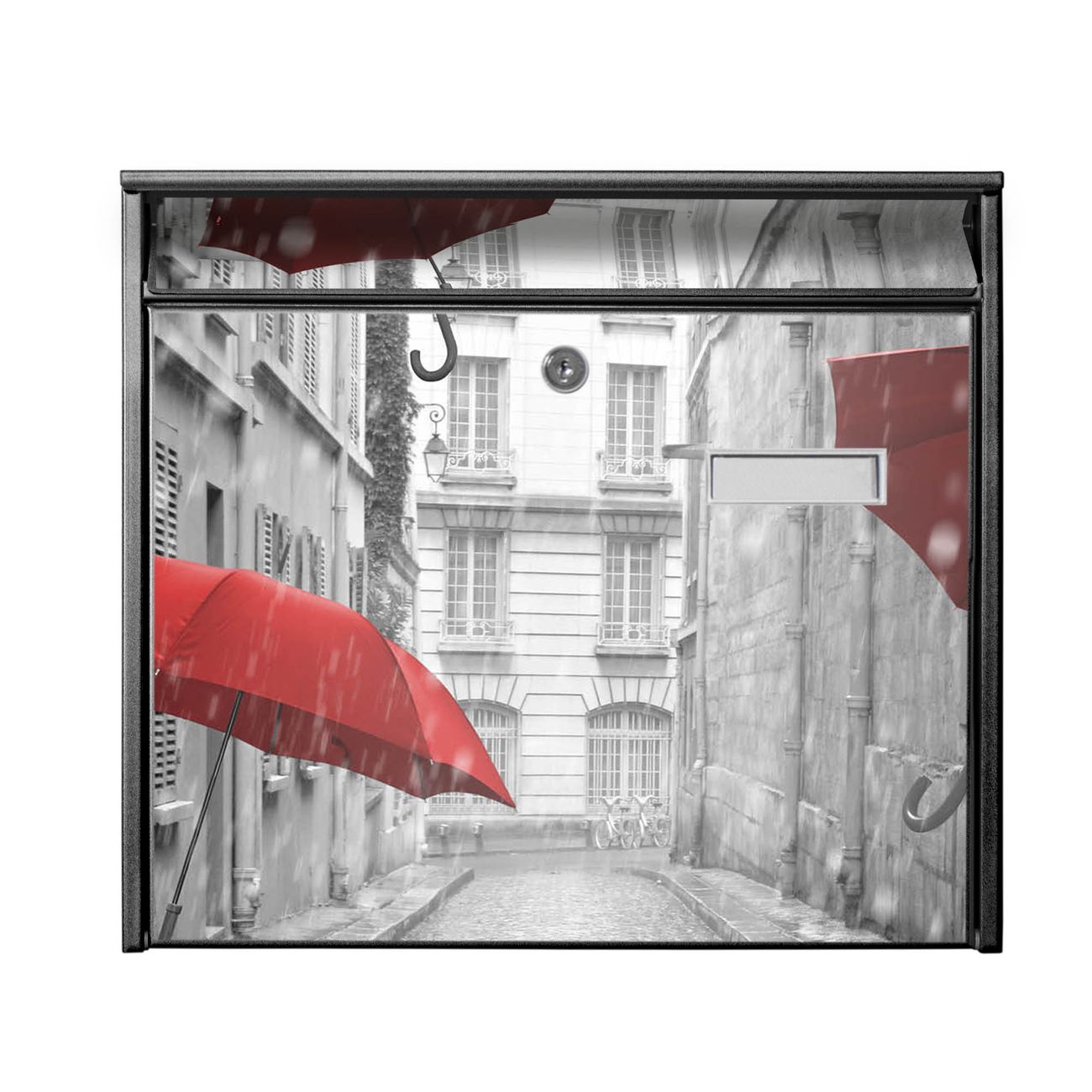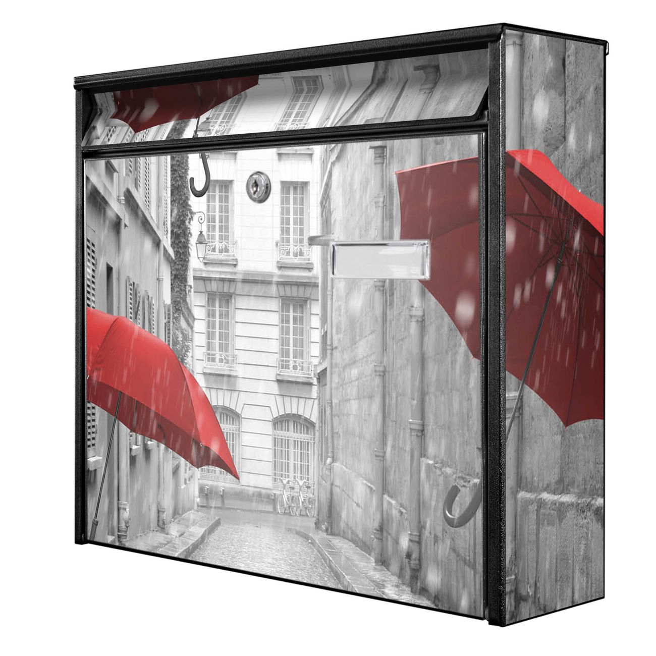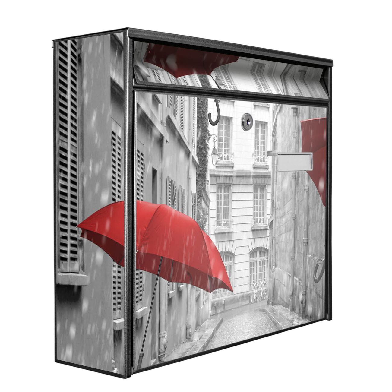 Der Postkasten mit Motiv Rote Schirme hat ein sehr ansprechendes und zeitloses Design. Heben Sie Sich von der tristen grauen Masse ab, ohne auf Funktionalität zu verzichten. Die weite Öffnung ohne scharfe Kanten ermöglicht eine einfache Handhabung beim Entnehmen der Post. Die Größe bietet genügend Platz für Sendungen aller Art, der Einwurf fasst auch größere A4 Sendungen. Ihr Burg-Wächter Motivbriefkasten wird in Sachsen in einer kleinen Manufaktur von Hand veredelt. Die Motivfolie ist lösungsmittelfrei und schutzlaminiert, dies sorgt für einen langen Halt. Wir legen großen Wert auf die Verbindung von Funktionalität und Design.