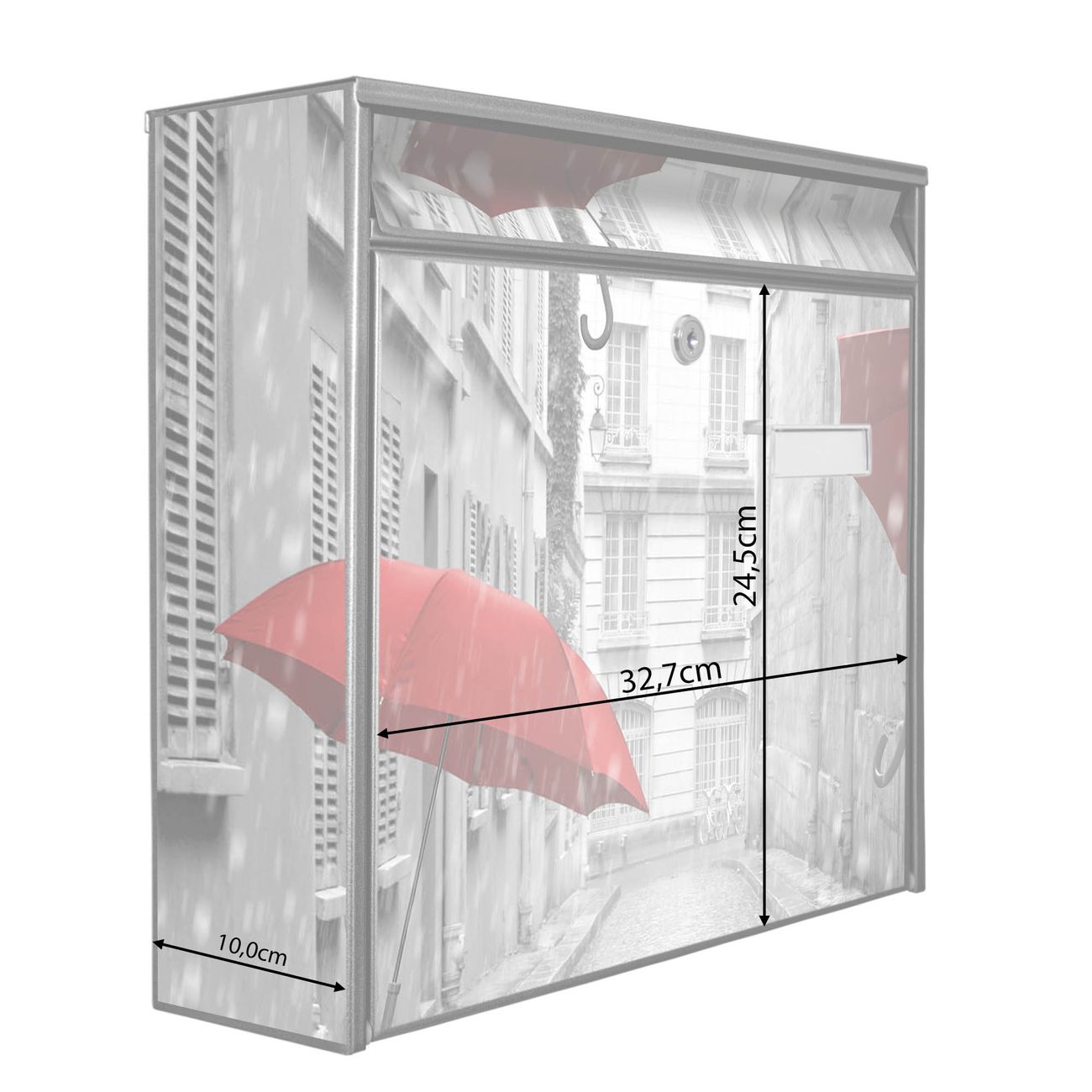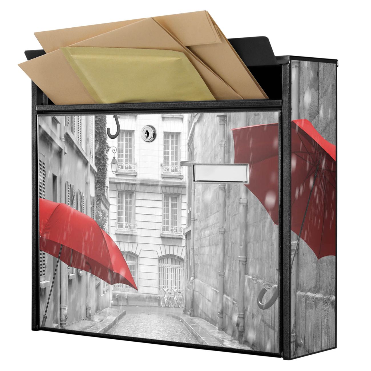 Der Burg Wächter Mail Briefkasten mit Motiv Rote Schirme bietet Ihnen mit seinem Fassungsvermögen genügend Platz auch für große A4 Sendungen. Auf Wunsch können Sie bei uns den passenden Standfuß kaufen und so aus dem Wandbriefkasten einen Standbriefkasten machen. Wir bieten Ihnen ebenfalls Namensschilder, bereits beschriftet oder frei zu beschriften, und verschiedene selbst gestaltete Bitte-Keine-Werbung-Aufkleber.