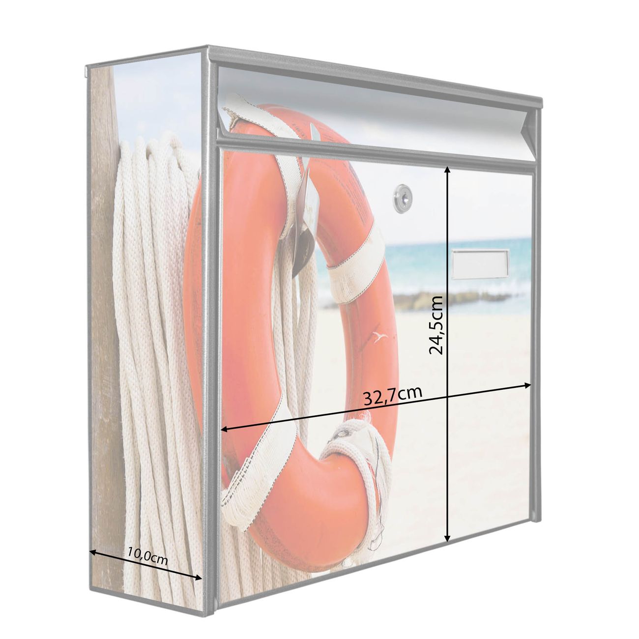 Der Burg Wächter Mail Briefkasten mit Motiv Roter Rettungsring bietet Ihnen mit seinem Fassungsvermögen genügend Platz auch für große A4 Sendungen. Auf Wunsch können Sie bei uns den passenden Standfuß kaufen und so aus dem Wandbriefkasten einen Standbriefkasten machen. Wir bieten Ihnen ebenfalls Namensschilder, bereits beschriftet oder frei zu beschriften, und verschiedene selbst gestaltete Bitte-Keine-Werbung-Aufkleber.
