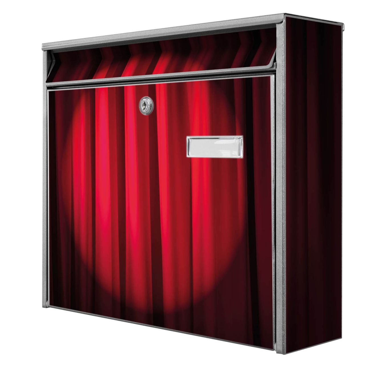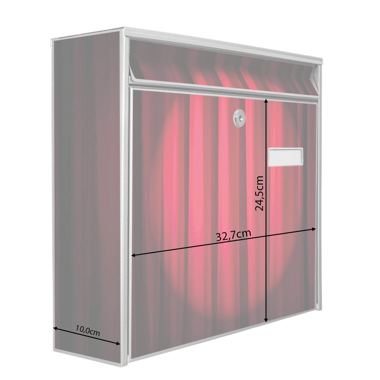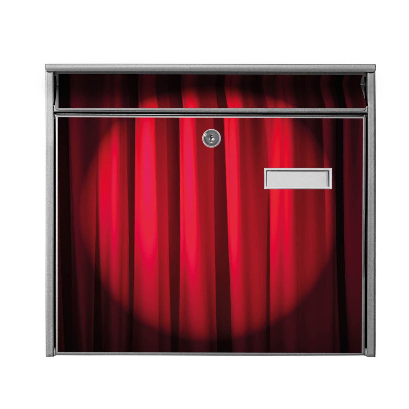 Der Burg Wächter Mail Briefkasten mit Motiv Roter Vorhang bietet Ihnen mit seinem Fassungsvermögen genügend Platz auch für große A4 Sendungen. Auf Wunsch können Sie bei uns den passenden Standfuß kaufen und so aus dem Wandbriefkasten einen Standbriefkasten machen. Wir bieten Ihnen ebenfalls Namensschilder, bereits beschriftet oder frei zu beschriften, und verschiedene selbst gestaltete Bitte-Keine-Werbung-Aufkleber.