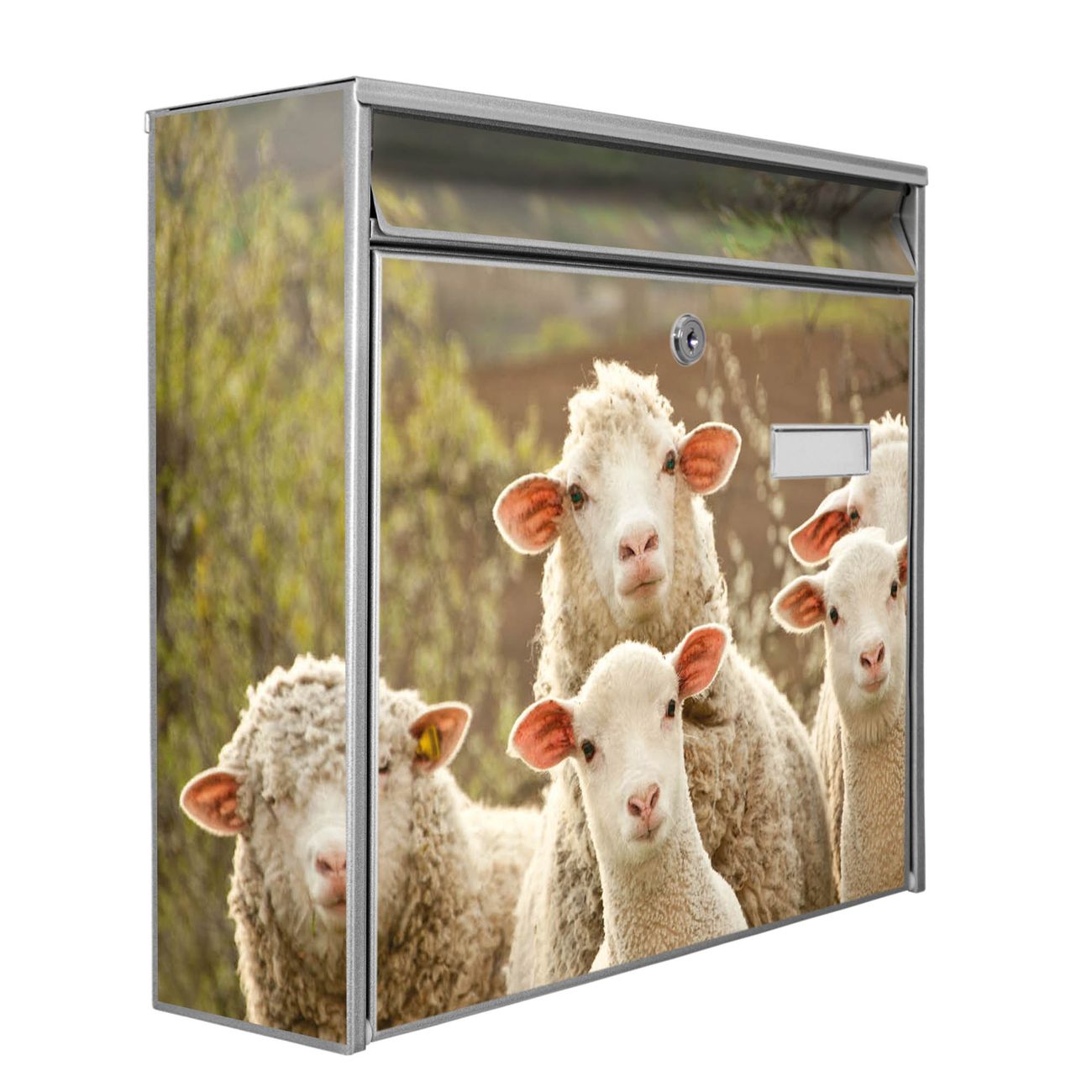 Der Postkasten mit Motiv Schaffamilie hat ein sehr ansprechendes und zeitloses Design. Heben Sie Sich von der tristen grauen Masse ab, ohne auf Funktionalität zu verzichten. Die weite Öffnung ohne scharfe Kanten ermöglicht eine einfache Handhabung beim Entnehmen der Post. Die Größe bietet genügend Platz für Sendungen aller Art, der Einwurf fasst auch größere A4 Sendungen. Ihr Burg-Wächter Motivbriefkasten wird in Sachsen in einer kleinen Manufaktur von Hand veredelt. Die Motivfolie ist lösungsmittelfrei und schutzlaminiert, dies sorgt für einen langen Halt. Wir legen großen Wert auf die Verbindung von Funktionalität und Design.