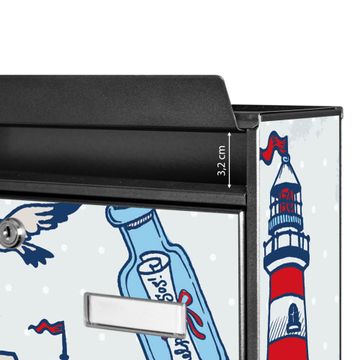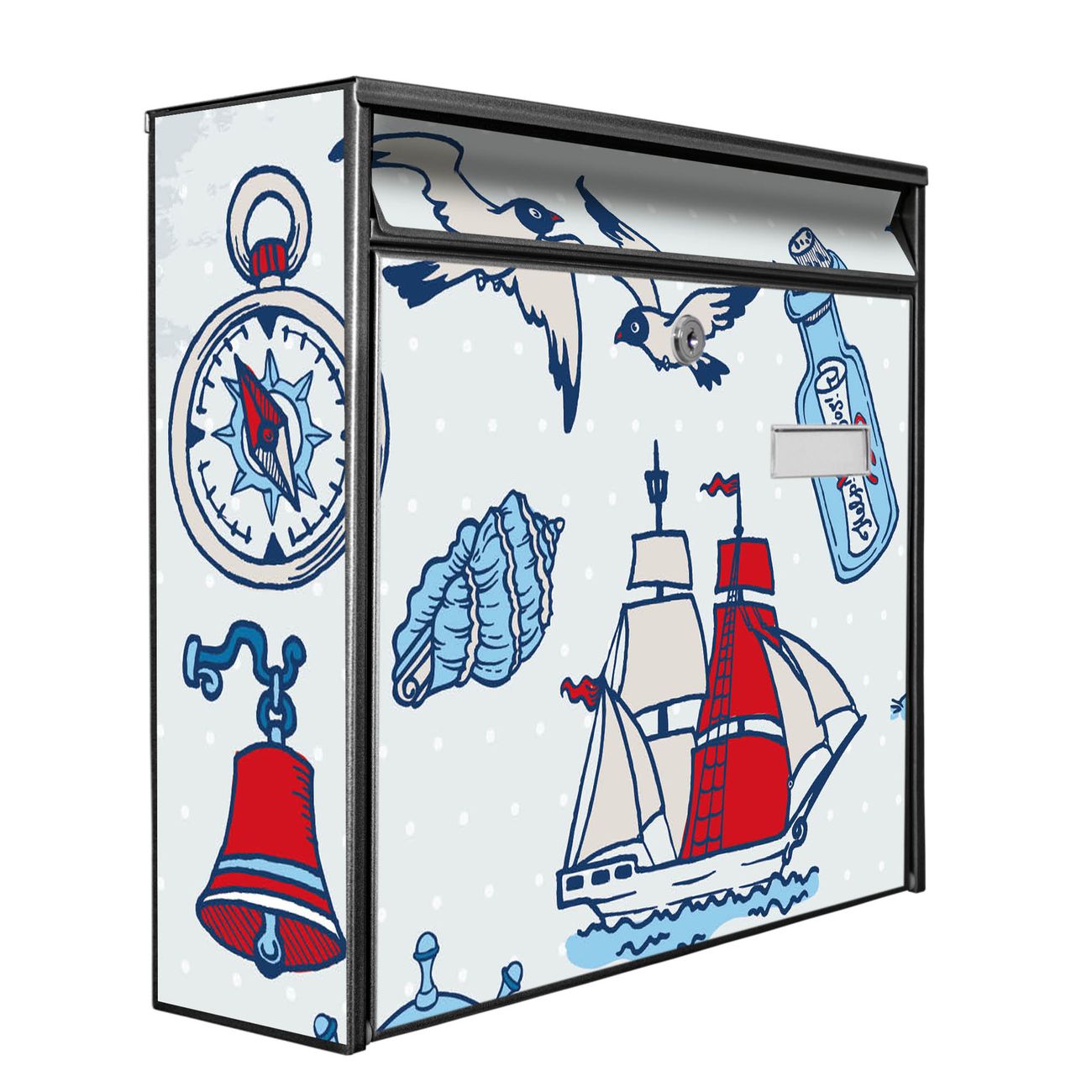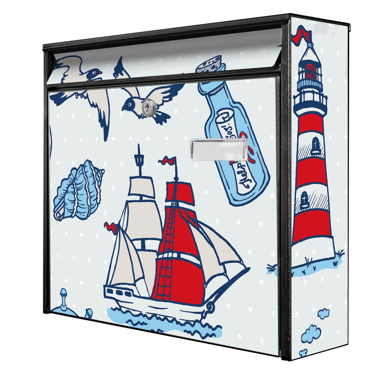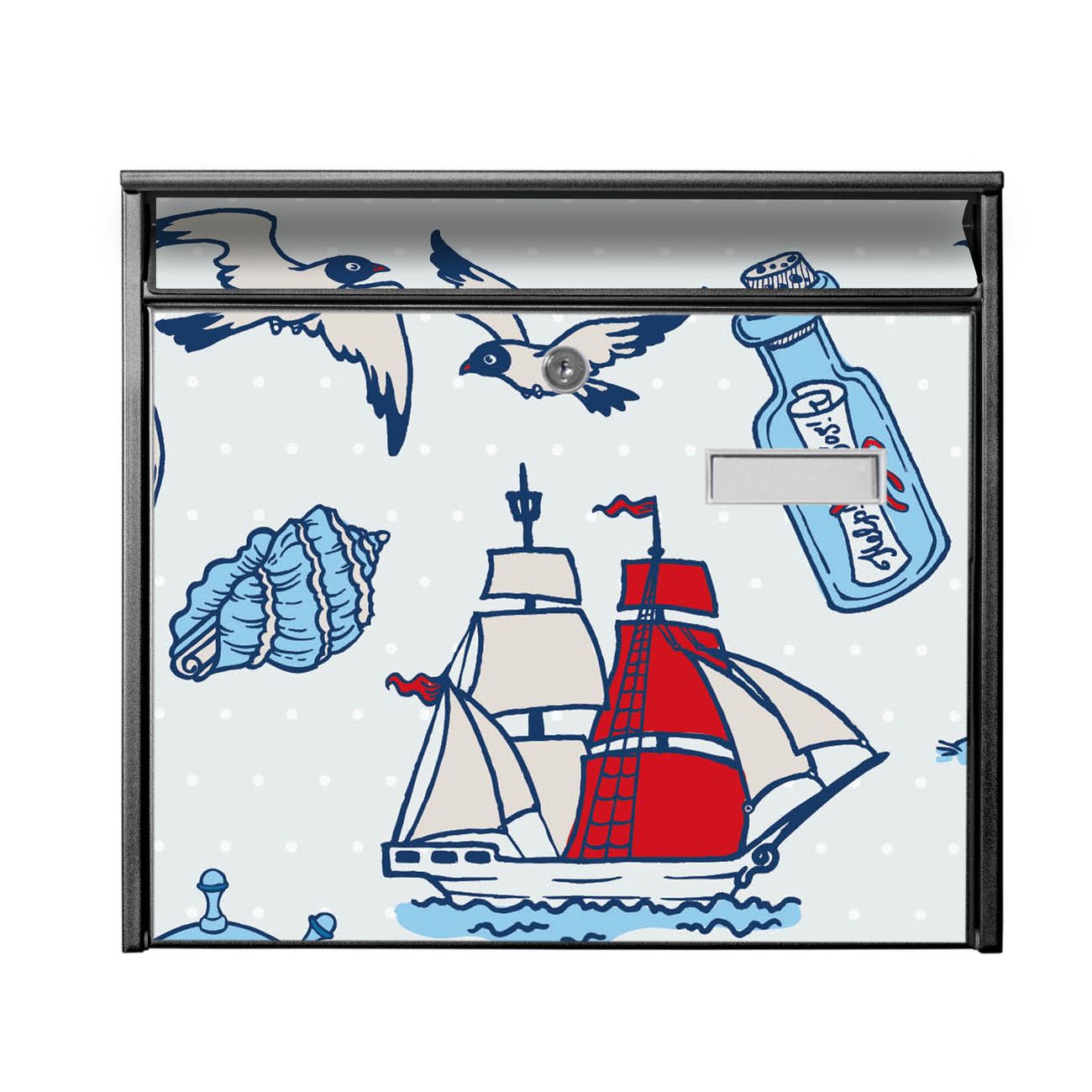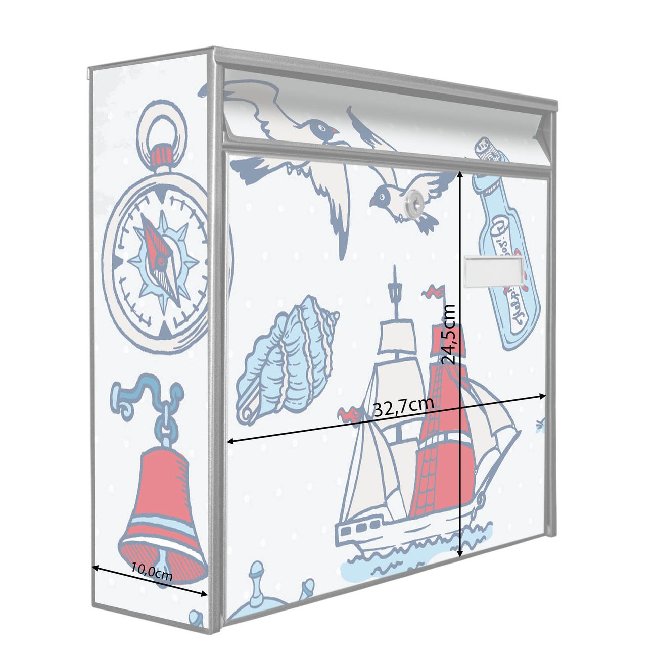 Der Burg Wächter Mail Briefkasten mit Motiv Schiff Ahoj bietet Ihnen mit seinem Fassungsvermögen genügend Platz auch für große A4 Sendungen. Auf Wunsch können Sie bei uns den passenden Standfuß kaufen und so aus dem Wandbriefkasten einen Standbriefkasten machen. Wir bieten Ihnen ebenfalls Namensschilder, bereits beschriftet oder frei zu beschriften, und verschiedene selbst gestaltete Bitte-Keine-Werbung-Aufkleber.