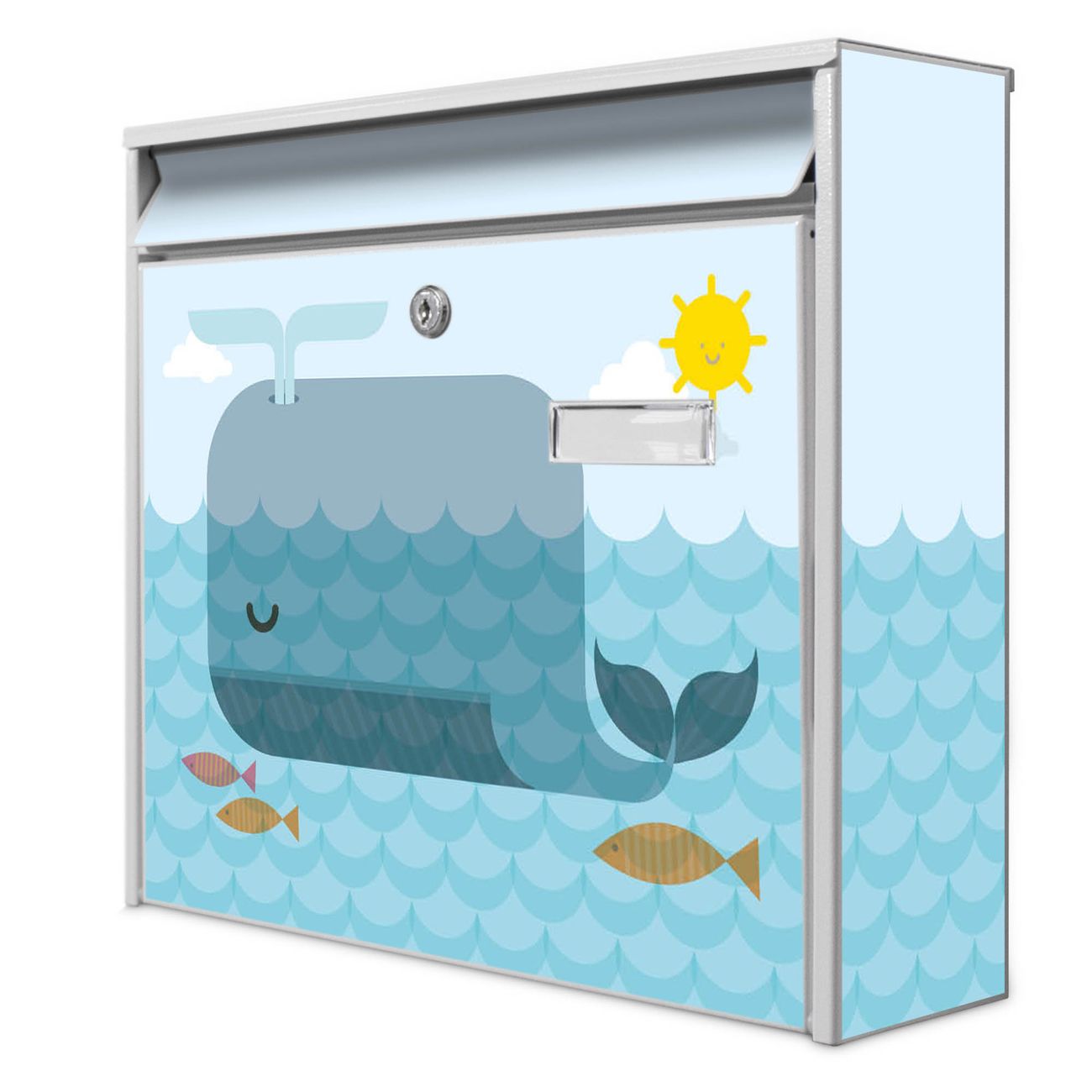 Der Postkasten mit Motiv Schlafender Wal hat ein sehr ansprechendes und zeitloses Design. Heben Sie Sich von der tristen grauen Masse ab, ohne auf Funktionalität zu verzichten. Die weite Öffnung ohne scharfe Kanten ermöglicht eine einfache Handhabung beim Entnehmen der Post. Die Größe bietet genügend Platz für Sendungen aller Art, der Einwurf fasst auch größere A4 Sendungen. Ihr Burg-Wächter Motivbriefkasten wird in Sachsen in einer kleinen Manufaktur von Hand veredelt. Die Motivfolie ist lösungsmittelfrei und schutzlaminiert, dies sorgt für einen langen Halt. Wir legen großen Wert auf die Verbindung von Funktionalität und Design.