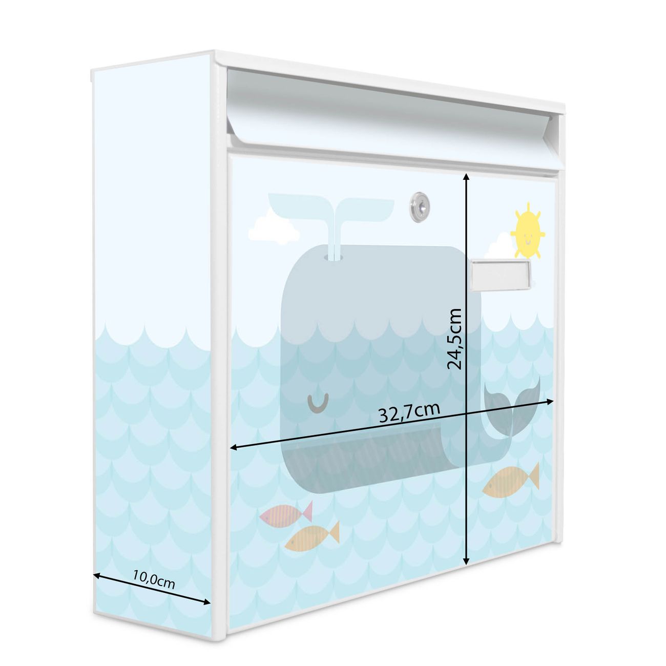 Der Burg Wächter Mail Briefkasten mit Motiv Schlafender Wal bietet Ihnen mit seinem Fassungsvermögen genügend Platz auch für große A4 Sendungen. Auf Wunsch können Sie bei uns den passenden Standfuß kaufen und so aus dem Wandbriefkasten einen Standbriefkasten machen. Wir bieten Ihnen ebenfalls Namensschilder, bereits beschriftet oder frei zu beschriften, und verschiedene selbst gestaltete Bitte-Keine-Werbung-Aufkleber.