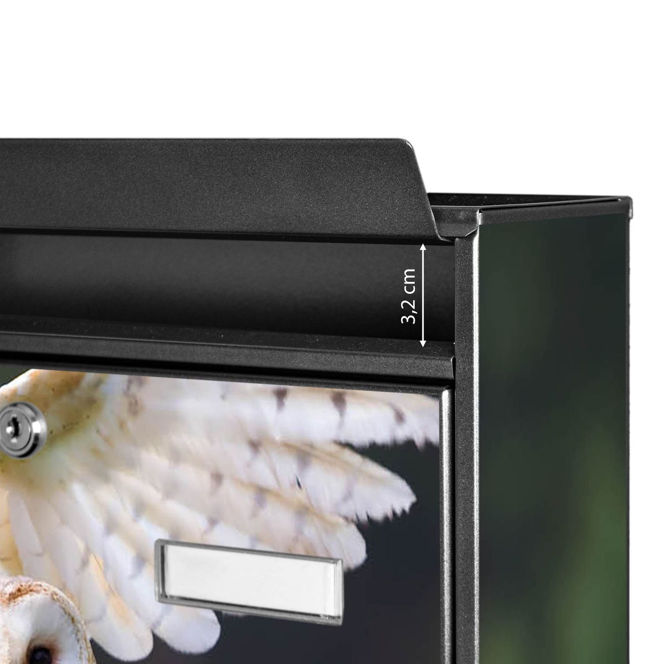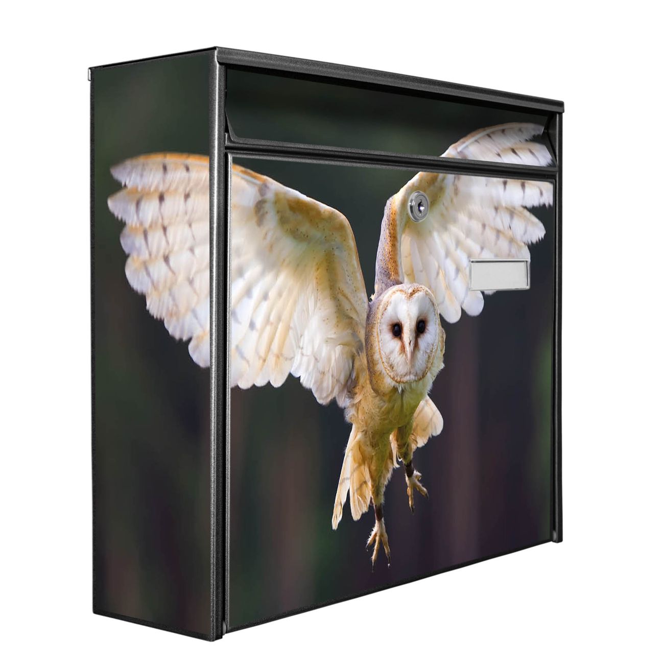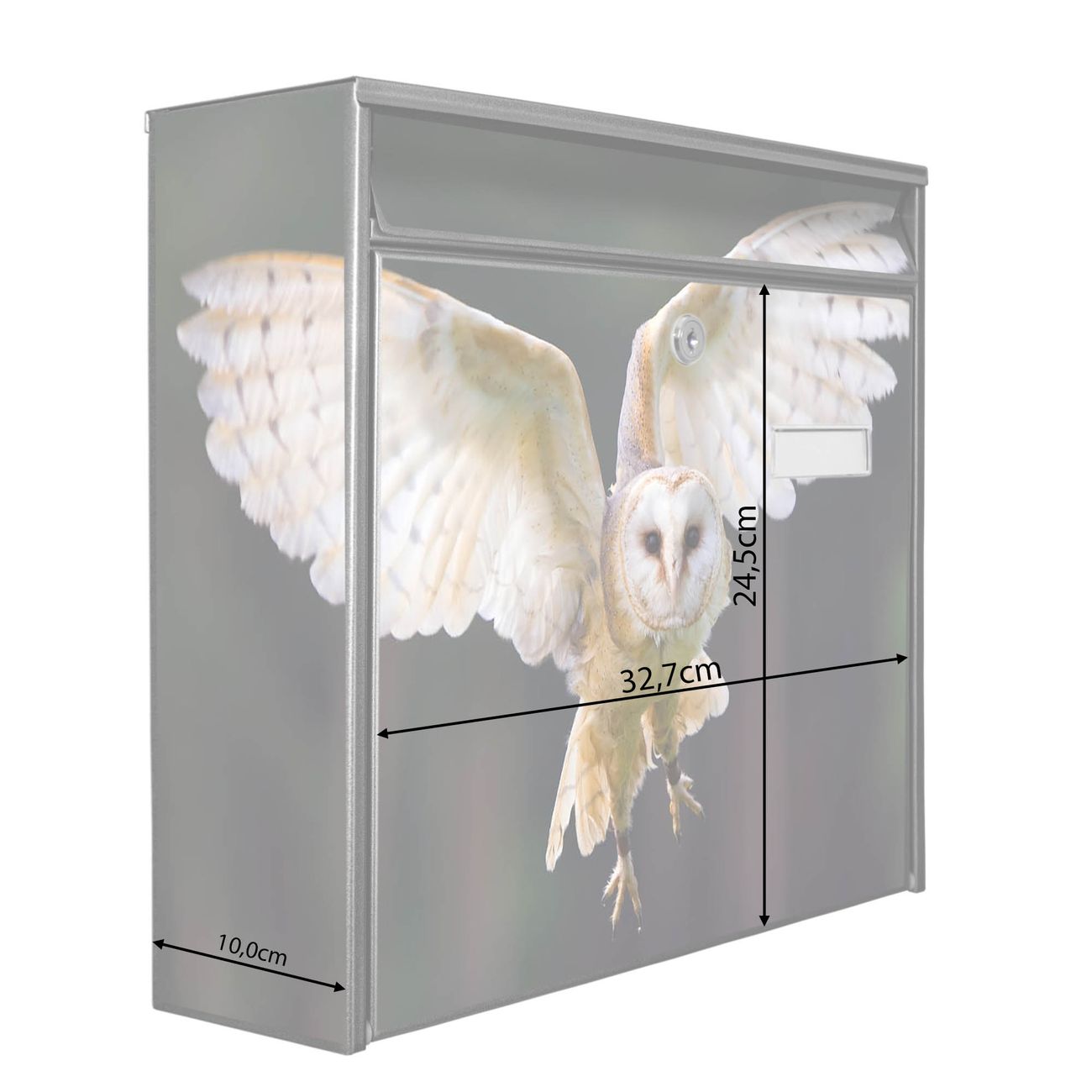Der Burg Wächter Mail Briefkasten mit Motiv Schleiereule bietet Ihnen mit seinem Fassungsvermögen genügend Platz auch für große A4 Sendungen. Auf Wunsch können Sie bei uns den passenden Standfuß kaufen und so aus dem Wandbriefkasten einen Standbriefkasten machen. Wir bieten Ihnen ebenfalls Namensschilder, bereits beschriftet oder frei zu beschriften, und verschiedene selbst gestaltete Bitte-Keine-Werbung-Aufkleber.