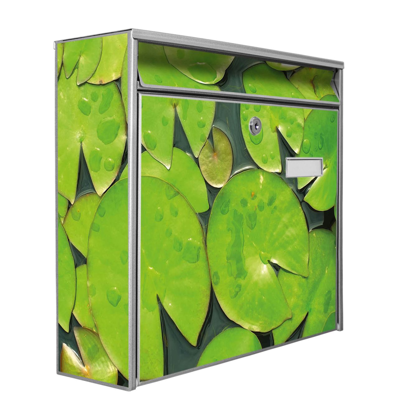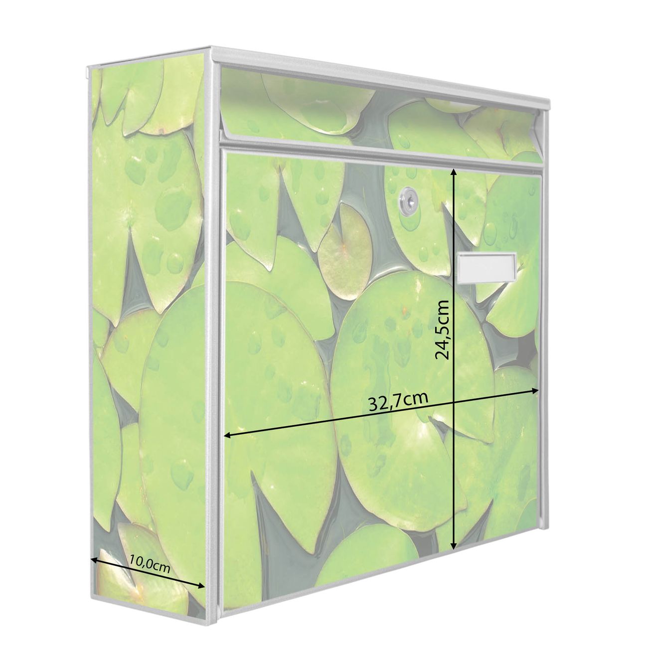 Der Burg Wächter Mail Briefkasten mit Motiv Seerosenblätter bietet Ihnen mit seinem Fassungsvermögen genügend Platz auch für große A4 Sendungen. Auf Wunsch können Sie bei uns den passenden Standfuß kaufen und so aus dem Wandbriefkasten einen Standbriefkasten machen. Wir bieten Ihnen ebenfalls Namensschilder, bereits beschriftet oder frei zu beschriften, und verschiedene selbst gestaltete Bitte-Keine-Werbung-Aufkleber.