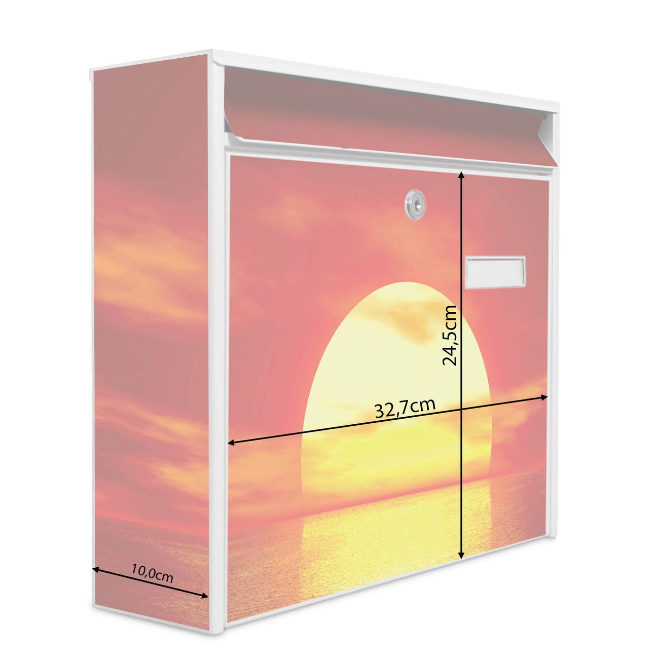 Der Burg Wächter Mail Briefkasten mit Motiv Sonnenuntergang bietet Ihnen mit seinem Fassungsvermögen genügend Platz auch für große A4 Sendungen. Auf Wunsch können Sie bei uns den passenden Standfuß kaufen und so aus dem Wandbriefkasten einen Standbriefkasten machen. Wir bieten Ihnen ebenfalls Namensschilder, bereits beschriftet oder frei zu beschriften, und verschiedene selbst gestaltete Bitte-Keine-Werbung-Aufkleber.