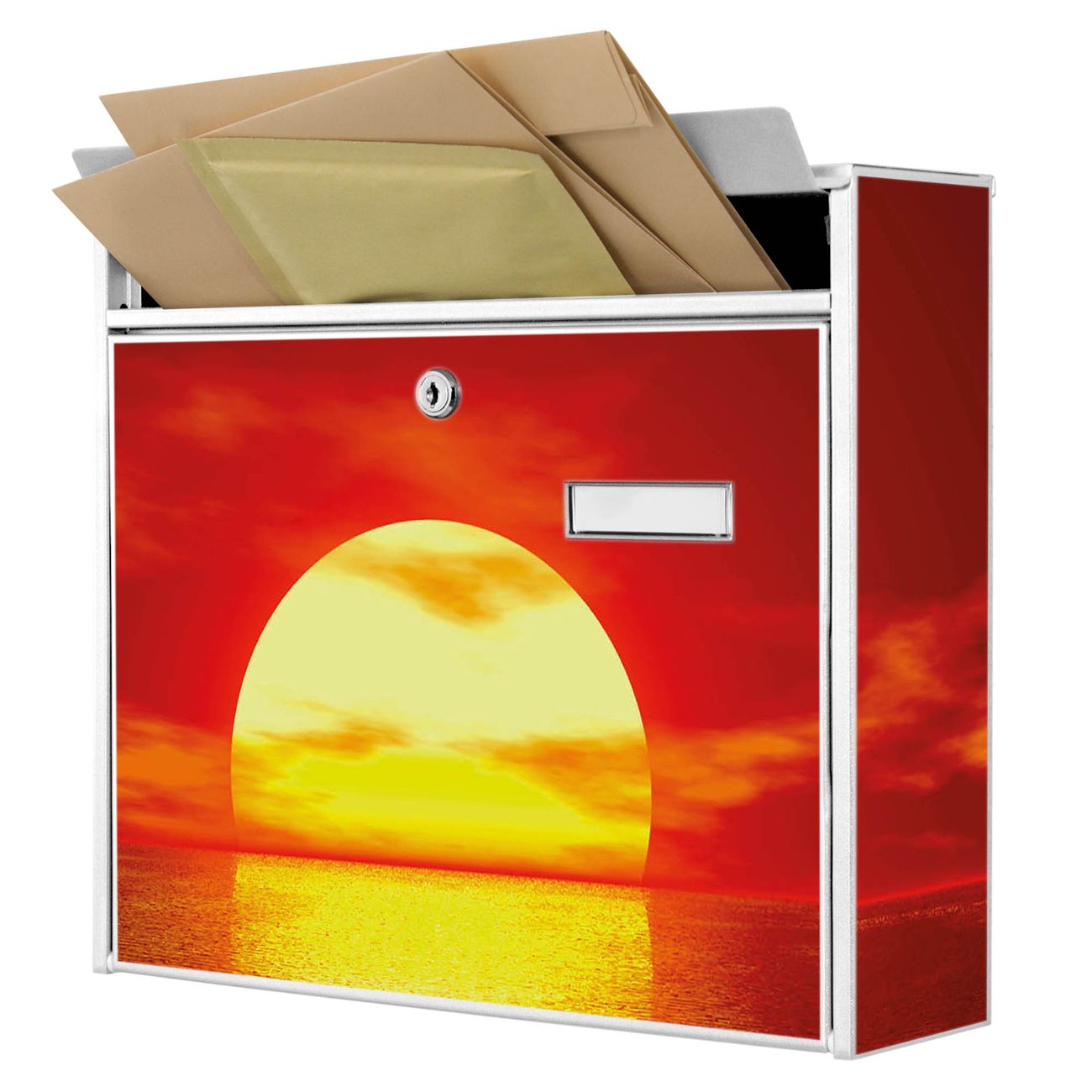 Der Postkasten mit Motiv Sonnenuntergang hat ein sehr ansprechendes und zeitloses Design. Heben Sie Sich von der tristen grauen Masse ab, ohne auf Funktionalität zu verzichten. Die weite Öffnung ohne scharfe Kanten ermöglicht eine einfache Handhabung beim Entnehmen der Post. Die Größe bietet genügend Platz für Sendungen aller Art, der Einwurf fasst auch größere A4 Sendungen. Ihr Burg-Wächter Motivbriefkasten wird in Sachsen in einer kleinen Manufaktur von Hand veredelt. Die Motivfolie ist lösungsmittelfrei und schutzlaminiert, dies sorgt für einen langen Halt. Wir legen großen Wert auf die Verbindung von Funktionalität und Design.