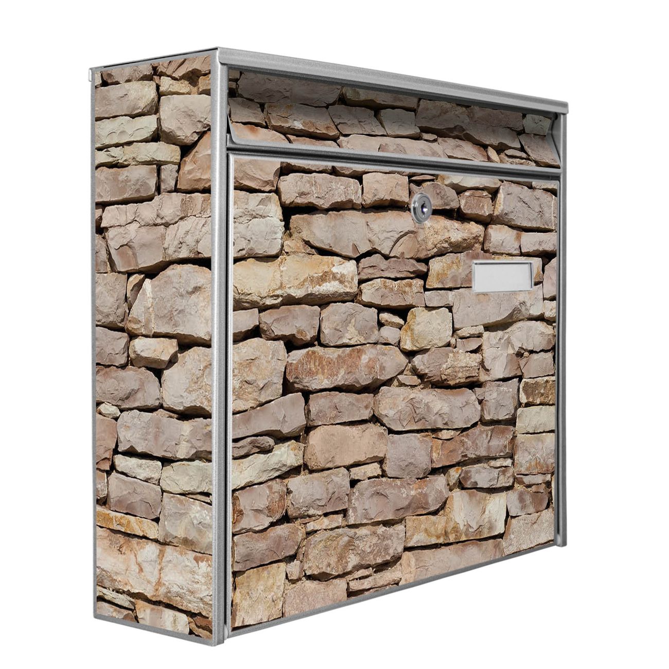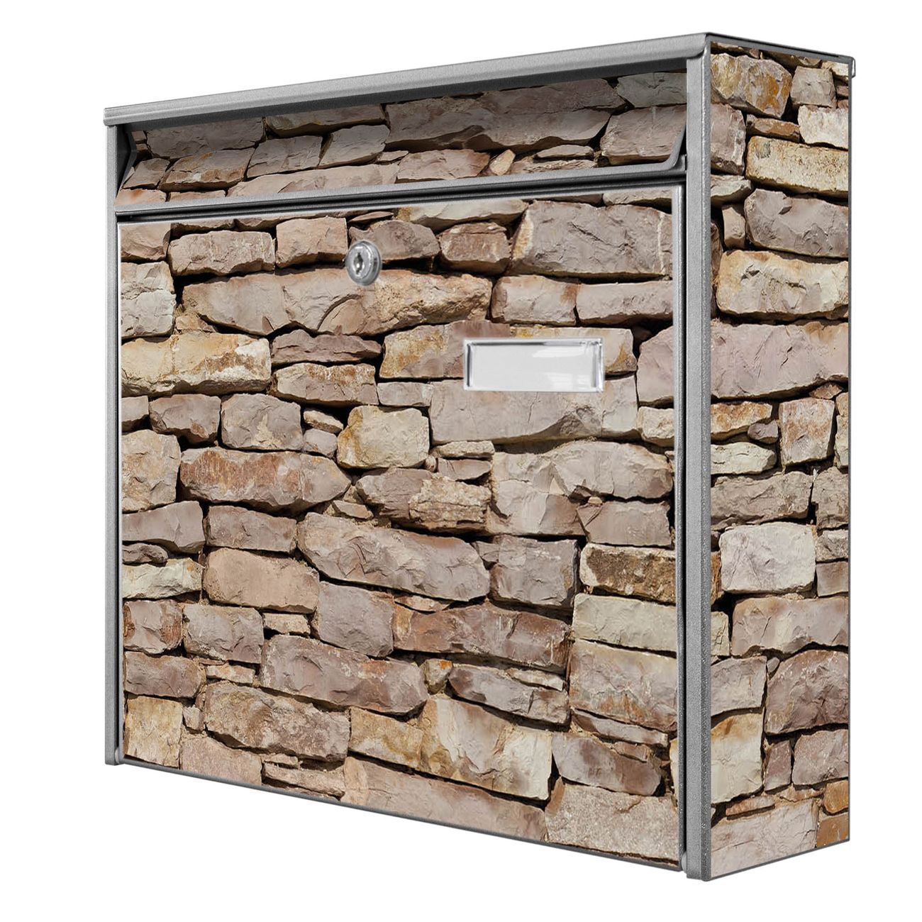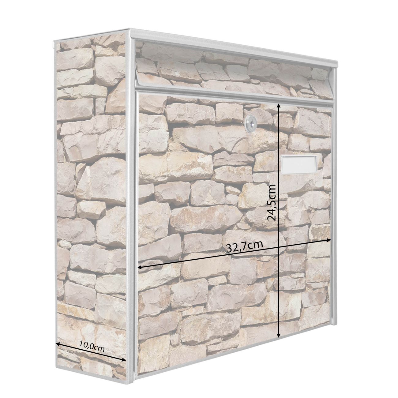 Die Größe des Briefkastens ist 36 x 32 x 10cm (BxHxT) groß. Das Motiv besteht aus einer wetter- und UV-festen Folie, die mit einem Schutzlaminat überzogen ist und Ihren Briefkasten zusätzlich vor Kratzern schützt. Sie erhalten 2 Schlüssel sowie das Montagematerial.