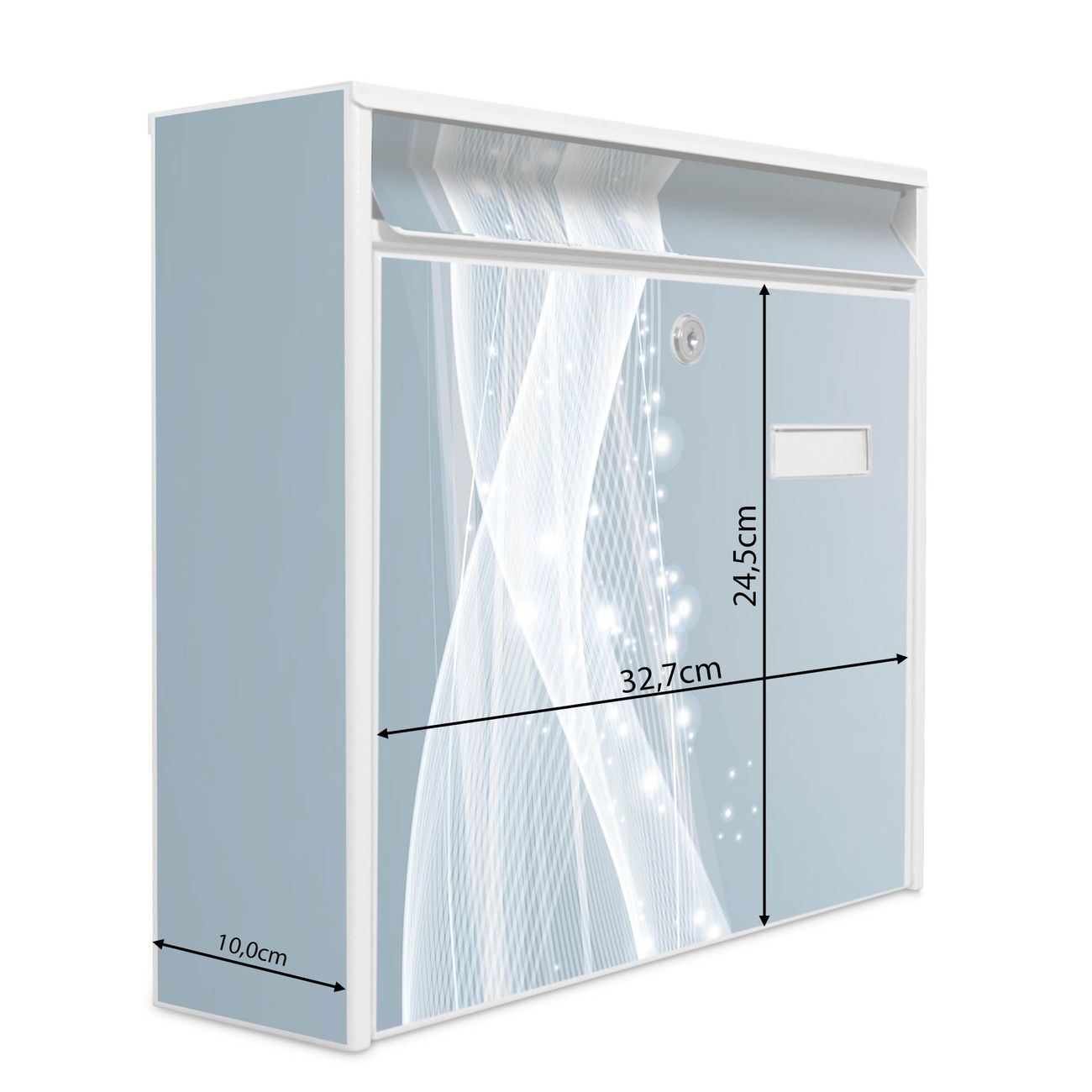Die Größe des Briefkastens ist 36 x 32 x 10cm (BxHxT) groß. Das Motiv besteht aus einer wetter- und UV-festen Folie, die mit einem Schutzlaminat überzogen ist und Ihren Briefkasten zusätzlich vor Kratzern schützt. Sie erhalten 2 Schlüssel sowie das Montagematerial.