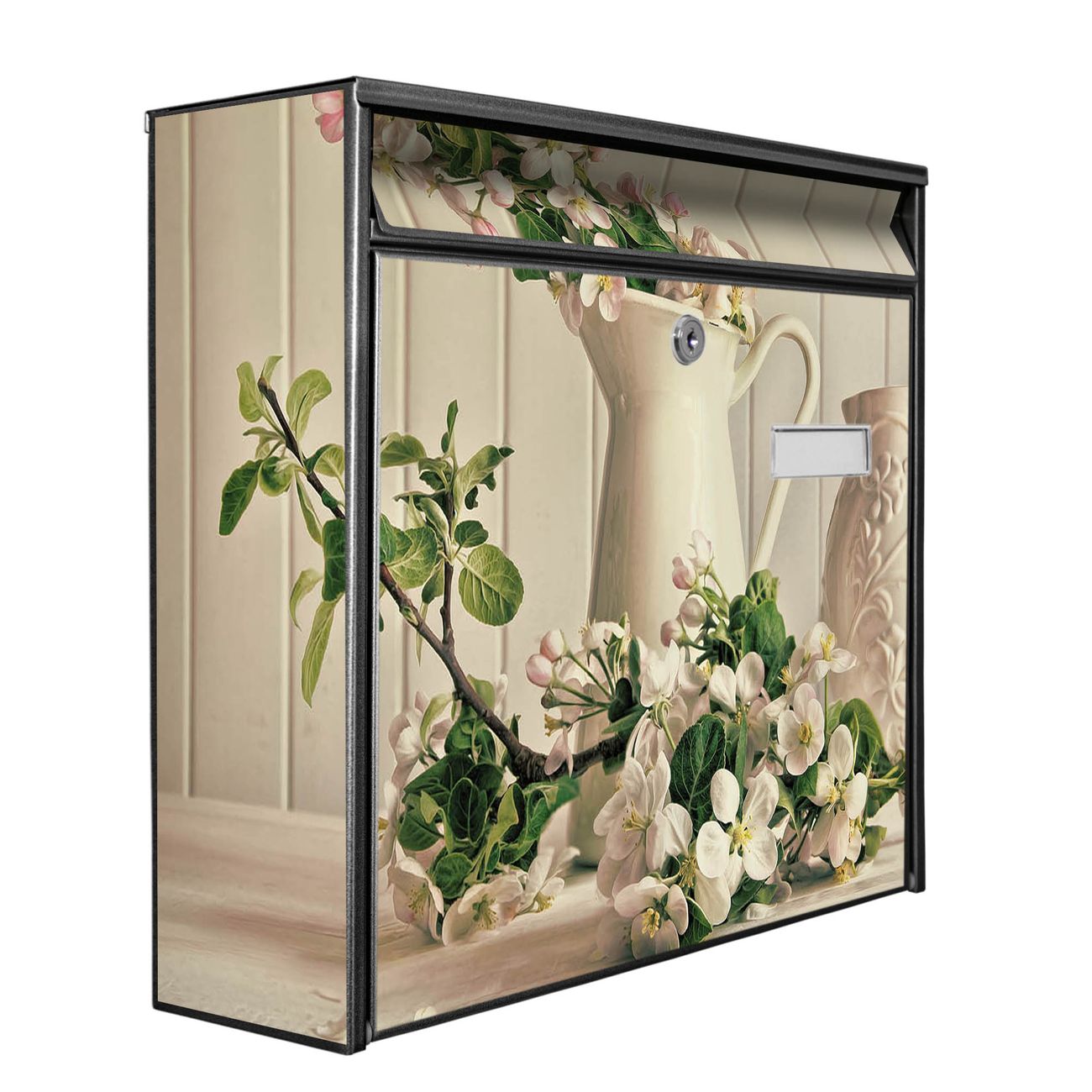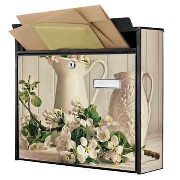 Der Burg Wächter Mail Briefkasten mit Motiv Stillleben Kirschblüten bietet Ihnen mit seinem Fassungsvermögen genügend Platz auch für große A4 Sendungen. Auf Wunsch können Sie bei uns den passenden Standfuß kaufen und so aus dem Wandbriefkasten einen Standbriefkasten machen. Wir bieten Ihnen ebenfalls Namensschilder, bereits beschriftet oder frei zu beschriften, und verschiedene selbst gestaltete Bitte-Keine-Werbung-Aufkleber.