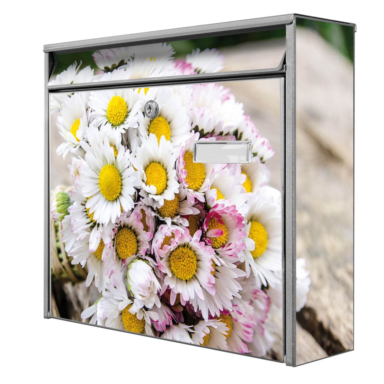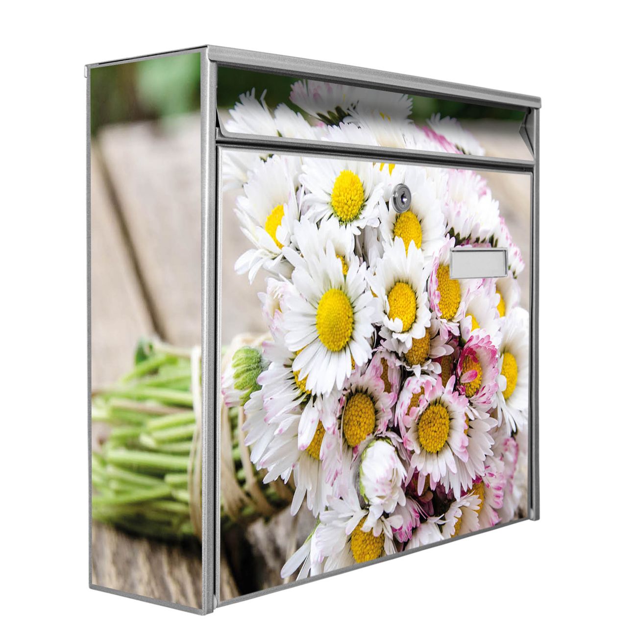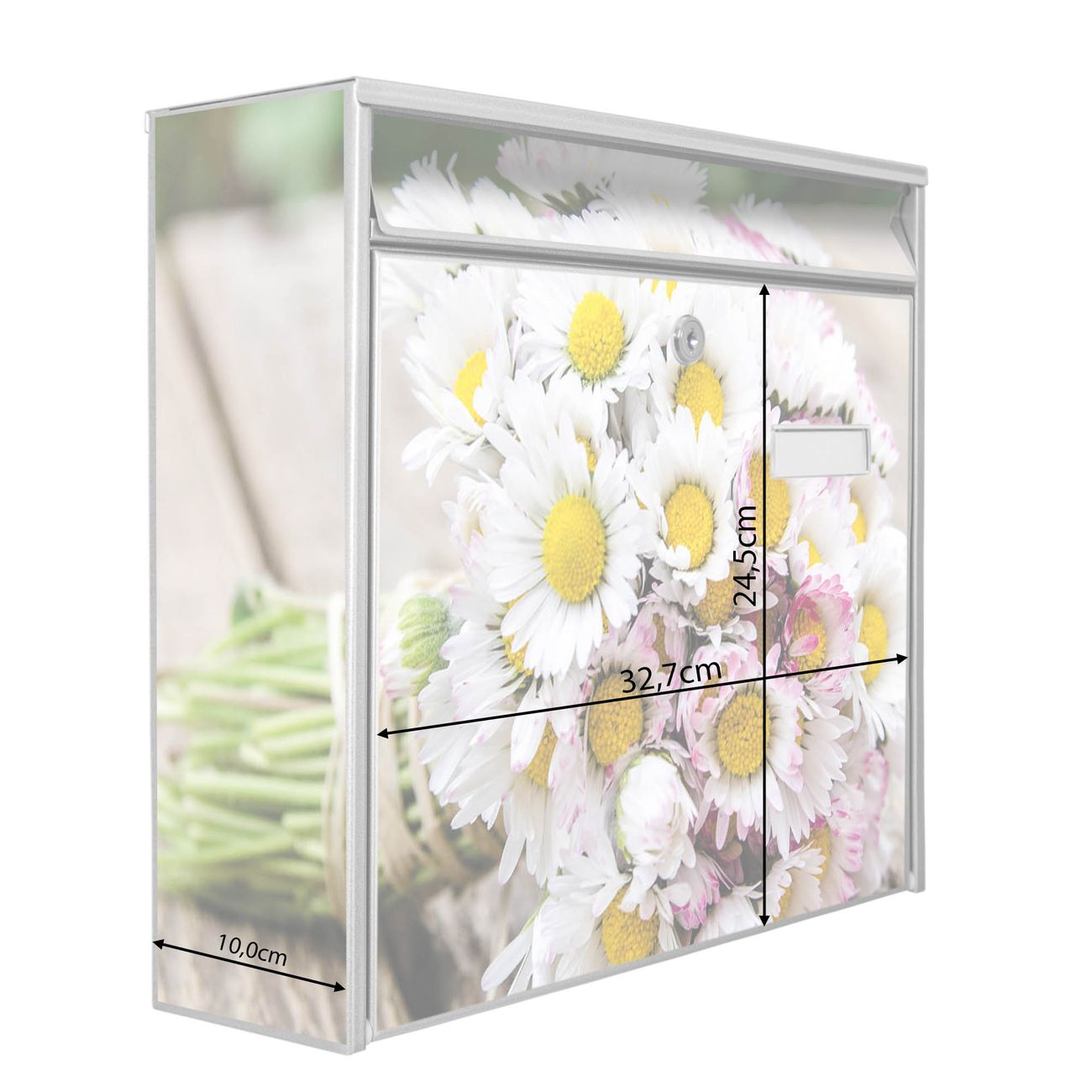 Der Burg Wächter Mail Briefkasten mit Motiv Strauß Gänseblümchen bietet Ihnen mit seinem Fassungsvermögen genügend Platz auch für große A4 Sendungen. Auf Wunsch können Sie bei uns den passenden Standfuß kaufen und so aus dem Wandbriefkasten einen Standbriefkasten machen. Wir bieten Ihnen ebenfalls Namensschilder, bereits beschriftet oder frei zu beschriften, und verschiedene selbst gestaltete Bitte-Keine-Werbung-Aufkleber.