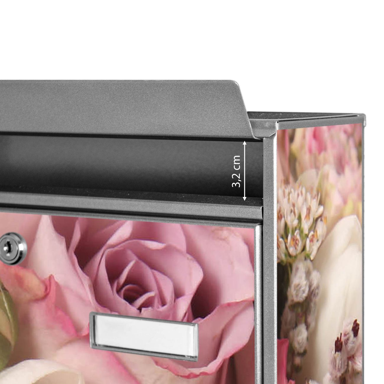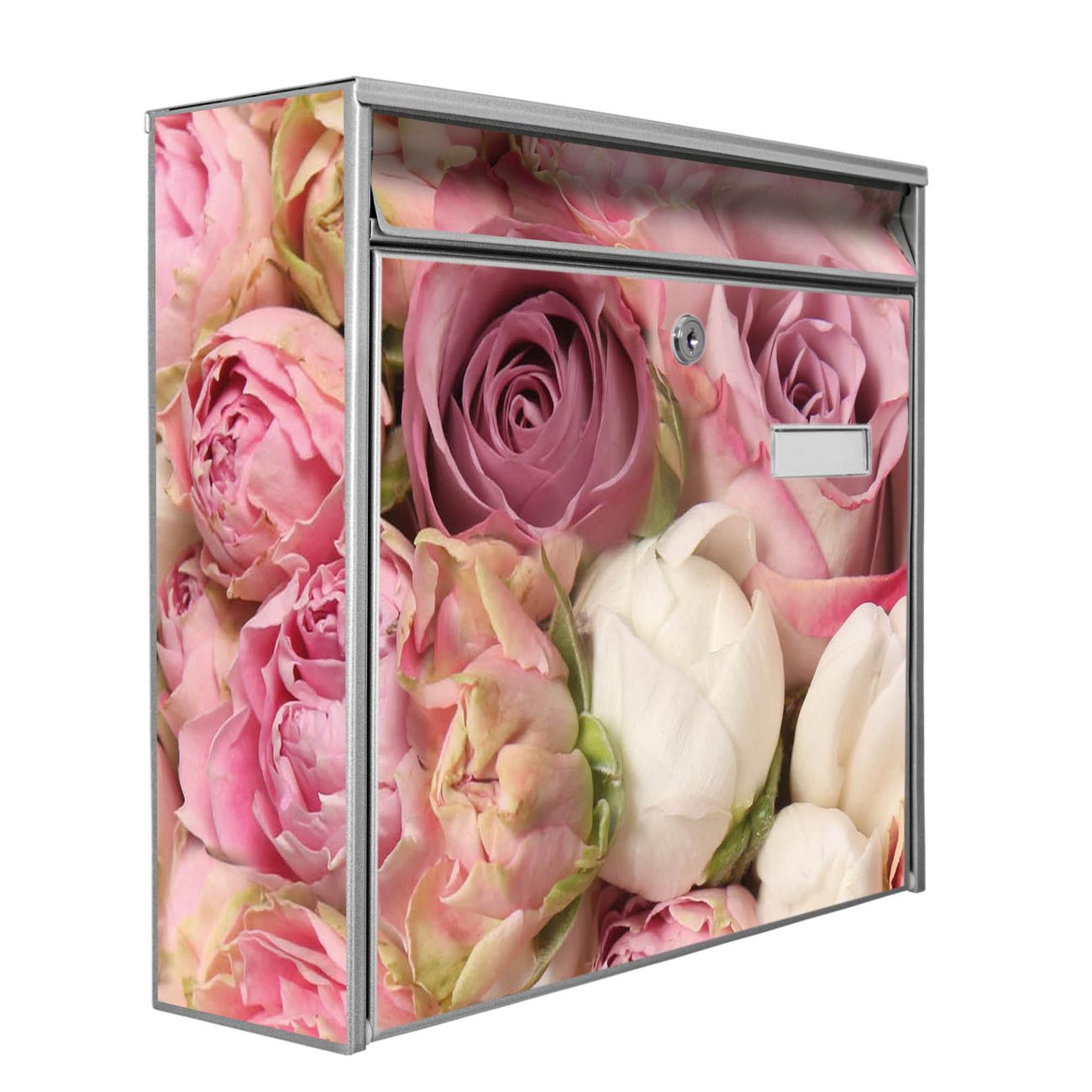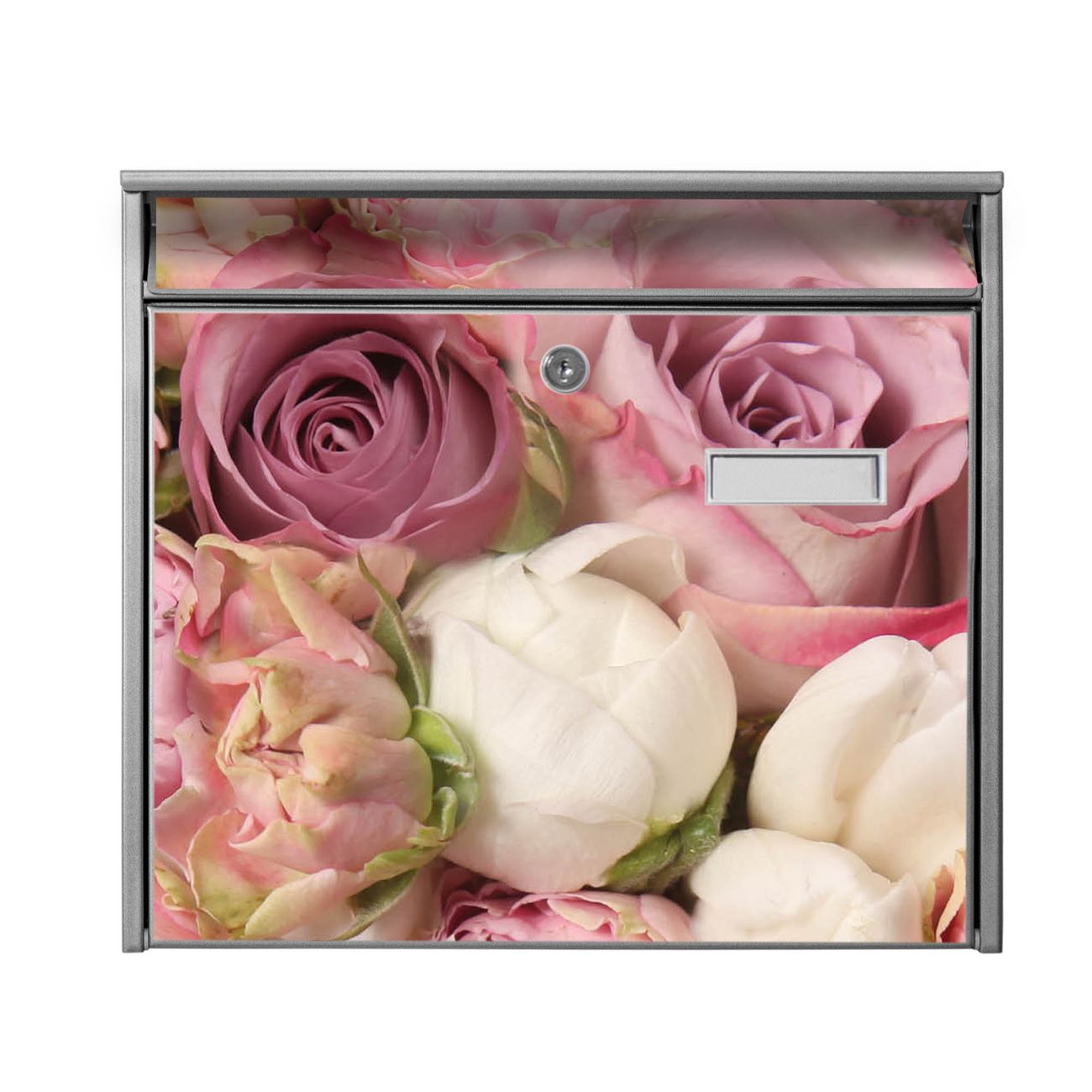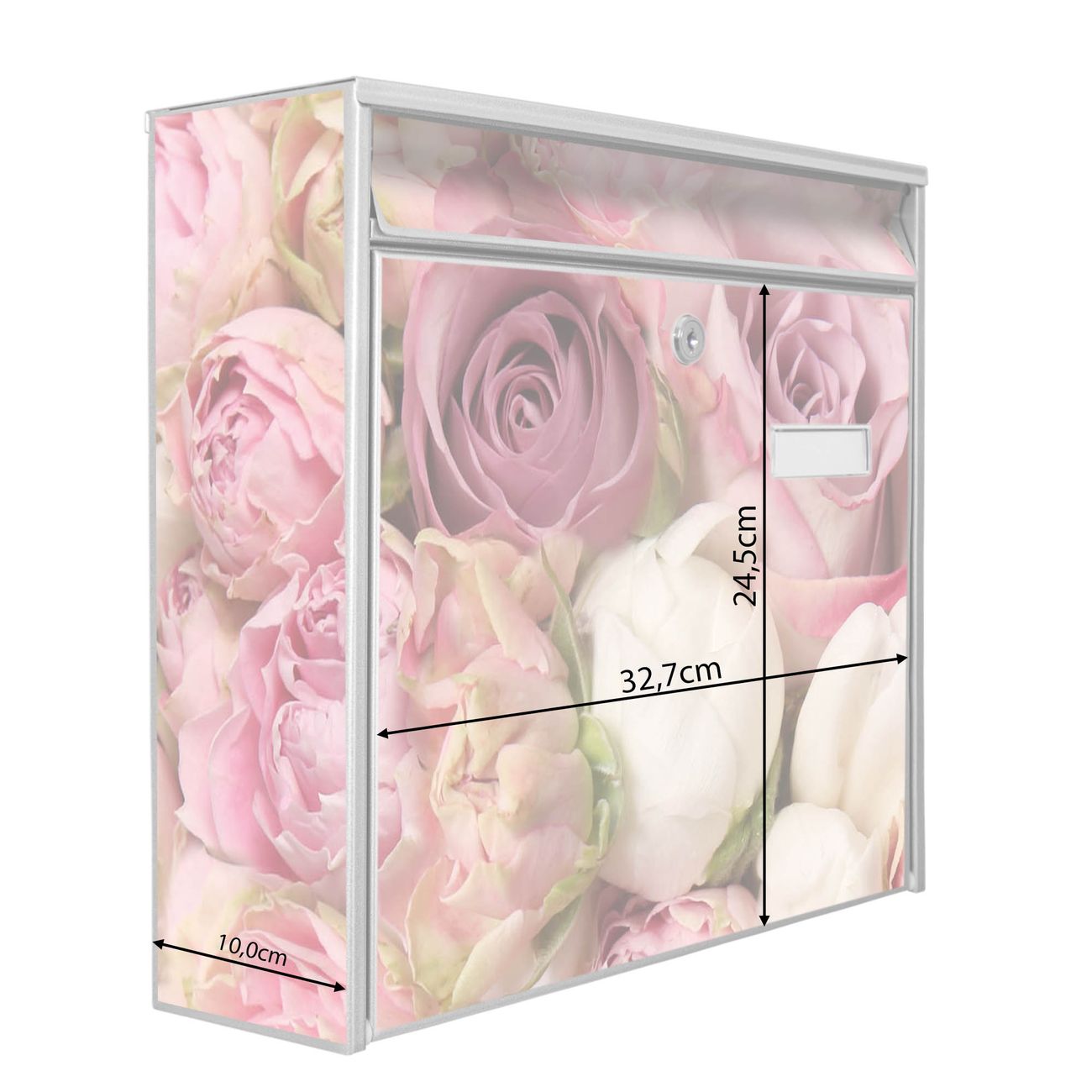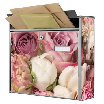 Der Burg Wächter Mail Briefkasten mit Motiv Strauss Rosen bietet Ihnen mit seinem Fassungsvermögen genügend Platz auch für große A4 Sendungen. Auf Wunsch können Sie bei uns den passenden Standfuß kaufen und so aus dem Wandbriefkasten einen Standbriefkasten machen. Wir bieten Ihnen ebenfalls Namensschilder, bereits beschriftet oder frei zu beschriften, und verschiedene selbst gestaltete Bitte-Keine-Werbung-Aufkleber.