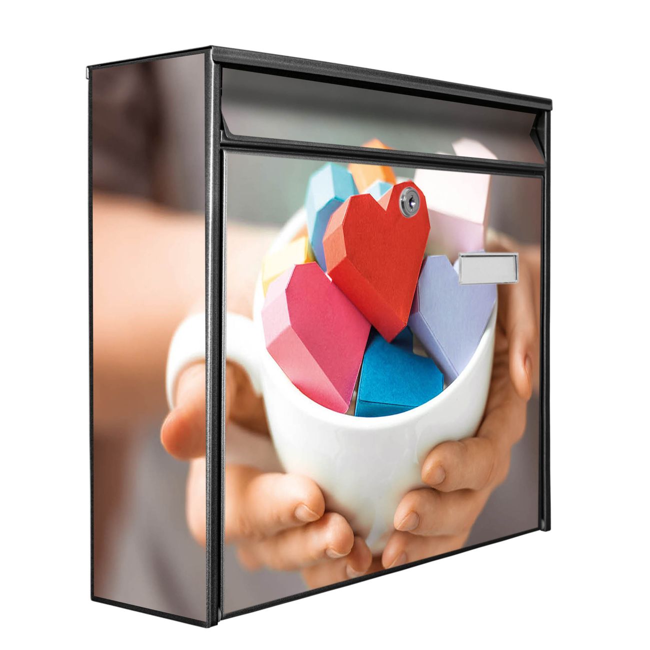 Der Postkasten mit Motiv Tasse voller Herzen hat ein sehr ansprechendes und zeitloses Design. Heben Sie Sich von der tristen grauen Masse ab, ohne auf Funktionalität zu verzichten. Die weite Öffnung ohne scharfe Kanten ermöglicht eine einfache Handhabung beim Entnehmen der Post. Die Größe bietet genügend Platz für Sendungen aller Art, der Einwurf fasst auch größere A4 Sendungen. Ihr Burg-Wächter Motivbriefkasten wird in Sachsen in einer kleinen Manufaktur von Hand veredelt. Die Motivfolie ist lösungsmittelfrei und schutzlaminiert, dies sorgt für einen langen Halt. Wir legen großen Wert auf die Verbindung von Funktionalität und Design.