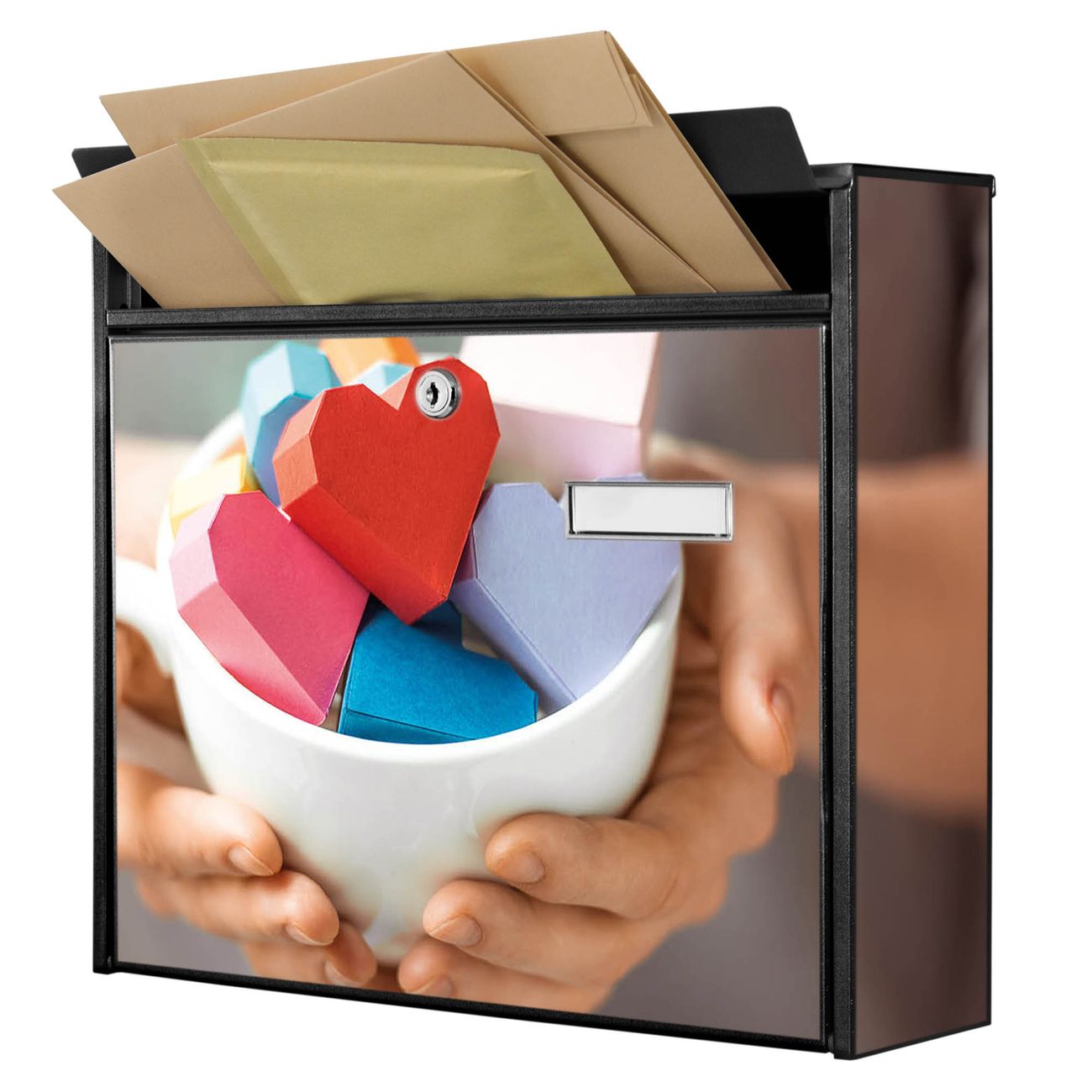 Der Burg Wächter Mail Briefkasten mit Motiv Tasse voller Herzen bietet Ihnen mit seinem Fassungsvermögen genügend Platz auch für große A4 Sendungen. Auf Wunsch können Sie bei uns den passenden Standfuß kaufen und so aus dem Wandbriefkasten einen Standbriefkasten machen. Wir bieten Ihnen ebenfalls Namensschilder, bereits beschriftet oder frei zu beschriften, und verschiedene selbst gestaltete Bitte-Keine-Werbung-Aufkleber.