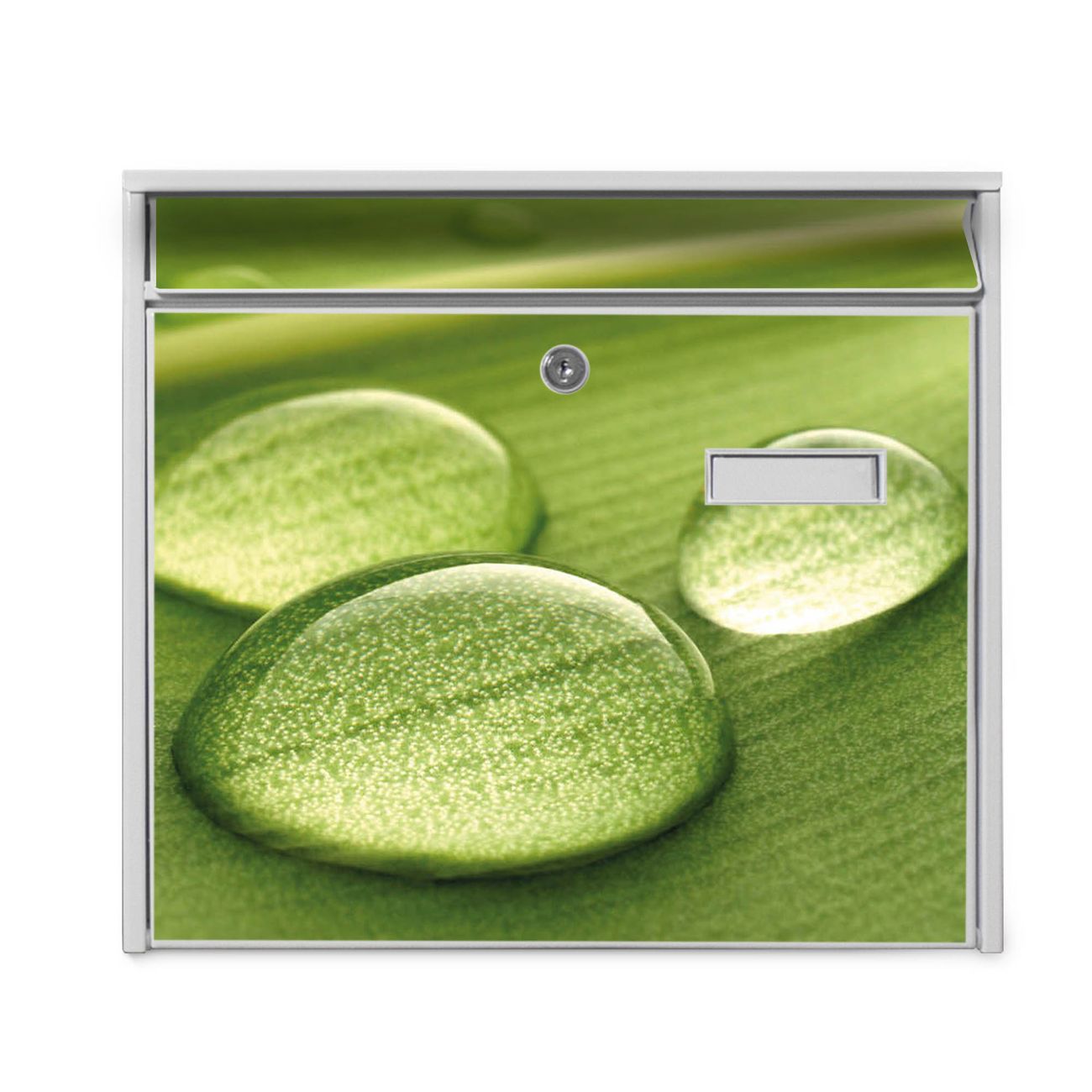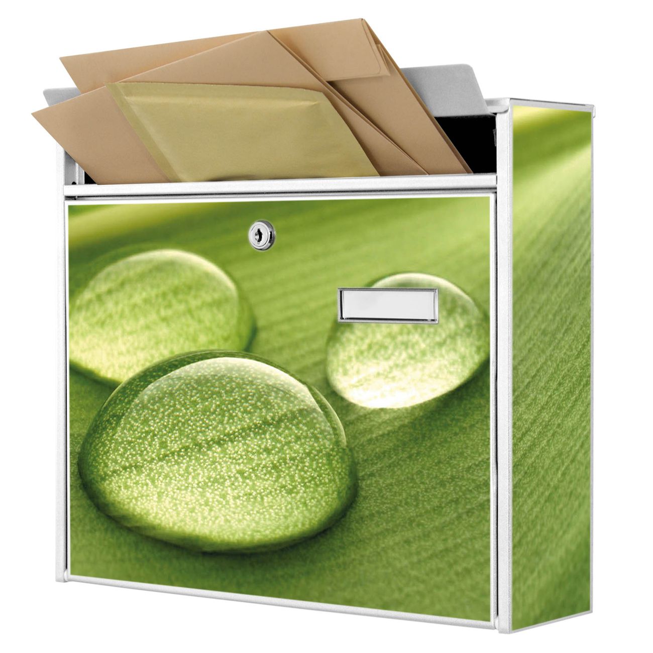 Der Burg Wächter Mail Briefkasten mit Motiv Tautropfen bietet Ihnen mit seinem Fassungsvermögen genügend Platz auch für große A4 Sendungen. Auf Wunsch können Sie bei uns den passenden Standfuß kaufen und so aus dem Wandbriefkasten einen Standbriefkasten machen. Wir bieten Ihnen ebenfalls Namensschilder, bereits beschriftet oder frei zu beschriften, und verschiedene selbst gestaltete Bitte-Keine-Werbung-Aufkleber.
