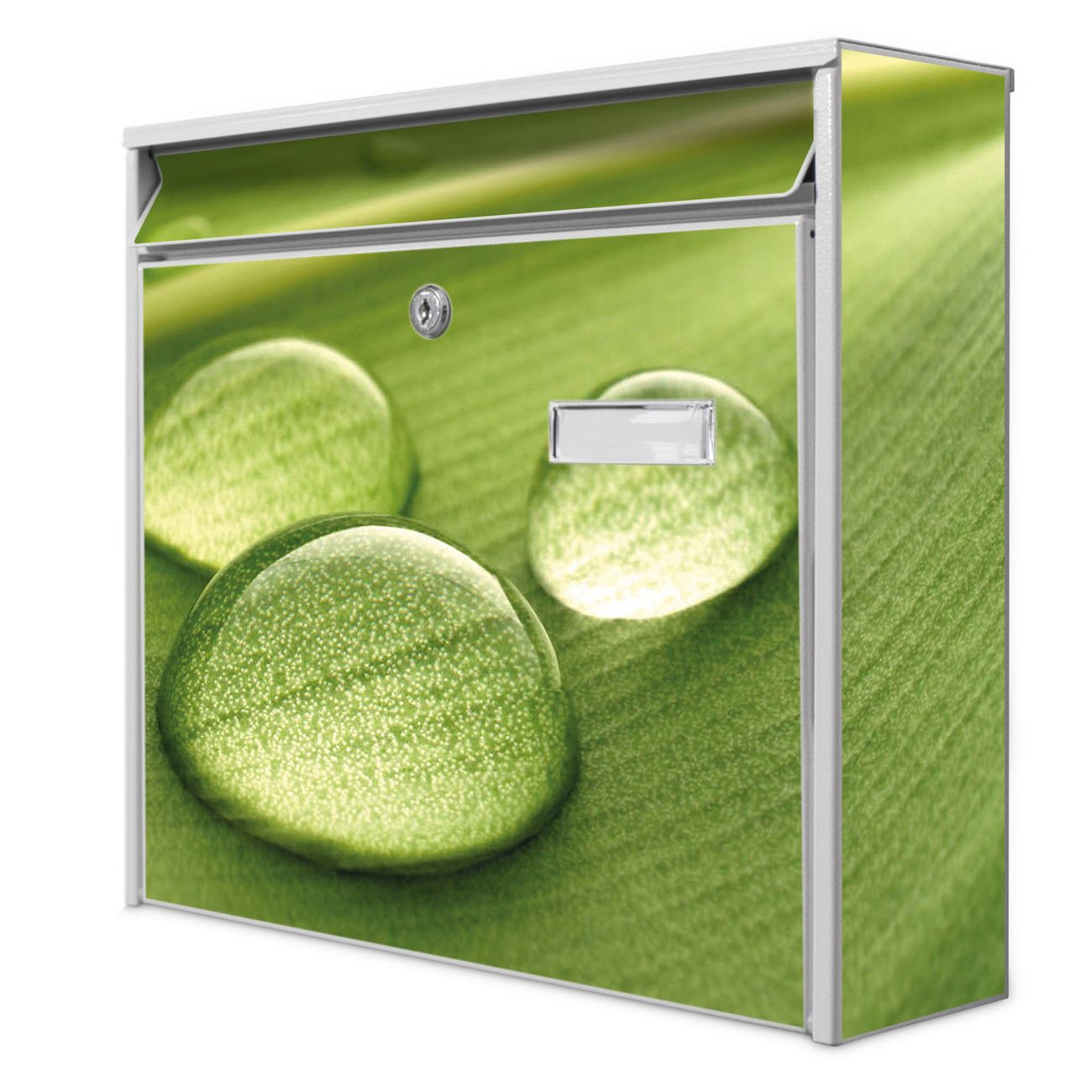 Der Postkasten mit Motiv Tautropfen hat ein sehr ansprechendes und zeitloses Design. Heben Sie Sich von der tristen grauen Masse ab, ohne auf Funktionalität zu verzichten. Die weite Öffnung ohne scharfe Kanten ermöglicht eine einfache Handhabung beim Entnehmen der Post. Die Größe bietet genügend Platz für Sendungen aller Art, der Einwurf fasst auch größere A4 Sendungen. Ihr Burg-Wächter Motivbriefkasten wird in Sachsen in einer kleinen Manufaktur von Hand veredelt. Die Motivfolie ist lösungsmittelfrei und schutzlaminiert, dies sorgt für einen langen Halt. Wir legen großen Wert auf die Verbindung von Funktionalität und Design.