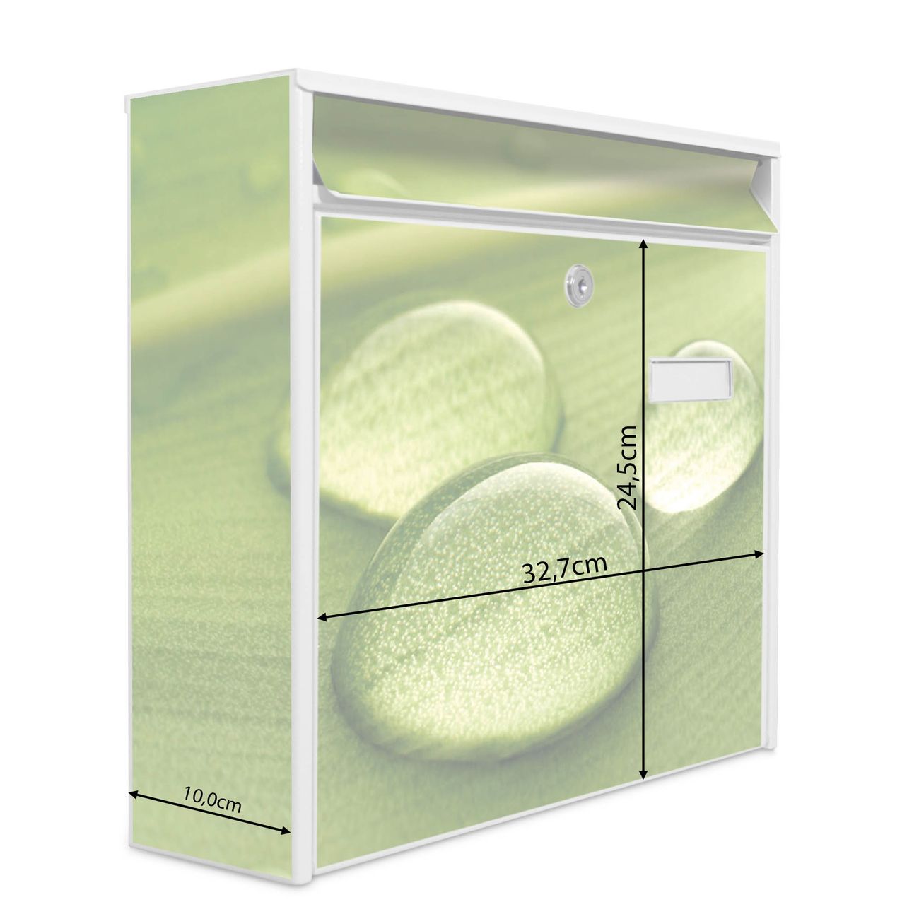 Die Größe des Briefkastens ist 36 x 32 x 10cm (BxHxT) groß. Das Motiv besteht aus einer wetter- und UV-festen Folie, die mit einem Schutzlaminat überzogen ist und Ihren Briefkasten zusätzlich vor Kratzern schützt. Sie erhalten 2 Schlüssel sowie das Montagematerial.