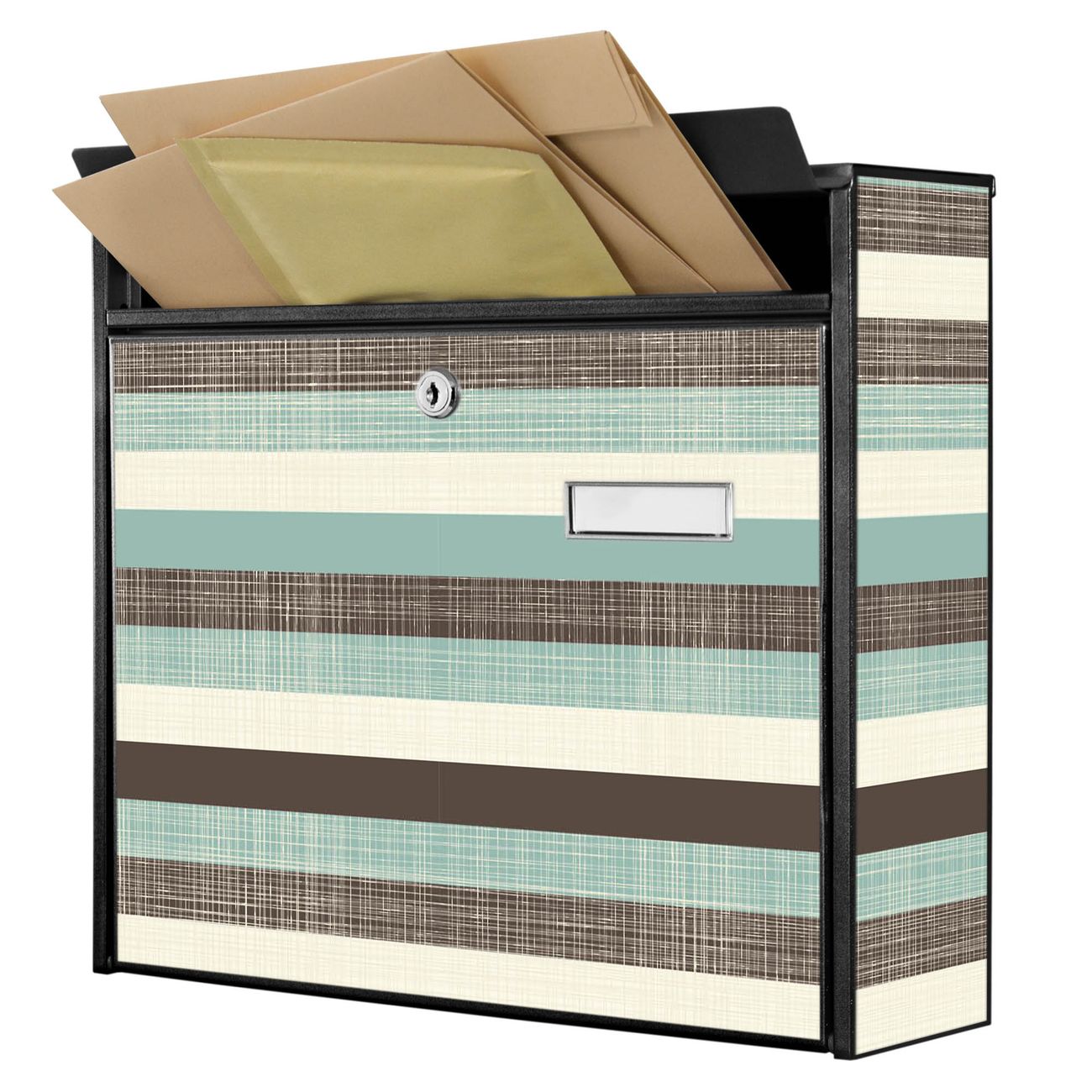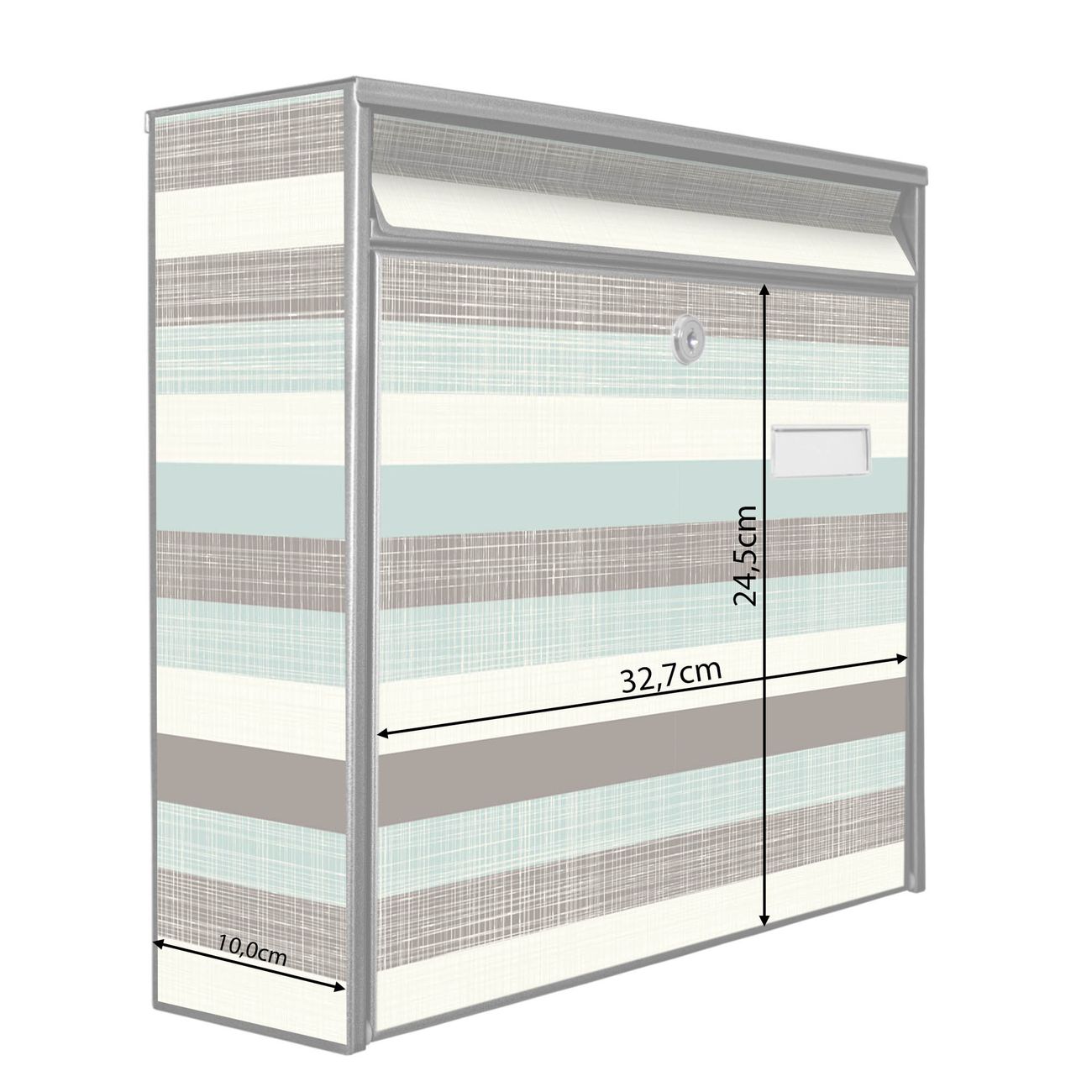 Der Burg Wächter Mail Briefkasten mit Motiv Textile Streifen bietet Ihnen mit seinem Fassungsvermögen genügend Platz auch für große A4 Sendungen. Auf Wunsch können Sie bei uns den passenden Standfuß kaufen und so aus dem Wandbriefkasten einen Standbriefkasten machen. Wir bieten Ihnen ebenfalls Namensschilder, bereits beschriftet oder frei zu beschriften, und verschiedene selbst gestaltete Bitte-Keine-Werbung-Aufkleber.