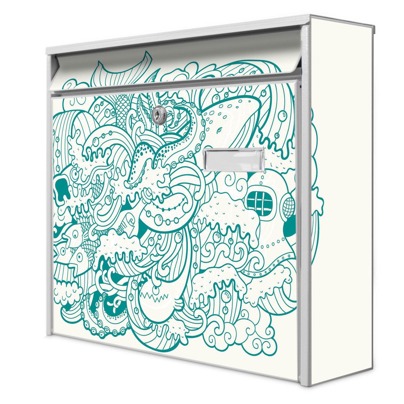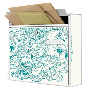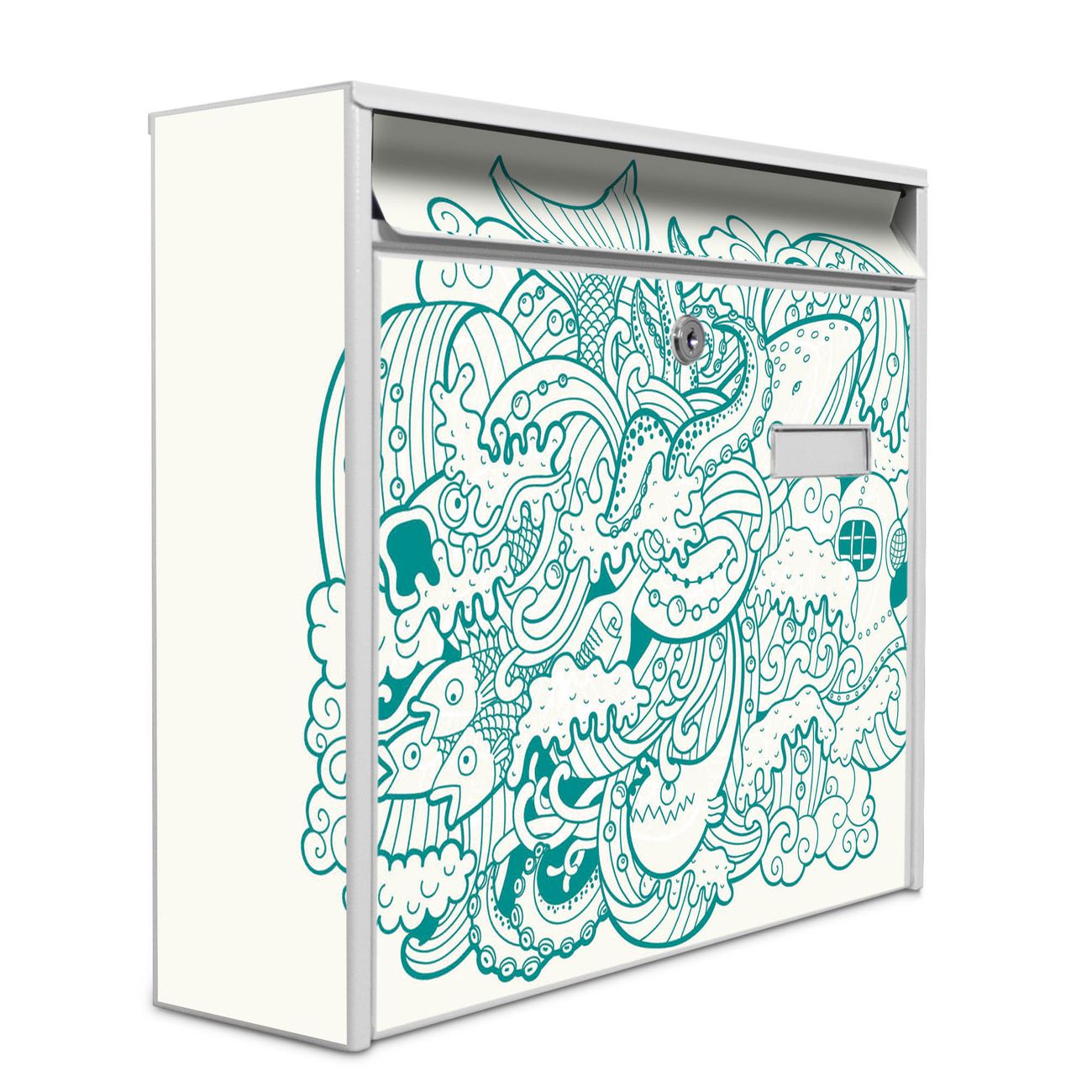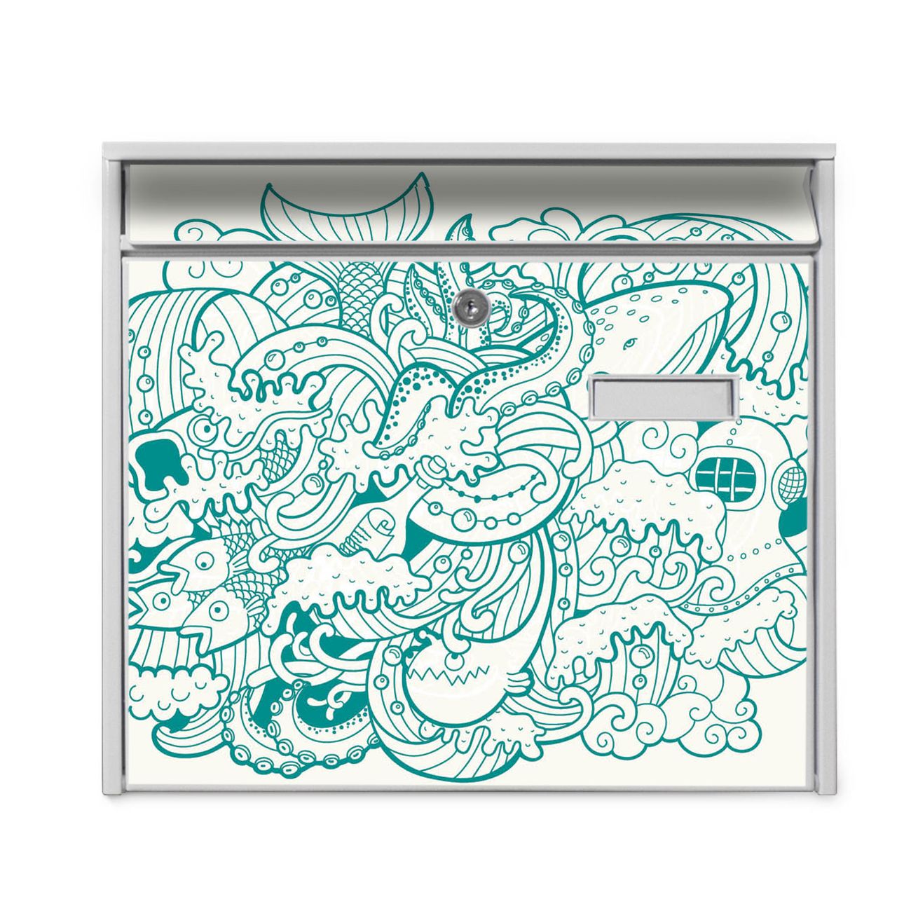 Der Burg Wächter Mail Briefkasten mit Motiv Tiefsee bietet Ihnen mit seinem Fassungsvermögen genügend Platz auch für große A4 Sendungen. Auf Wunsch können Sie bei uns den passenden Standfuß kaufen und so aus dem Wandbriefkasten einen Standbriefkasten machen. Wir bieten Ihnen ebenfalls Namensschilder, bereits beschriftet oder frei zu beschriften, und verschiedene selbst gestaltete Bitte-Keine-Werbung-Aufkleber.