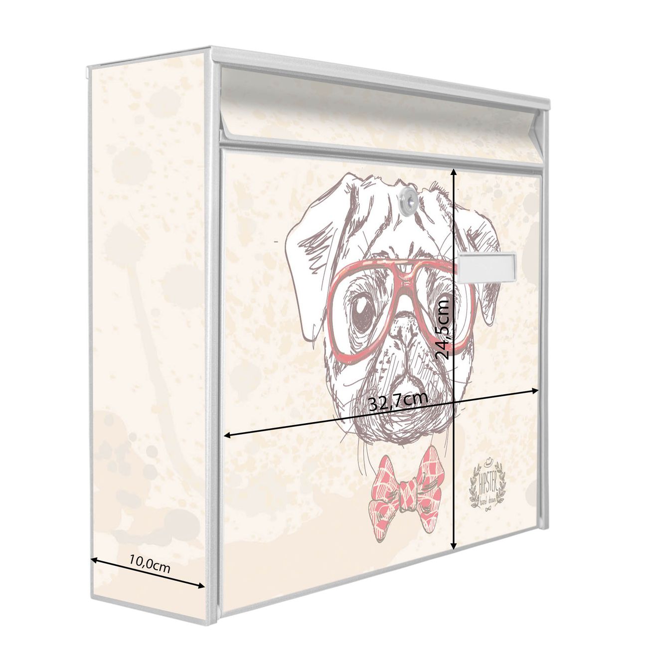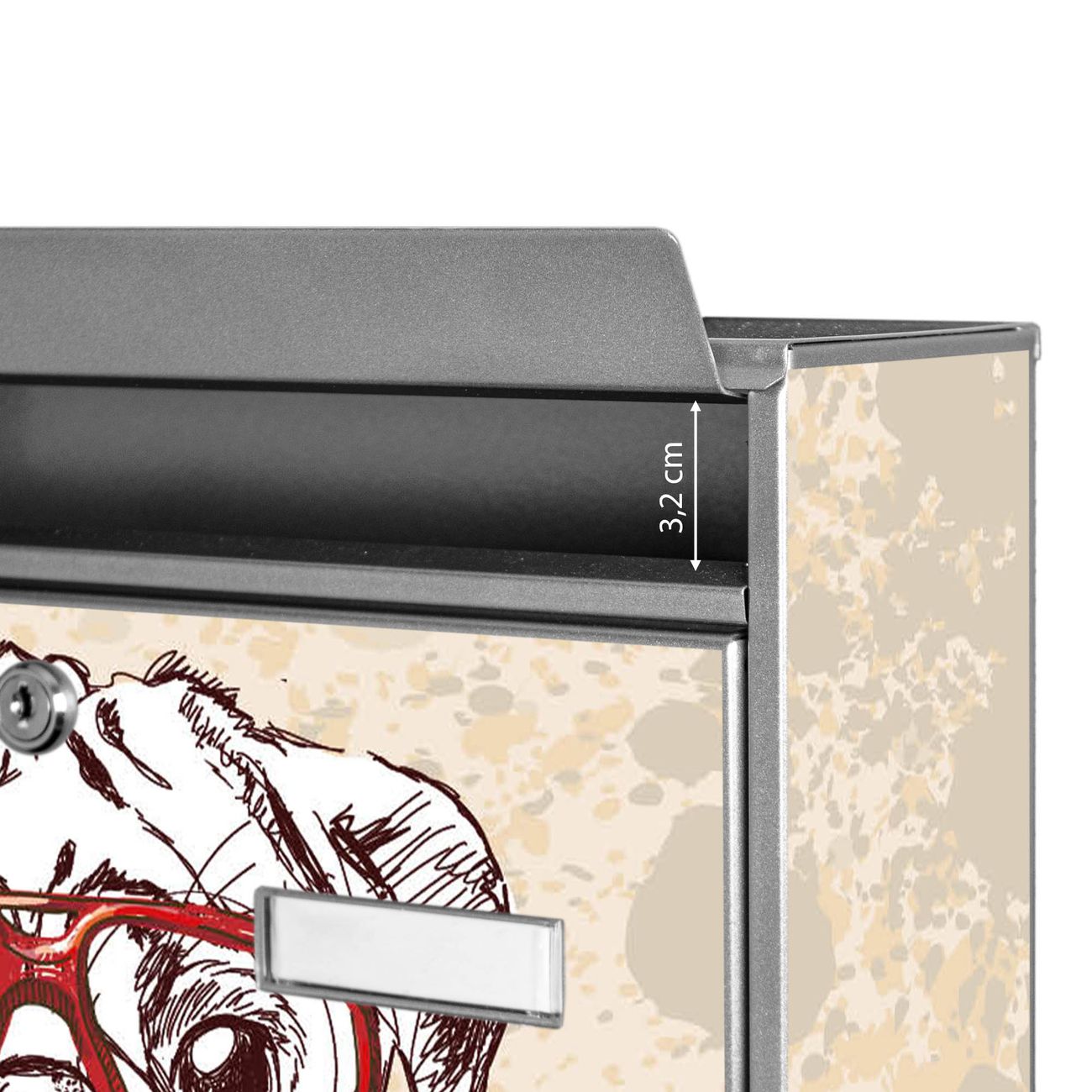 Die Größe des Briefkastens ist 36 x 32 x 10cm (BxHxT) groß. Das Motiv besteht aus einer wetter- und UV-festen Folie, die mit einem Schutzlaminat überzogen ist und Ihren Briefkasten zusätzlich vor Kratzern schützt. Sie erhalten 2 Schlüssel sowie das Montagematerial.