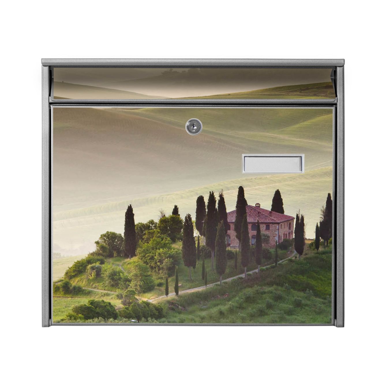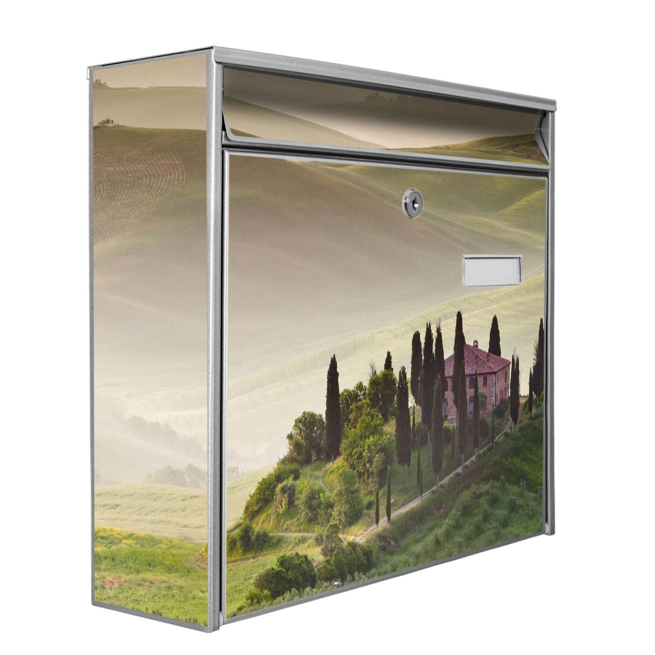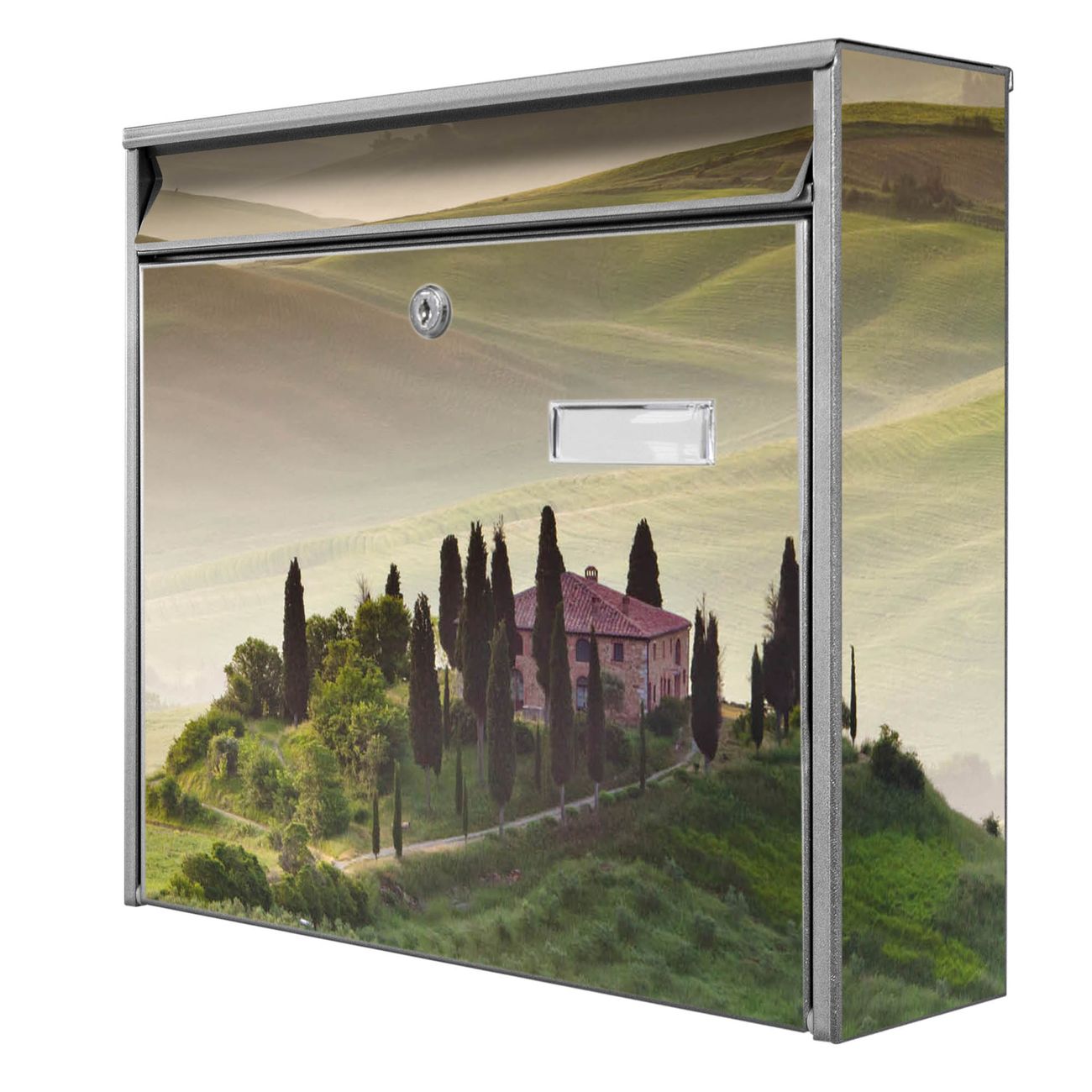 Der Postkasten mit Motiv Toscana hat ein sehr ansprechendes und zeitloses Design. Heben Sie Sich von der tristen grauen Masse ab, ohne auf Funktionalität zu verzichten. Die weite Öffnung ohne scharfe Kanten ermöglicht eine einfache Handhabung beim Entnehmen der Post. Die Größe bietet genügend Platz für Sendungen aller Art, der Einwurf fasst auch größere A4 Sendungen. Ihr Burg-Wächter Motivbriefkasten wird in Sachsen in einer kleinen Manufaktur von Hand veredelt. Die Motivfolie ist lösungsmittelfrei und schutzlaminiert, dies sorgt für einen langen Halt. Wir legen großen Wert auf die Verbindung von Funktionalität und Design.