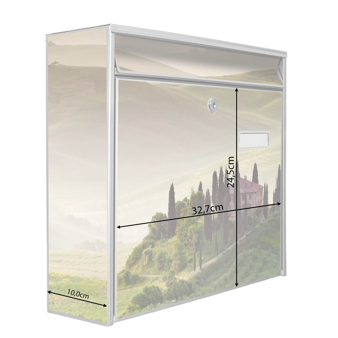 Der Burg Wächter Mail Briefkasten mit Motiv Toscana bietet Ihnen mit seinem Fassungsvermögen genügend Platz auch für große A4 Sendungen. Auf Wunsch können Sie bei uns den passenden Standfuß kaufen und so aus dem Wandbriefkasten einen Standbriefkasten machen. Wir bieten Ihnen ebenfalls Namensschilder, bereits beschriftet oder frei zu beschriften, und verschiedene selbst gestaltete Bitte-Keine-Werbung-Aufkleber.