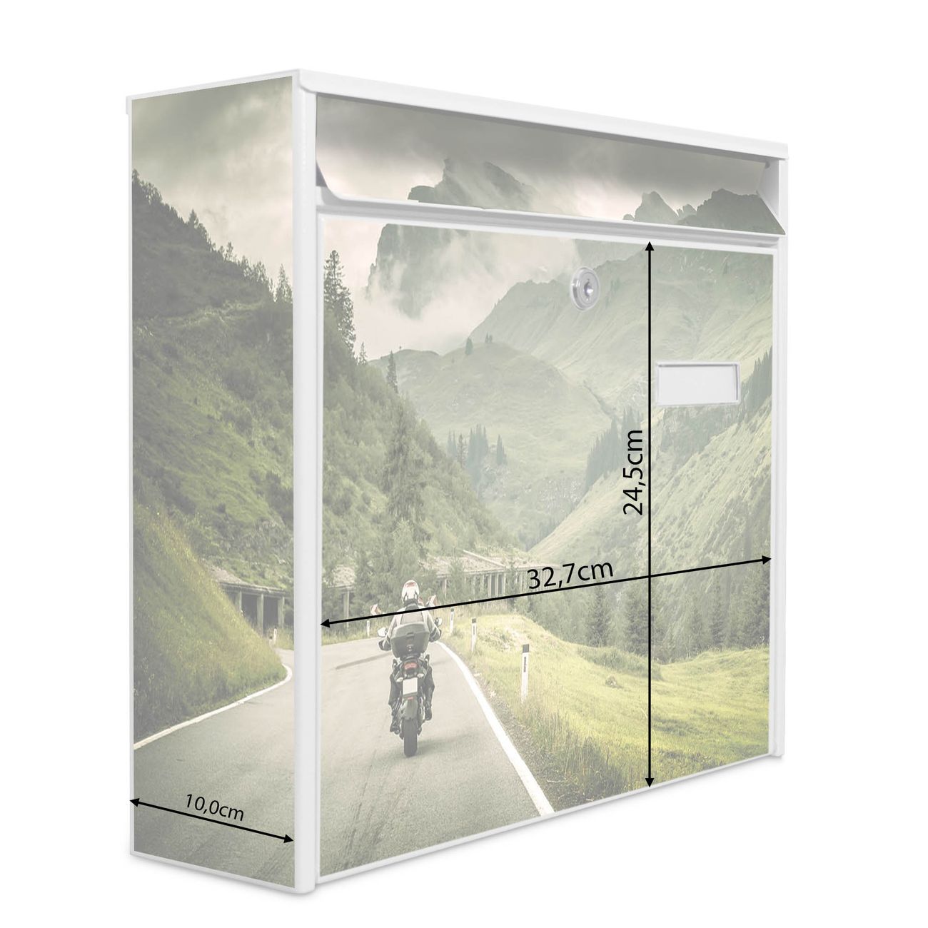 Die Größe des Briefkastens ist 36 x 32 x 10cm (BxHxT) groß. Das Motiv besteht aus einer wetter- und UV-festen Folie, die mit einem Schutzlaminat überzogen ist und Ihren Briefkasten zusätzlich vor Kratzern schützt. Sie erhalten 2 Schlüssel sowie das Montagematerial.
