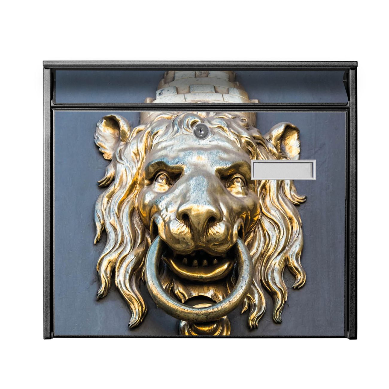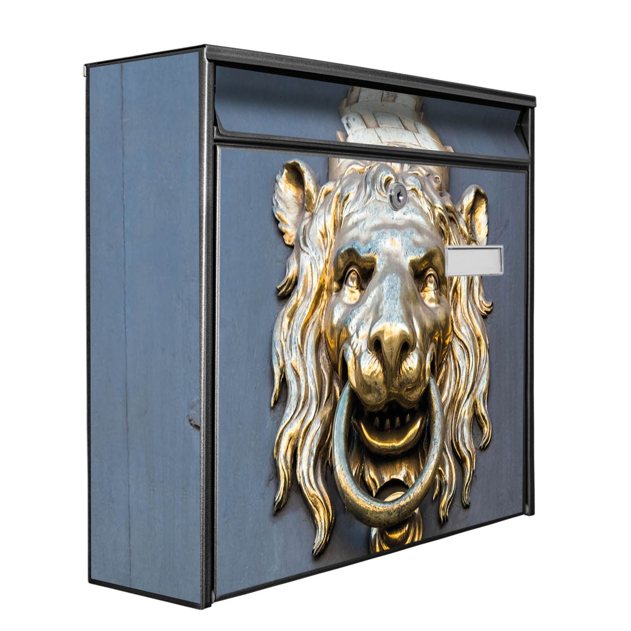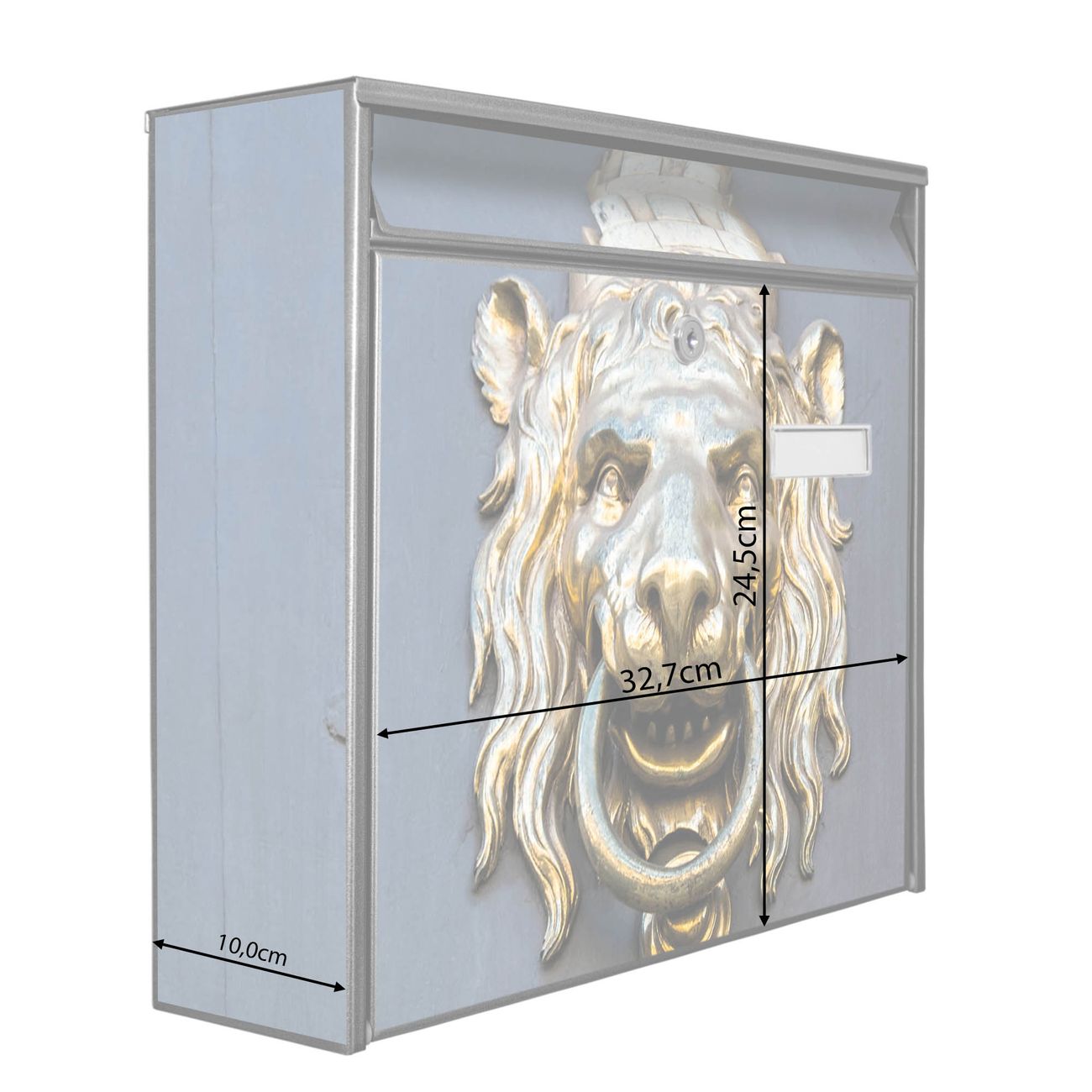 Der Burg Wächter Mail Briefkasten mit Motiv Türklopfer Löwe bietet Ihnen mit seinem Fassungsvermögen genügend Platz auch für große A4 Sendungen. Auf Wunsch können Sie bei uns den passenden Standfuß kaufen und so aus dem Wandbriefkasten einen Standbriefkasten machen. Wir bieten Ihnen ebenfalls Namensschilder, bereits beschriftet oder frei zu beschriften, und verschiedene selbst gestaltete Bitte-Keine-Werbung-Aufkleber.