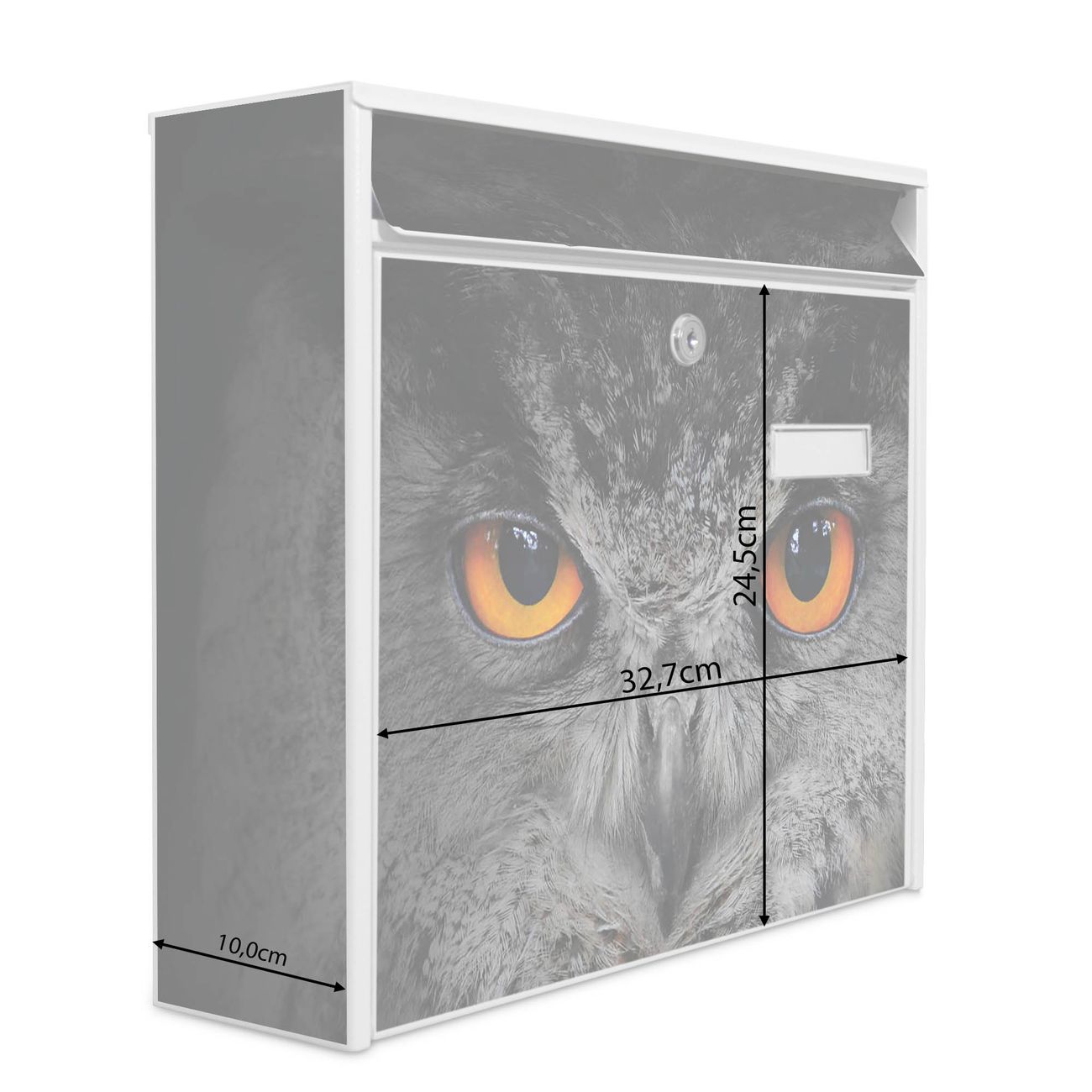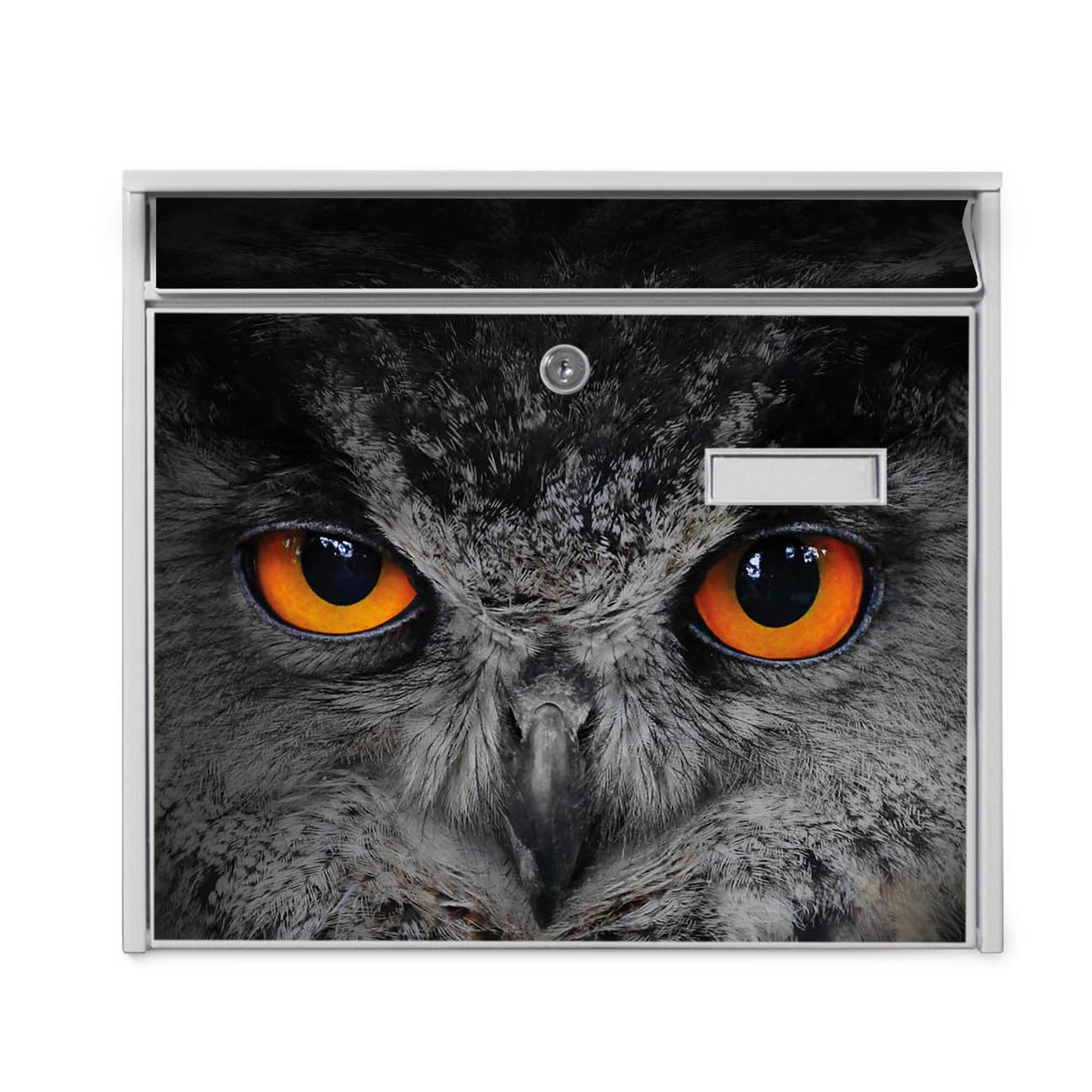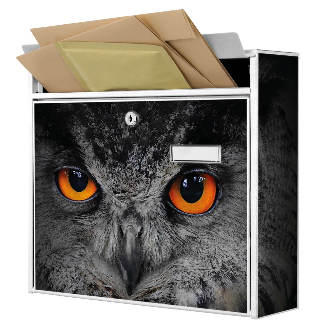 Der Burg Wächter Mail Briefkasten mit Motiv Uhu bietet Ihnen mit seinem Fassungsvermögen genügend Platz auch für große A4 Sendungen. Auf Wunsch können Sie bei uns den passenden Standfuß kaufen und so aus dem Wandbriefkasten einen Standbriefkasten machen. Wir bieten Ihnen ebenfalls Namensschilder, bereits beschriftet oder frei zu beschriften, und verschiedene selbst gestaltete Bitte-Keine-Werbung-Aufkleber.