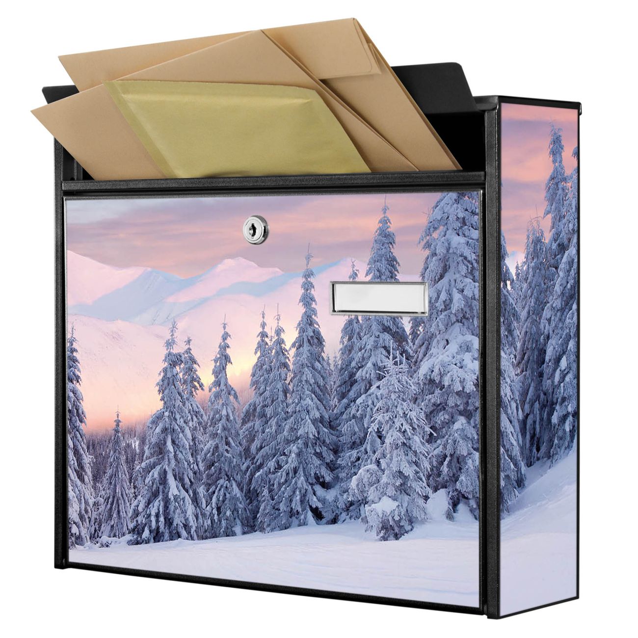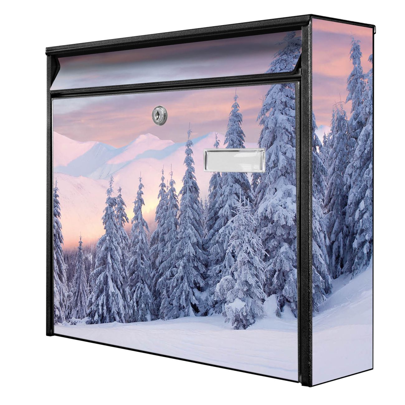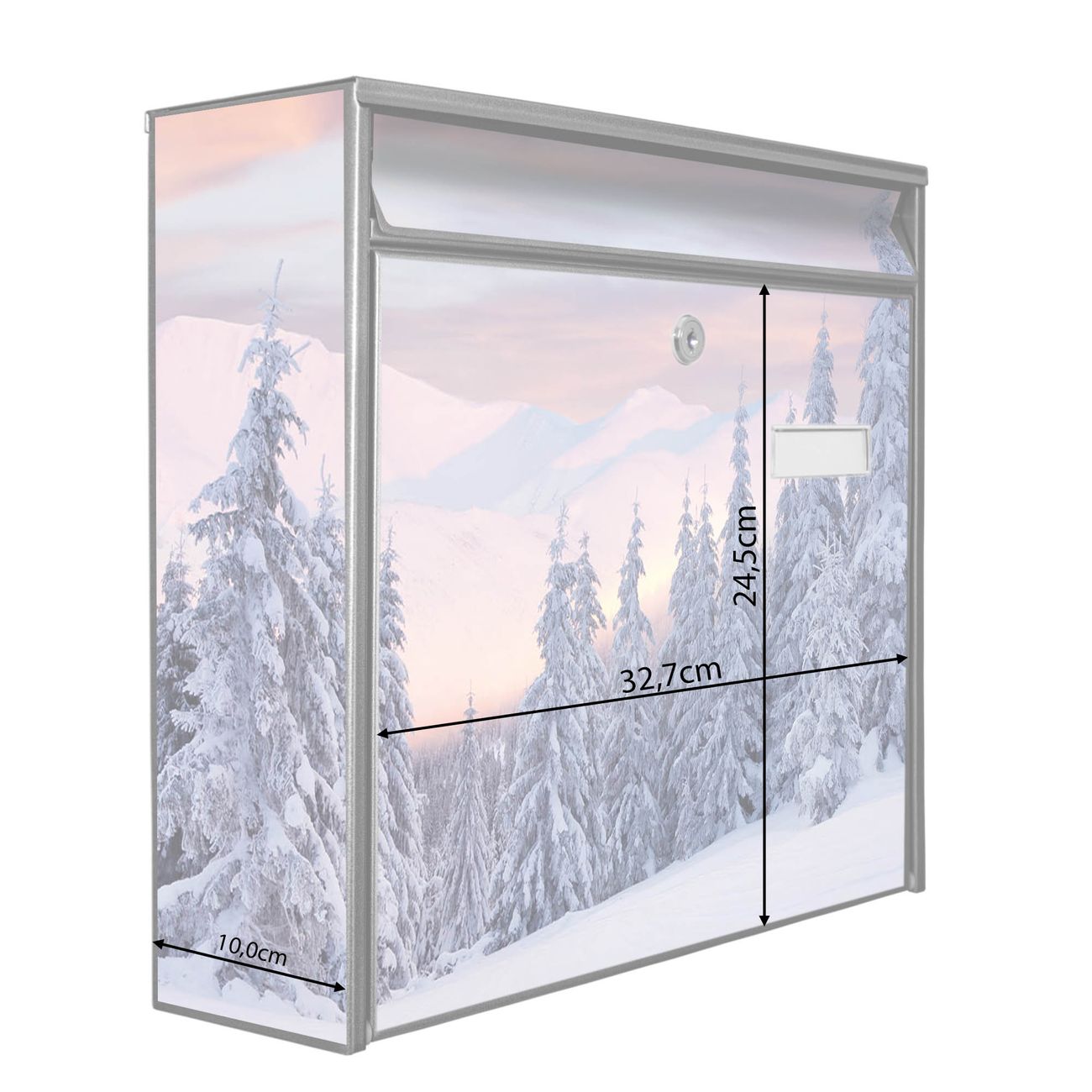 Der Burg Wächter Mail Briefkasten mit Motiv Verschneite Berge bietet Ihnen mit seinem Fassungsvermögen genügend Platz auch für große A4 Sendungen. Auf Wunsch können Sie bei uns den passenden Standfuß kaufen und so aus dem Wandbriefkasten einen Standbriefkasten machen. Wir bieten Ihnen ebenfalls Namensschilder, bereits beschriftet oder frei zu beschriften, und verschiedene selbst gestaltete Bitte-Keine-Werbung-Aufkleber.