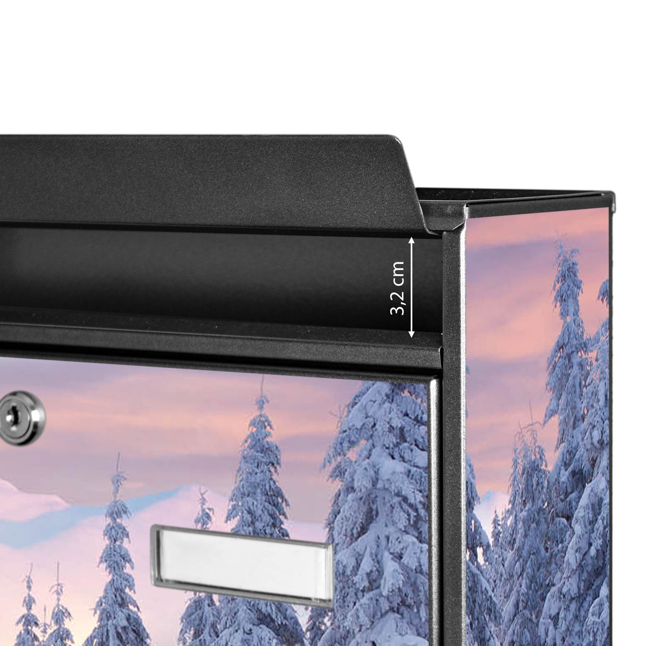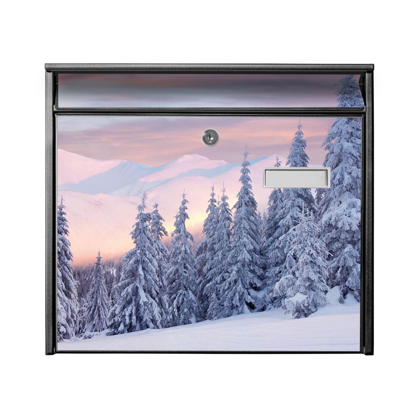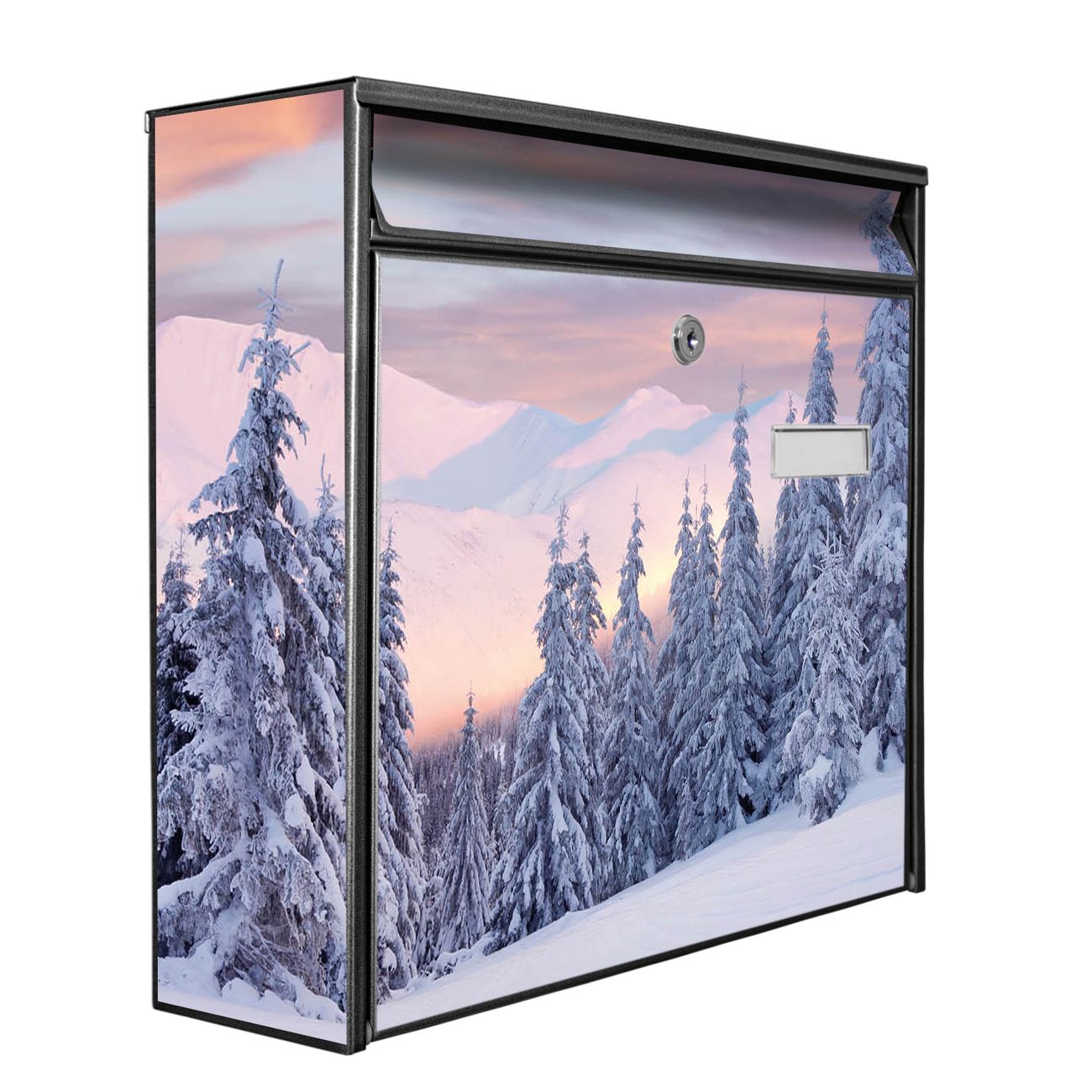 Der Burg Wächter Mail Briefkasten mit Motiv Verschneite Berge bietet Ihnen mit seinem Fassungsvermögen genügend Platz auch für große A4 Sendungen. Auf Wunsch können Sie bei uns den passenden Standfuß kaufen und so aus dem Wandbriefkasten einen Standbriefkasten machen. Wir bieten Ihnen ebenfalls Namensschilder, bereits beschriftet oder frei zu beschriften, und verschiedene selbst gestaltete Bitte-Keine-Werbung-Aufkleber.