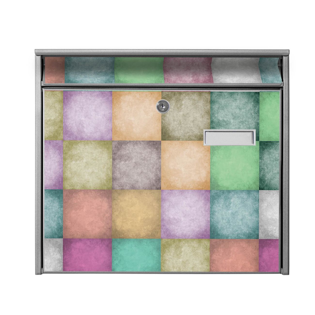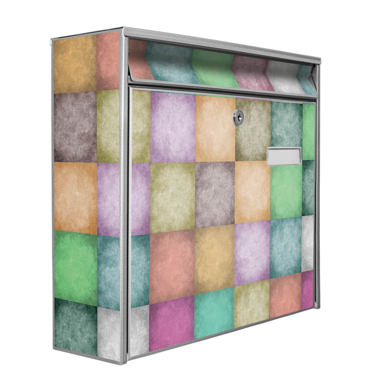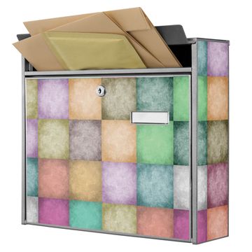 Der Postkasten mit Motiv Verwaschene Quadrate hat ein sehr ansprechendes und zeitloses Design. Heben Sie Sich von der tristen grauen Masse ab, ohne auf Funktionalität zu verzichten. Die weite Öffnung ohne scharfe Kanten ermöglicht eine einfache Handhabung beim Entnehmen der Post. Die Größe bietet genügend Platz für Sendungen aller Art, der Einwurf fasst auch größere A4 Sendungen. Ihr Burg-Wächter Motivbriefkasten wird in Sachsen in einer kleinen Manufaktur von Hand veredelt. Die Motivfolie ist lösungsmittelfrei und schutzlaminiert, dies sorgt für einen langen Halt. Wir legen großen Wert auf die Verbindung von Funktionalität und Design.