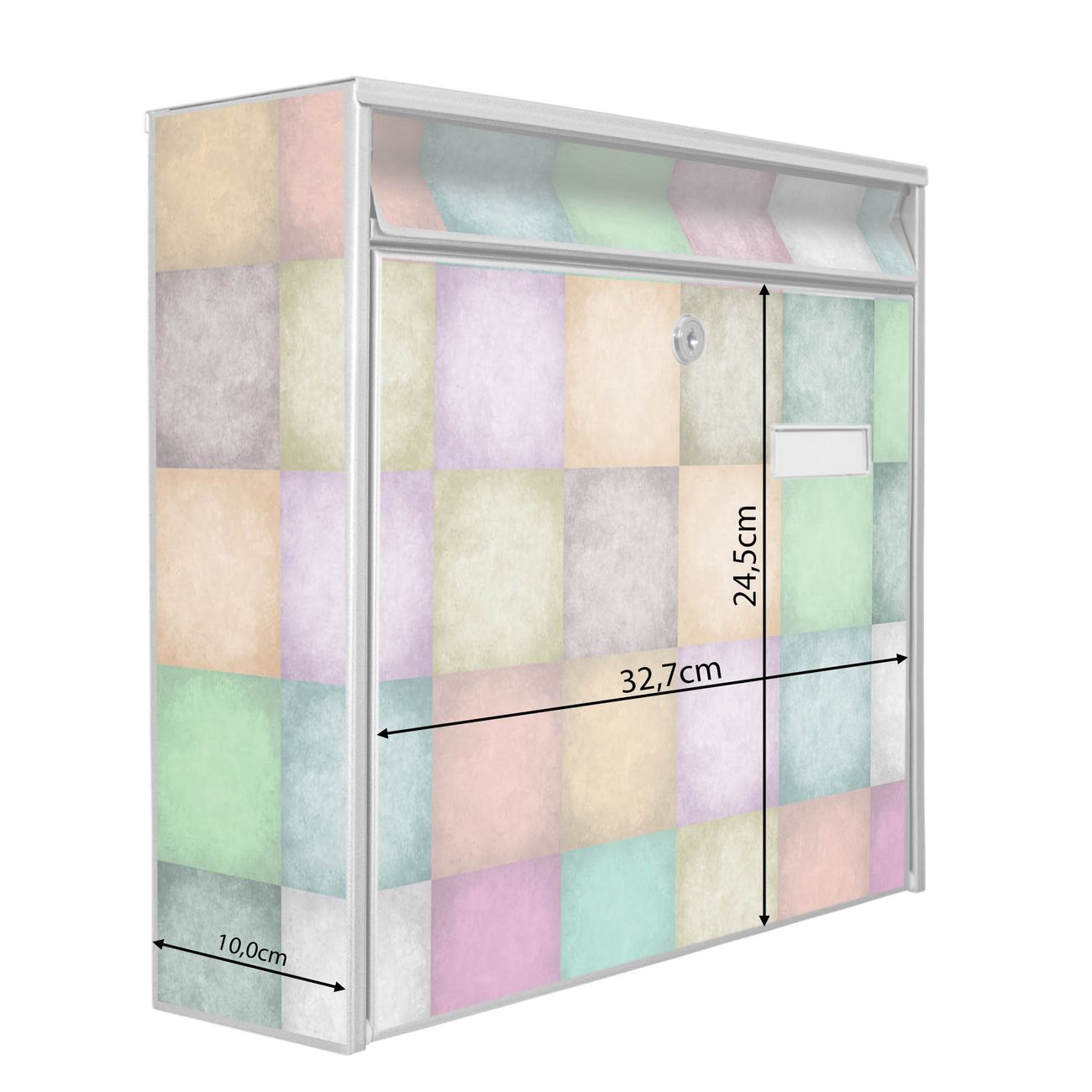Der Burg Wächter Mail Briefkasten mit Motiv Verwaschene Quadrate bietet Ihnen mit seinem Fassungsvermögen genügend Platz auch für große A4 Sendungen. Auf Wunsch können Sie bei uns den passenden Standfuß kaufen und so aus dem Wandbriefkasten einen Standbriefkasten machen. Wir bieten Ihnen ebenfalls Namensschilder, bereits beschriftet oder frei zu beschriften, und verschiedene selbst gestaltete Bitte-Keine-Werbung-Aufkleber.