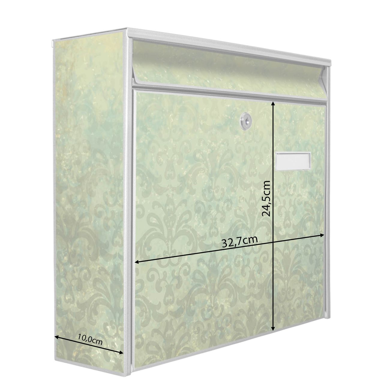 Die Größe des Briefkastens ist 36 x 32 x 10cm (BxHxT) groß. Das Motiv besteht aus einer wetter- und UV-festen Folie, die mit einem Schutzlaminat überzogen ist und Ihren Briefkasten zusätzlich vor Kratzern schützt. Sie erhalten 2 Schlüssel sowie das Montagematerial.