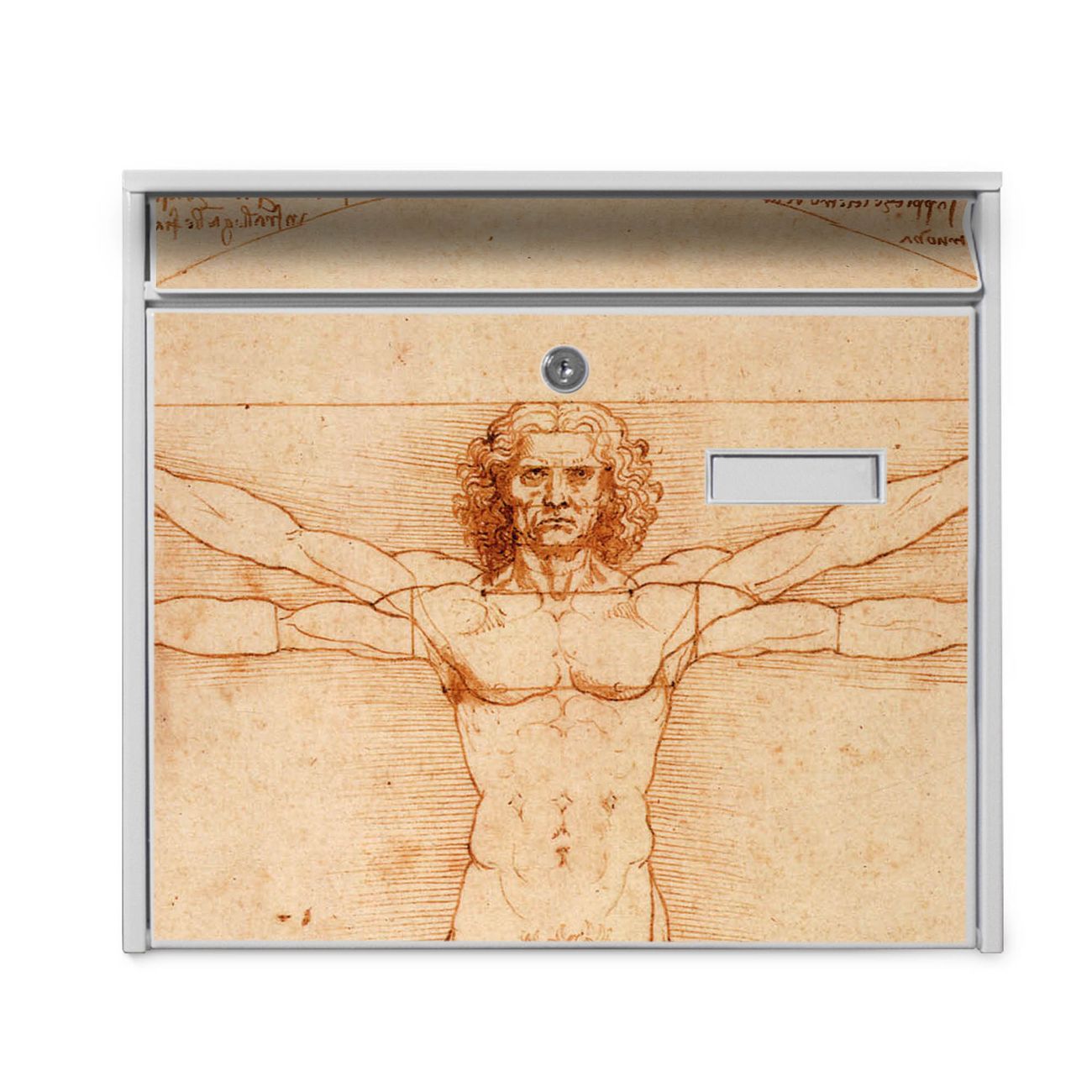 Der Burg Wächter Mail Briefkasten mit Motiv Vitruvianische Figur bietet Ihnen mit seinem Fassungsvermögen genügend Platz auch für große A4 Sendungen. Auf Wunsch können Sie bei uns den passenden Standfuß kaufen und so aus dem Wandbriefkasten einen Standbriefkasten machen. Wir bieten Ihnen ebenfalls Namensschilder, bereits beschriftet oder frei zu beschriften, und verschiedene selbst gestaltete Bitte-Keine-Werbung-Aufkleber.