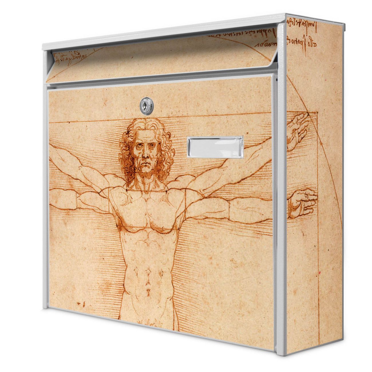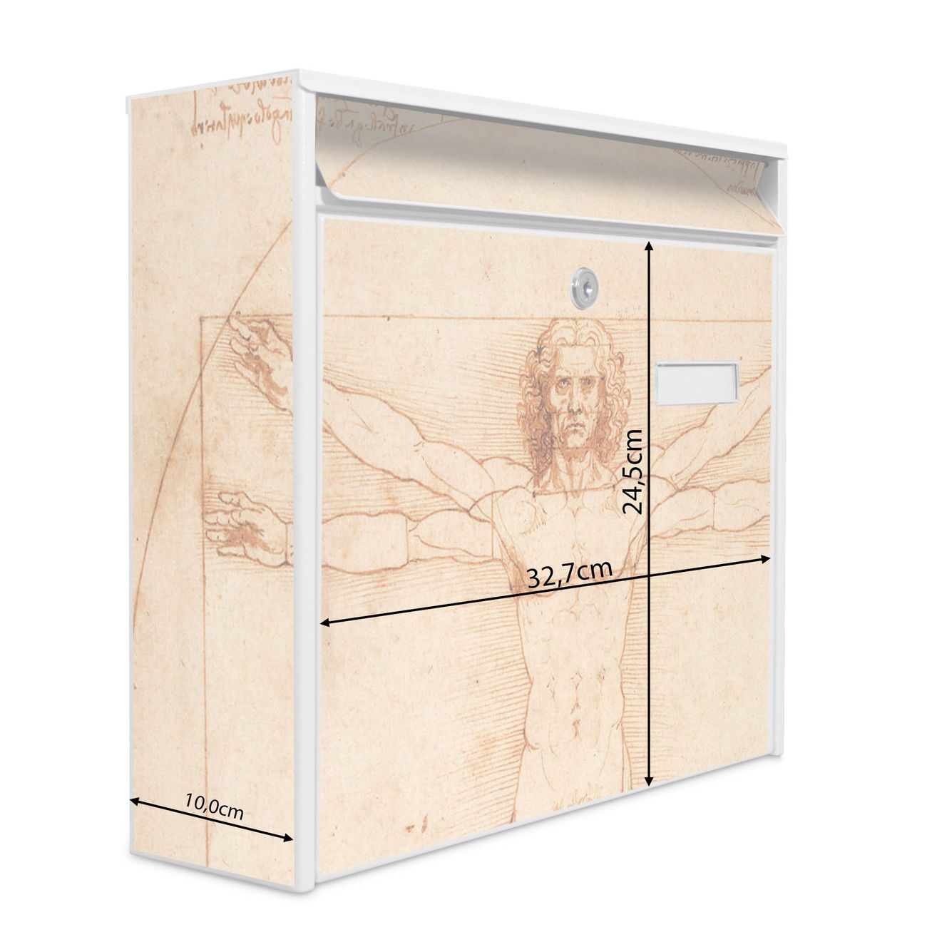 Der Postkasten mit Motiv Vitruvianische Figur hat ein sehr ansprechendes und zeitloses Design. Heben Sie Sich von der tristen grauen Masse ab, ohne auf Funktionalität zu verzichten. Die weite Öffnung ohne scharfe Kanten ermöglicht eine einfache Handhabung beim Entnehmen der Post. Die Größe bietet genügend Platz für Sendungen aller Art, der Einwurf fasst auch größere A4 Sendungen. Ihr Burg-Wächter Motivbriefkasten wird in Sachsen in einer kleinen Manufaktur von Hand veredelt. Die Motivfolie ist lösungsmittelfrei und schutzlaminiert, dies sorgt für einen langen Halt. Wir legen großen Wert auf die Verbindung von Funktionalität und Design.