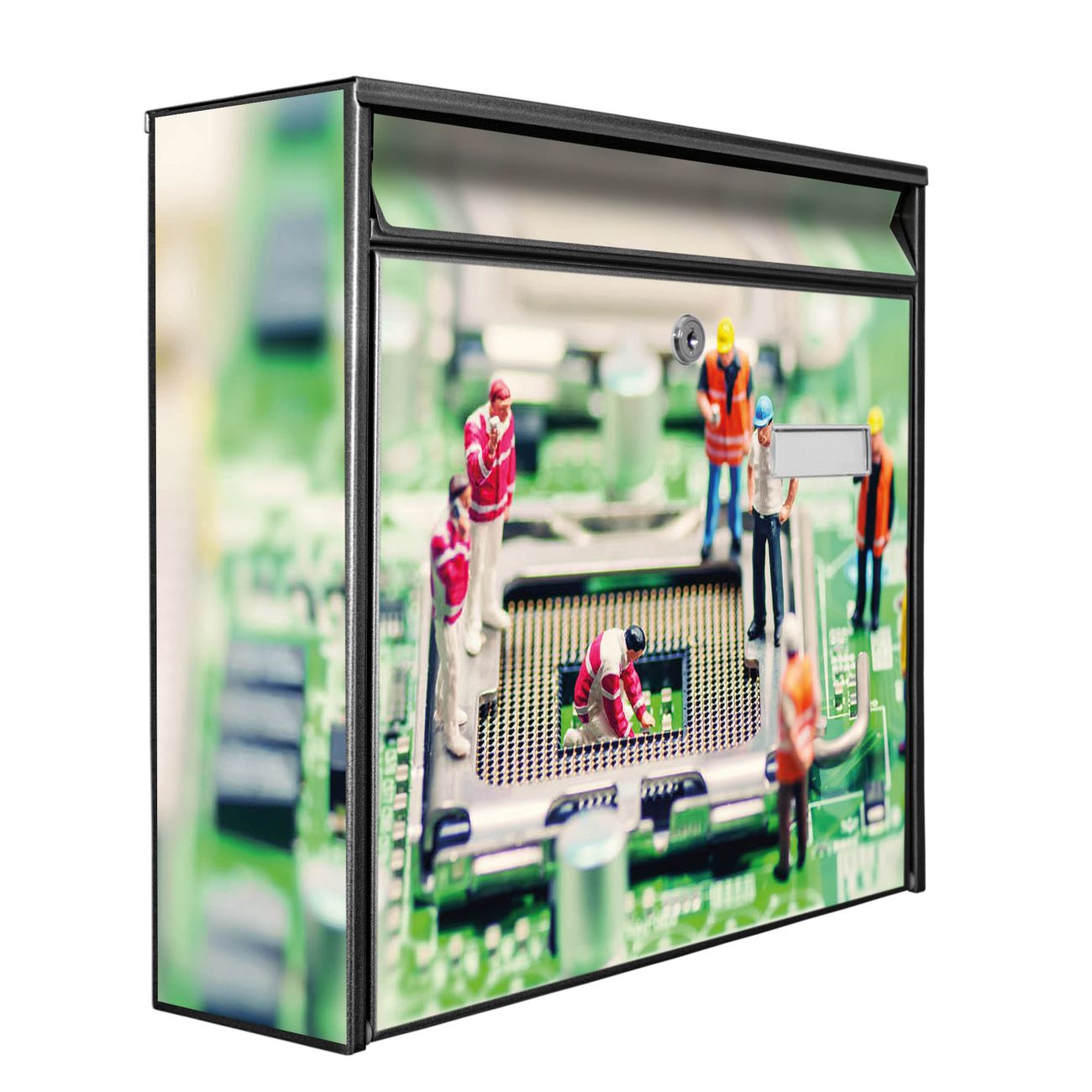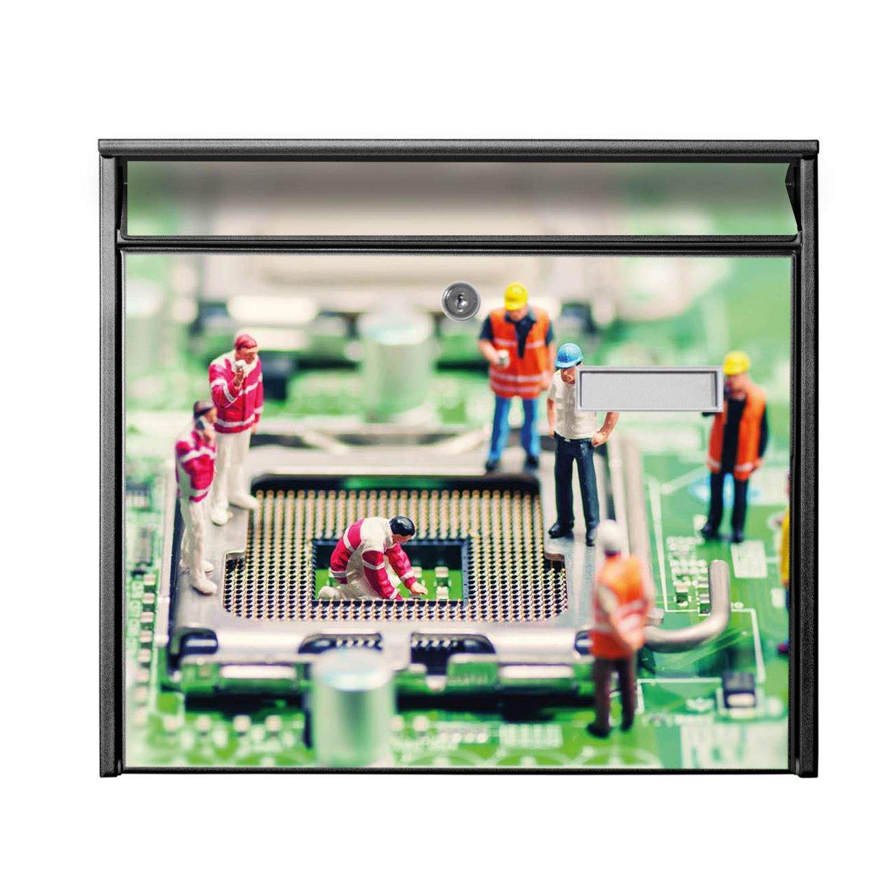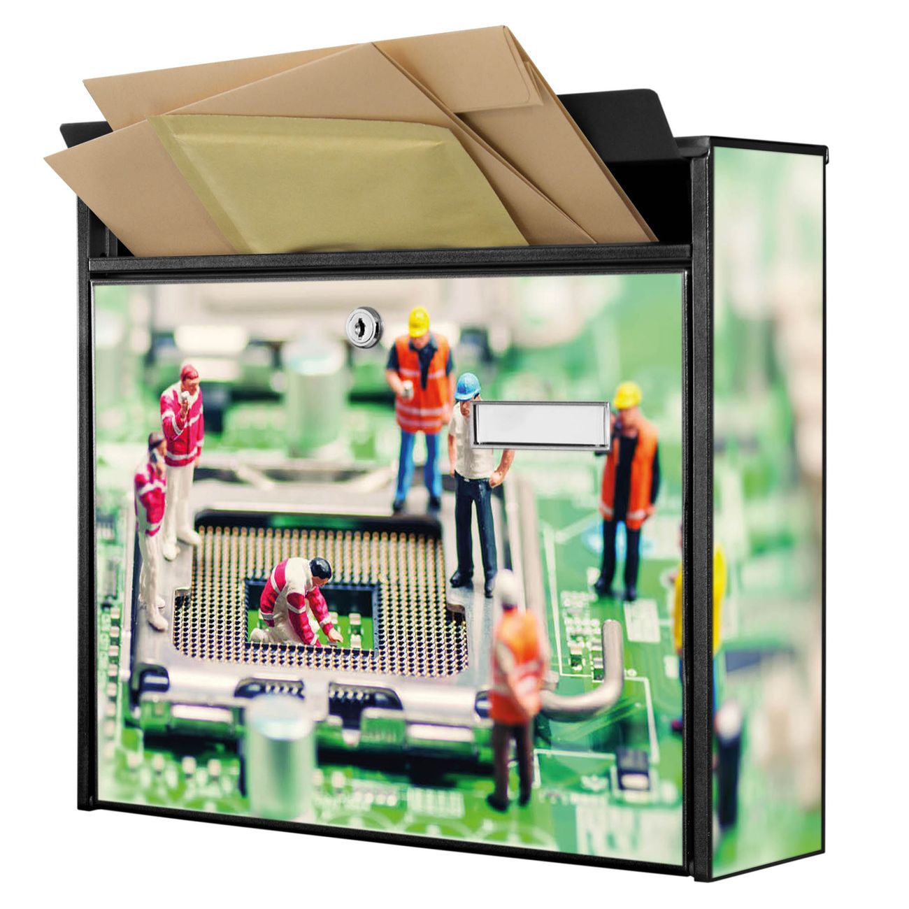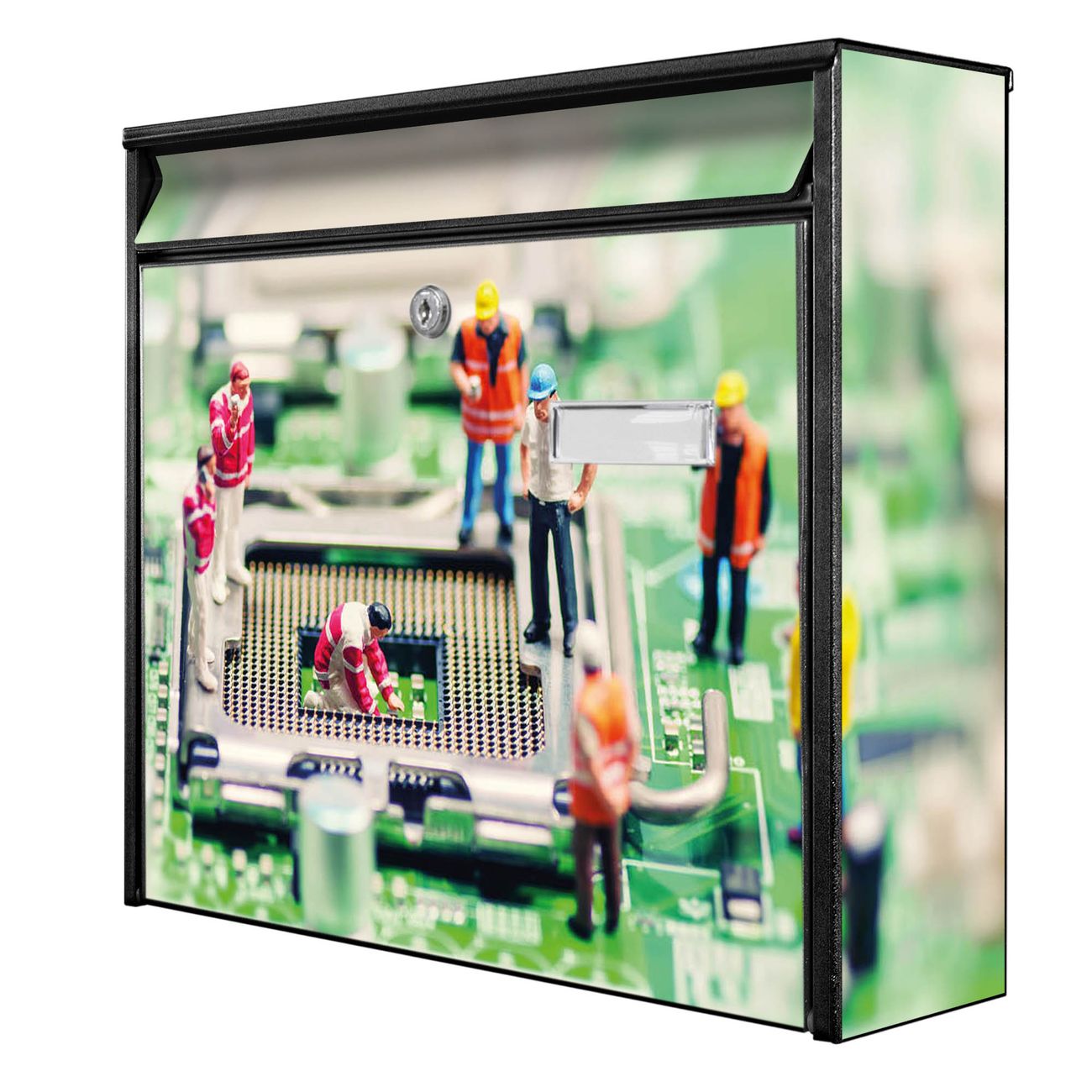 Der Postkasten mit Motiv Wartungsarbeiten hat ein sehr ansprechendes und zeitloses Design. Heben Sie Sich von der tristen grauen Masse ab, ohne auf Funktionalität zu verzichten. Die weite Öffnung ohne scharfe Kanten ermöglicht eine einfache Handhabung beim Entnehmen der Post. Die Größe bietet genügend Platz für Sendungen aller Art, der Einwurf fasst auch größere A4 Sendungen. Ihr Burg-Wächter Motivbriefkasten wird in Sachsen in einer kleinen Manufaktur von Hand veredelt. Die Motivfolie ist lösungsmittelfrei und schutzlaminiert, dies sorgt für einen langen Halt. Wir legen großen Wert auf die Verbindung von Funktionalität und Design.