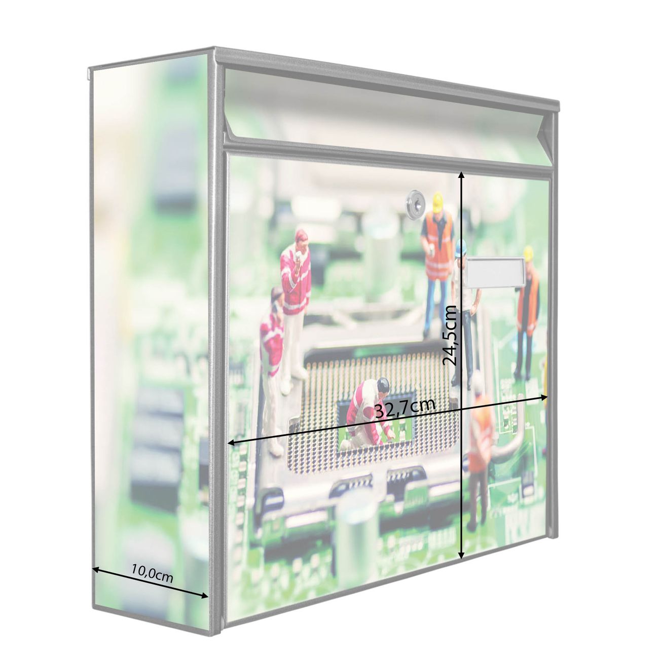 Die Größe des Briefkastens ist 36 x 32 x 10cm (BxHxT) groß. Das Motiv besteht aus einer wetter- und UV-festen Folie, die mit einem Schutzlaminat überzogen ist und Ihren Briefkasten zusätzlich vor Kratzern schützt. Sie erhalten 2 Schlüssel sowie das Montagematerial.