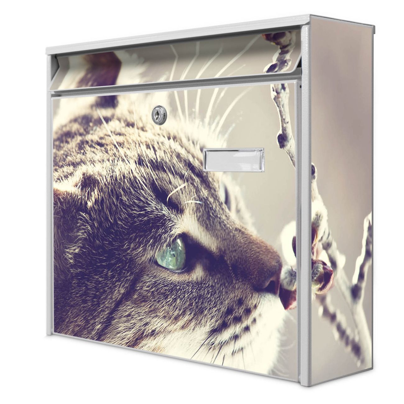 Der Burg Wächter Mail Briefkasten mit Motiv Weidenkätzchen bietet Ihnen mit seinem Fassungsvermögen genügend Platz auch für große A4 Sendungen. Auf Wunsch können Sie bei uns den passenden Standfuß kaufen und so aus dem Wandbriefkasten einen Standbriefkasten machen. Wir bieten Ihnen ebenfalls Namensschilder, bereits beschriftet oder frei zu beschriften, und verschiedene selbst gestaltete Bitte-Keine-Werbung-Aufkleber.