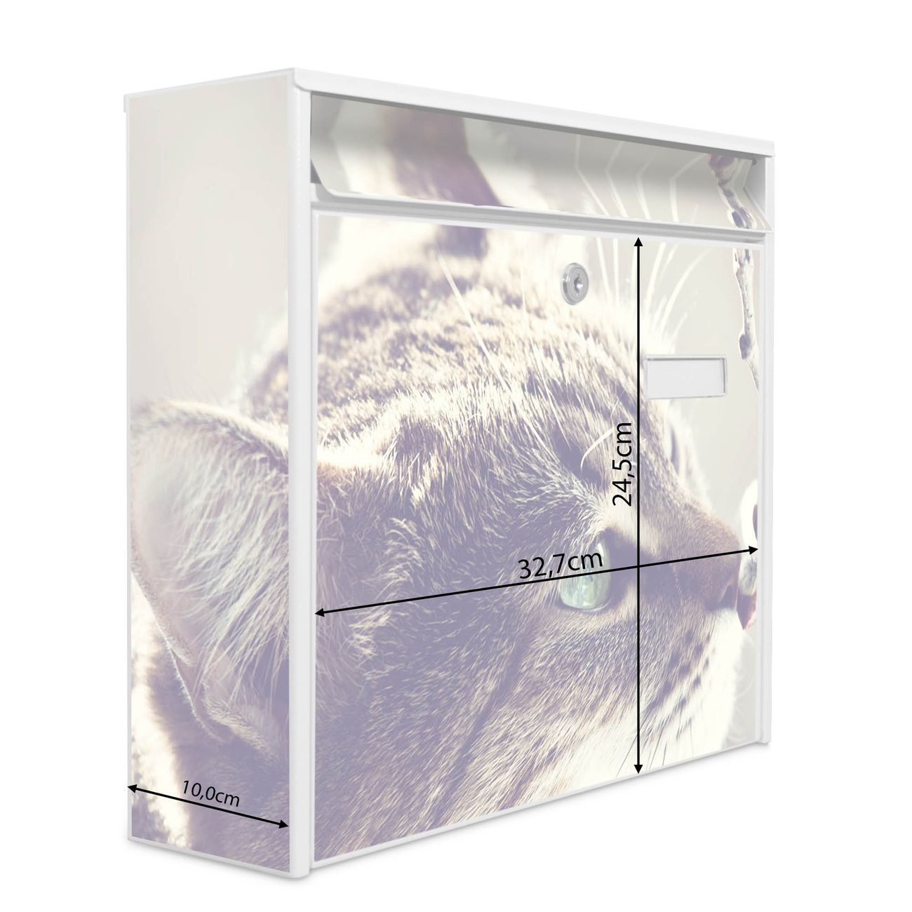 Die Größe des Briefkastens ist 36 x 32 x 10cm (BxHxT) groß. Das Motiv besteht aus einer wetter- und UV-festen Folie, die mit einem Schutzlaminat überzogen ist und Ihren Briefkasten zusätzlich vor Kratzern schützt. Sie erhalten 2 Schlüssel sowie das Montagematerial.