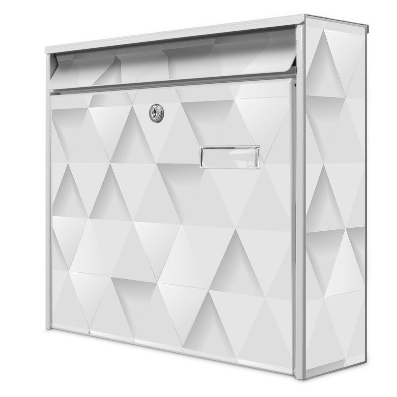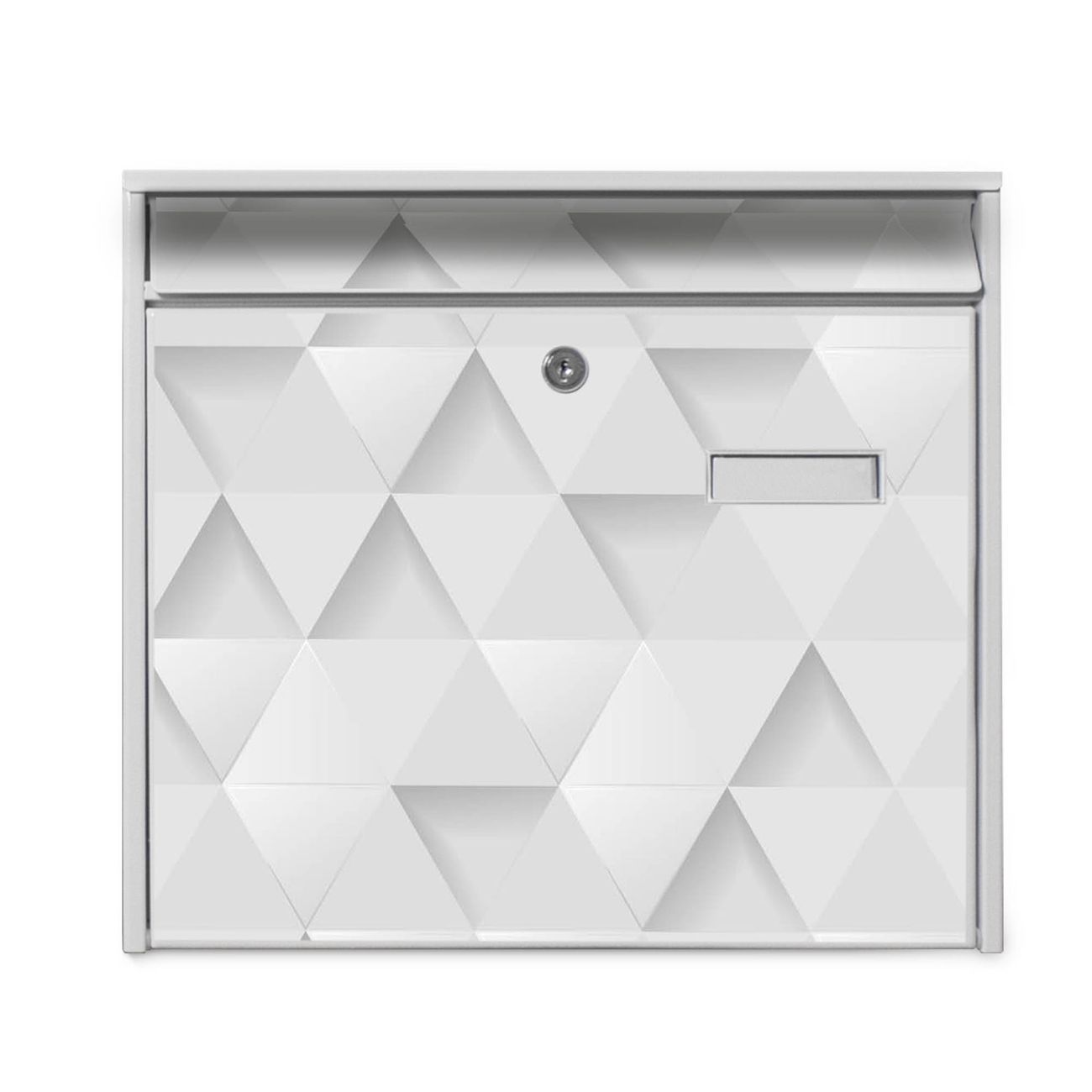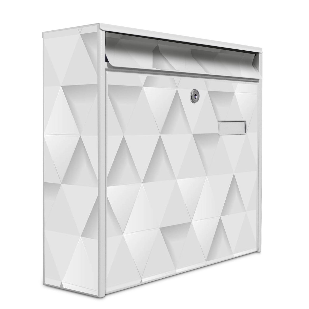 Der Postkasten mit Motiv Weisse Dreiecke hat ein sehr ansprechendes und zeitloses Design. Heben Sie Sich von der tristen grauen Masse ab, ohne auf Funktionalität zu verzichten. Die weite Öffnung ohne scharfe Kanten ermöglicht eine einfache Handhabung beim Entnehmen der Post. Die Größe bietet genügend Platz für Sendungen aller Art, der Einwurf fasst auch größere A4 Sendungen. Ihr Burg-Wächter Motivbriefkasten wird in Sachsen in einer kleinen Manufaktur von Hand veredelt. Die Motivfolie ist lösungsmittelfrei und schutzlaminiert, dies sorgt für einen langen Halt. Wir legen großen Wert auf die Verbindung von Funktionalität und Design.