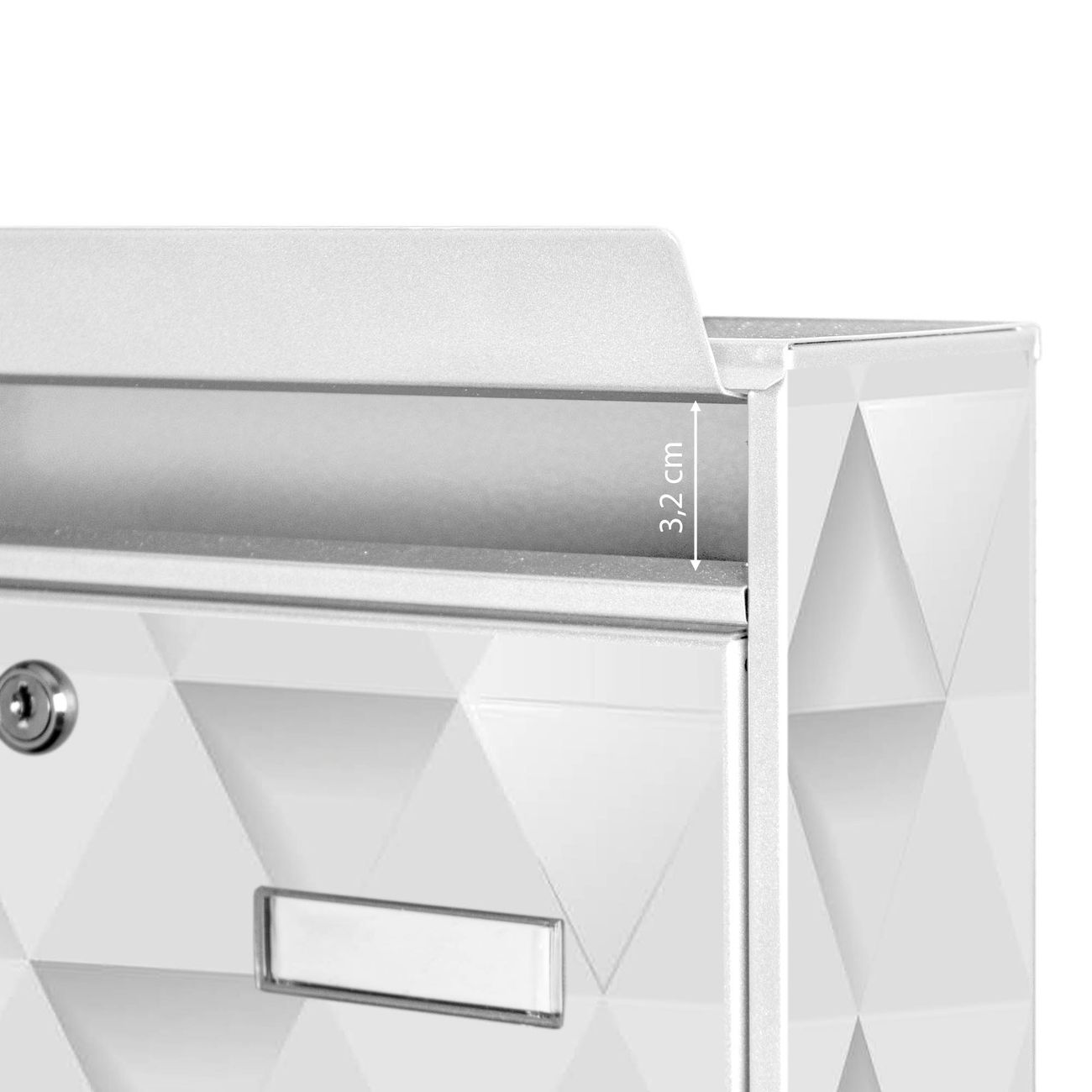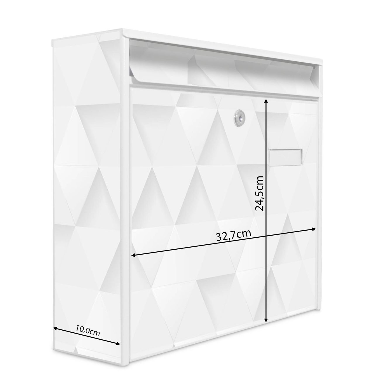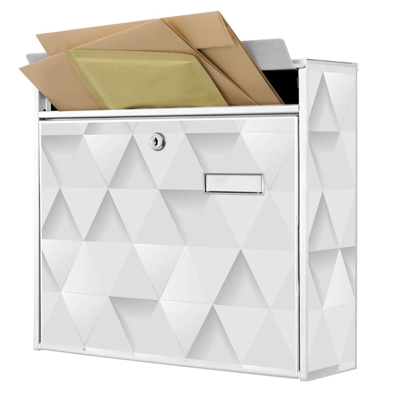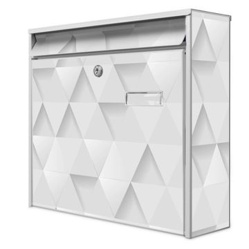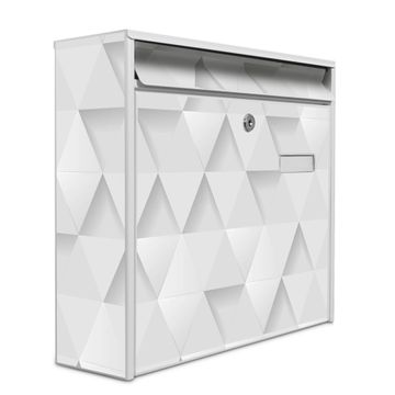 Der Burg Wächter Mail Briefkasten mit Motiv Weisse Dreiecke bietet Ihnen mit seinem Fassungsvermögen genügend Platz auch für große A4 Sendungen. Auf Wunsch können Sie bei uns den passenden Standfuß kaufen und so aus dem Wandbriefkasten einen Standbriefkasten machen. Wir bieten Ihnen ebenfalls Namensschilder, bereits beschriftet oder frei zu beschriften, und verschiedene selbst gestaltete Bitte-Keine-Werbung-Aufkleber.