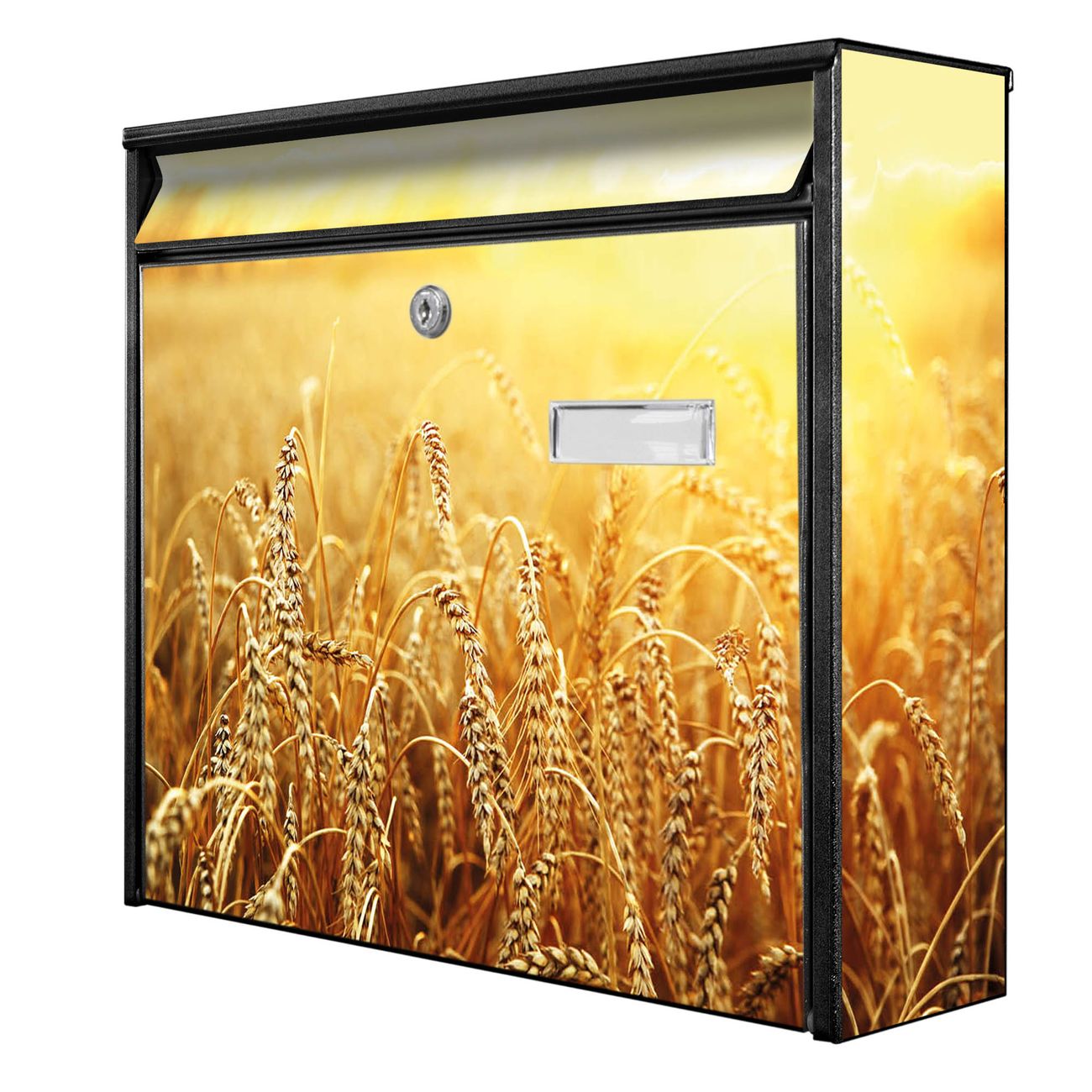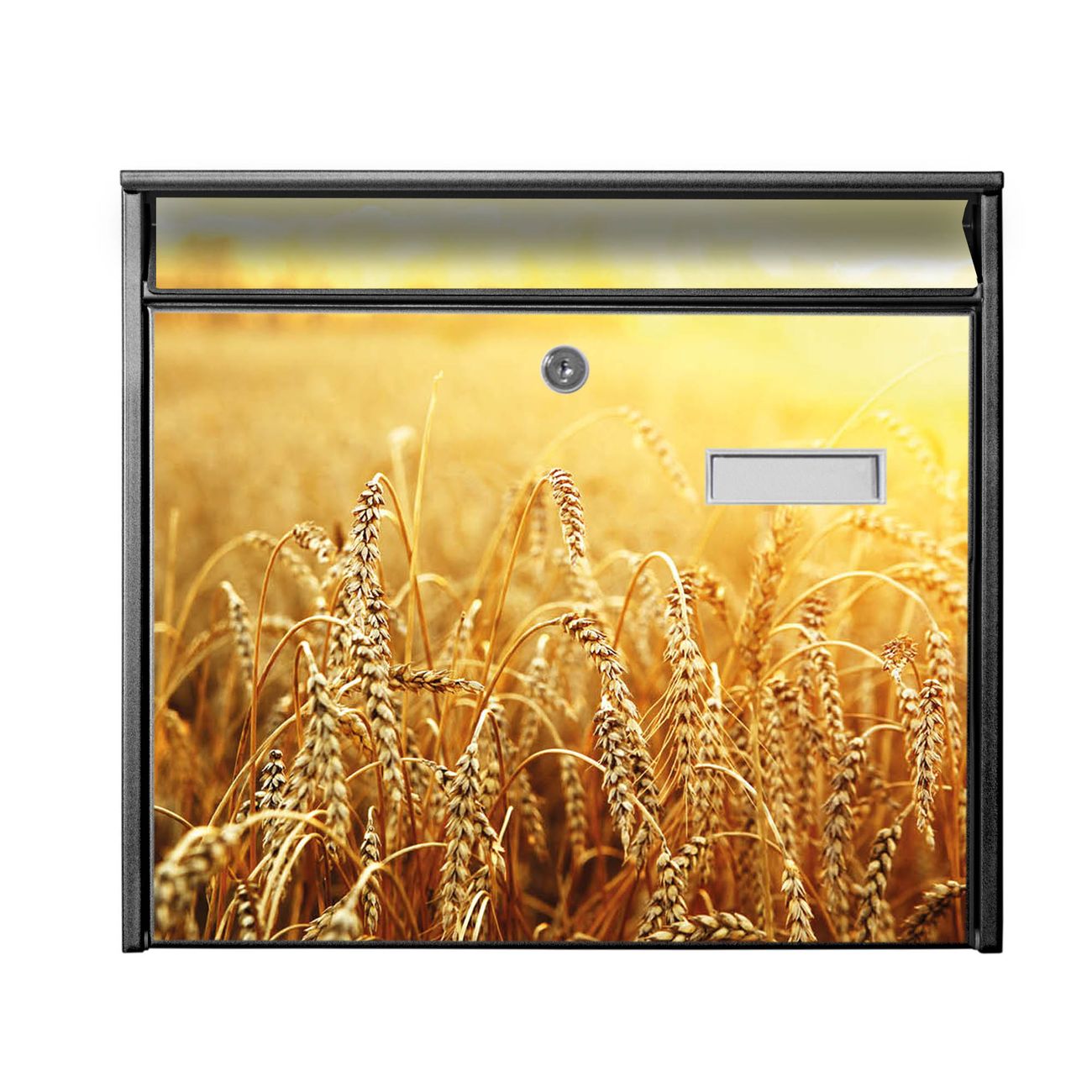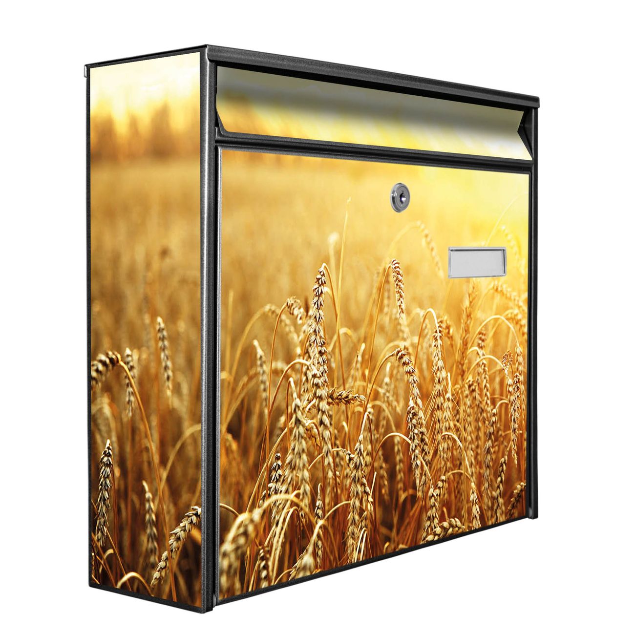 Der Postkasten mit Motiv Weizenfeld hat ein sehr ansprechendes und zeitloses Design. Heben Sie Sich von der tristen grauen Masse ab, ohne auf Funktionalität zu verzichten. Die weite Öffnung ohne scharfe Kanten ermöglicht eine einfache Handhabung beim Entnehmen der Post. Die Größe bietet genügend Platz für Sendungen aller Art, der Einwurf fasst auch größere A4 Sendungen. Ihr Burg-Wächter Motivbriefkasten wird in Sachsen in einer kleinen Manufaktur von Hand veredelt. Die Motivfolie ist lösungsmittelfrei und schutzlaminiert, dies sorgt für einen langen Halt. Wir legen großen Wert auf die Verbindung von Funktionalität und Design.