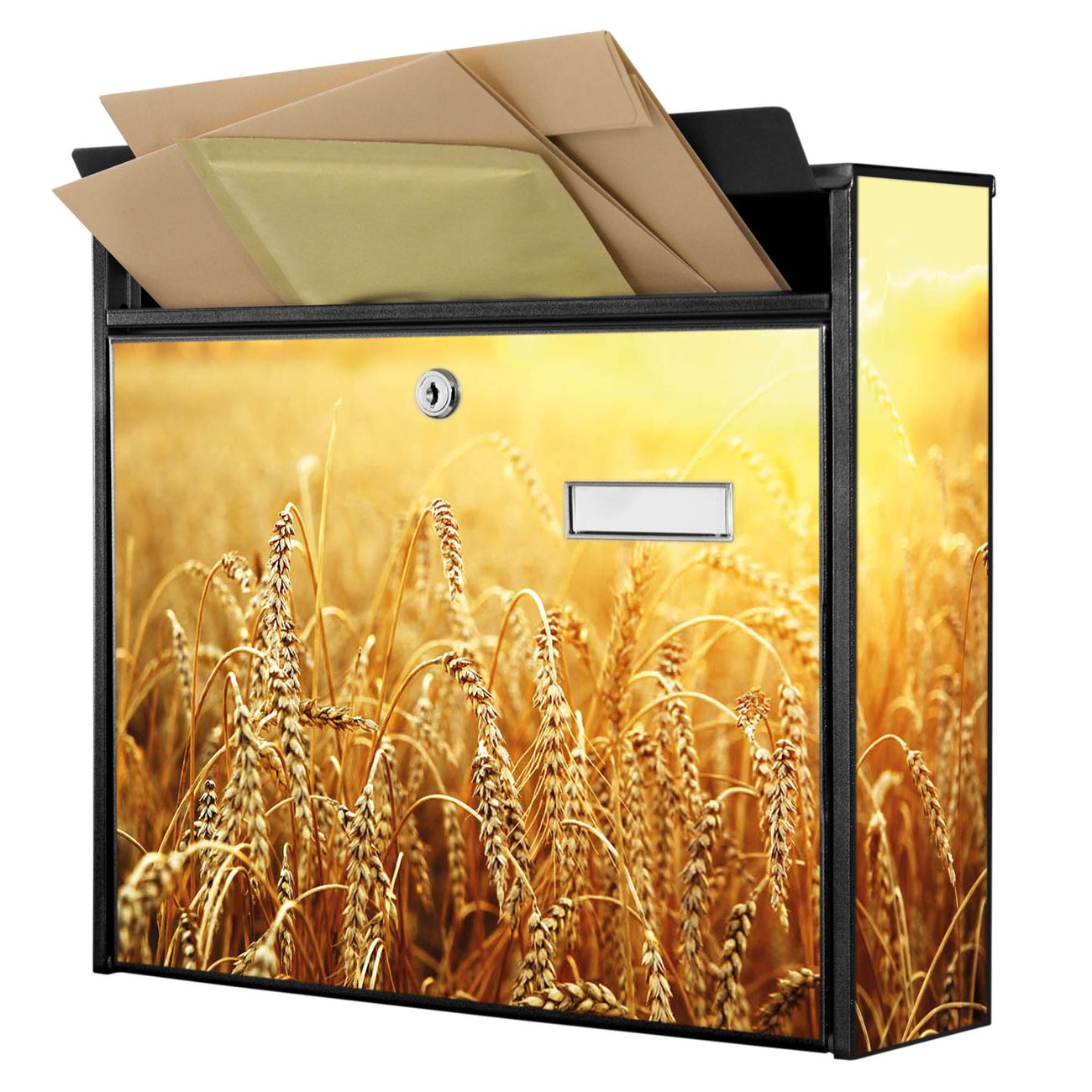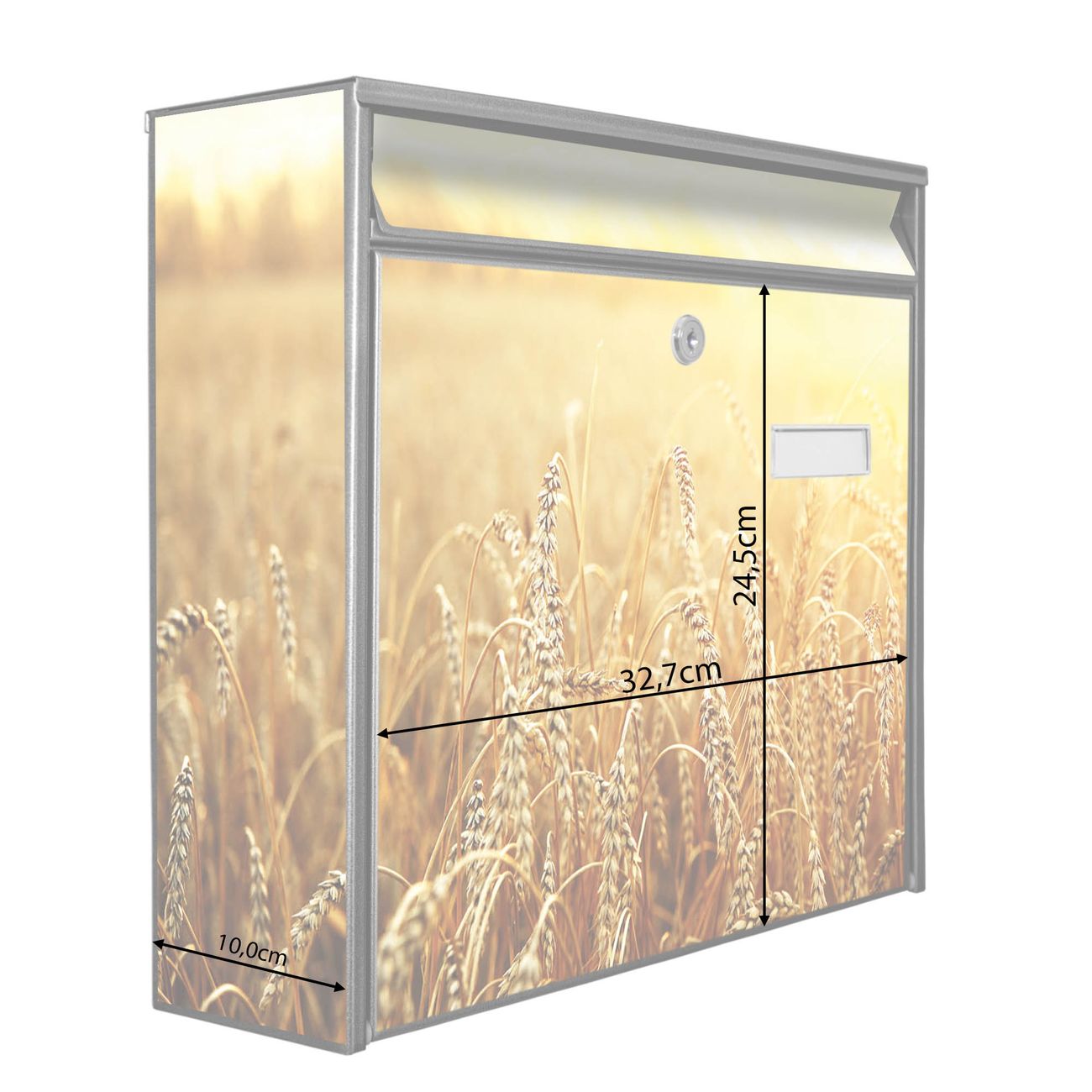 Der Burg Wächter Mail Briefkasten mit Motiv Weizenfeld bietet Ihnen mit seinem Fassungsvermögen genügend Platz auch für große A4 Sendungen. Auf Wunsch können Sie bei uns den passenden Standfuß kaufen und so aus dem Wandbriefkasten einen Standbriefkasten machen. Wir bieten Ihnen ebenfalls Namensschilder, bereits beschriftet oder frei zu beschriften, und verschiedene selbst gestaltete Bitte-Keine-Werbung-Aufkleber.