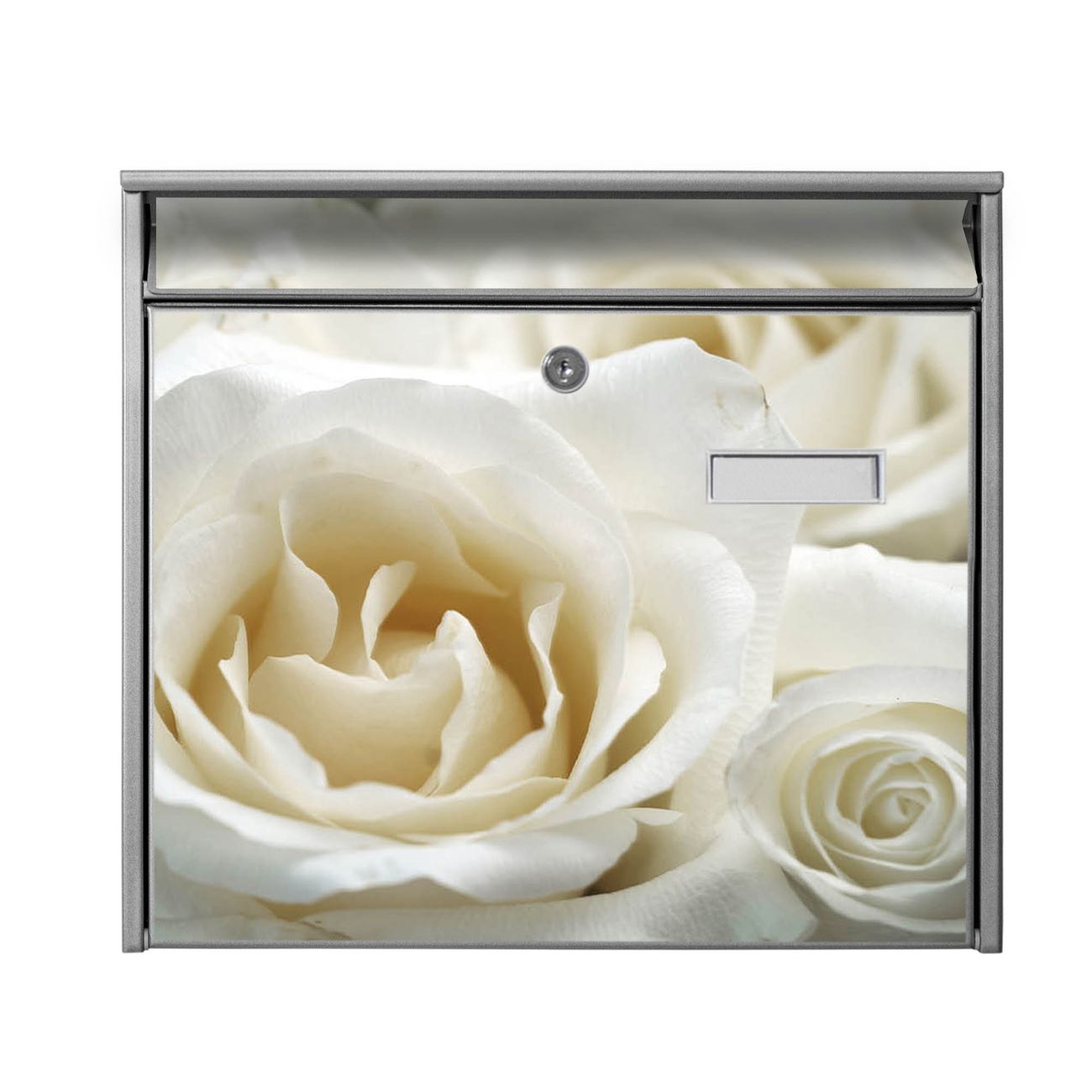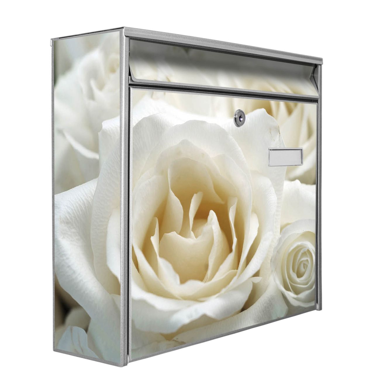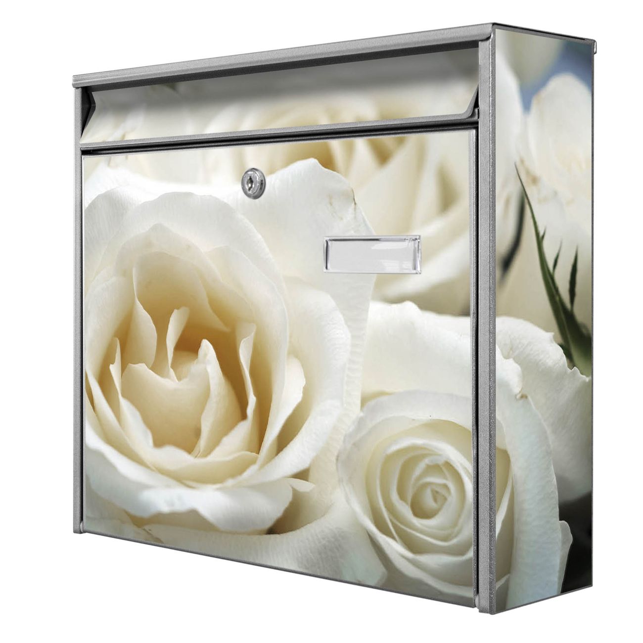 Der Burg Wächter Mail Briefkasten mit Motiv White Roses bietet Ihnen mit seinem Fassungsvermögen genügend Platz auch für große A4 Sendungen. Auf Wunsch können Sie bei uns den passenden Standfuß kaufen und so aus dem Wandbriefkasten einen Standbriefkasten machen. Wir bieten Ihnen ebenfalls Namensschilder, bereits beschriftet oder frei zu beschriften, und verschiedene selbst gestaltete Bitte-Keine-Werbung-Aufkleber.